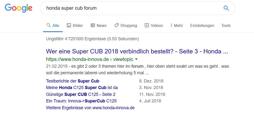 Ich habe buchstaeblich soeben in Google eingetippt" Supercub". Na ja Flugzeug Piper Cub en masse. Danach "Honda Supercub". Bei Seite 5 hab ich aufgehoert: nirgendwo war bis dahin '\unser' Forum erwaehnt. Linux-Google war eine halbe Stunde vorher geupdated, daran kann es nicht liegen.Heavendenied hat geschrieben: ↑Mo 26. Aug 2019, 20:07Wie geschrieben, für das finden des Forums bringt ne zusätzliche Domain nix