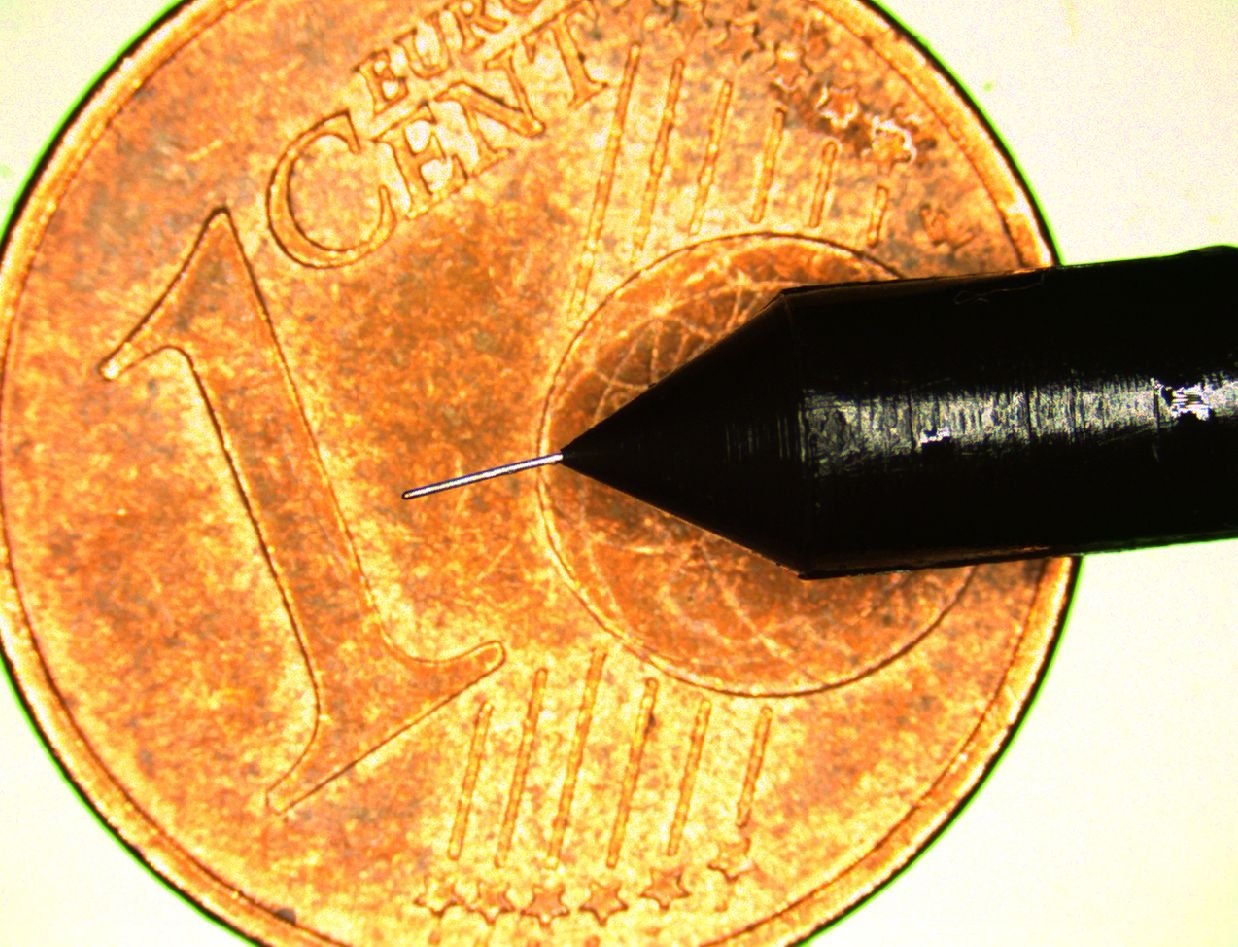 Der dünnste Tüten-Clip-Draht, den ich hier habe, hat 0,3 mm Durchmesser und keine sauber beschliffenen Enden.