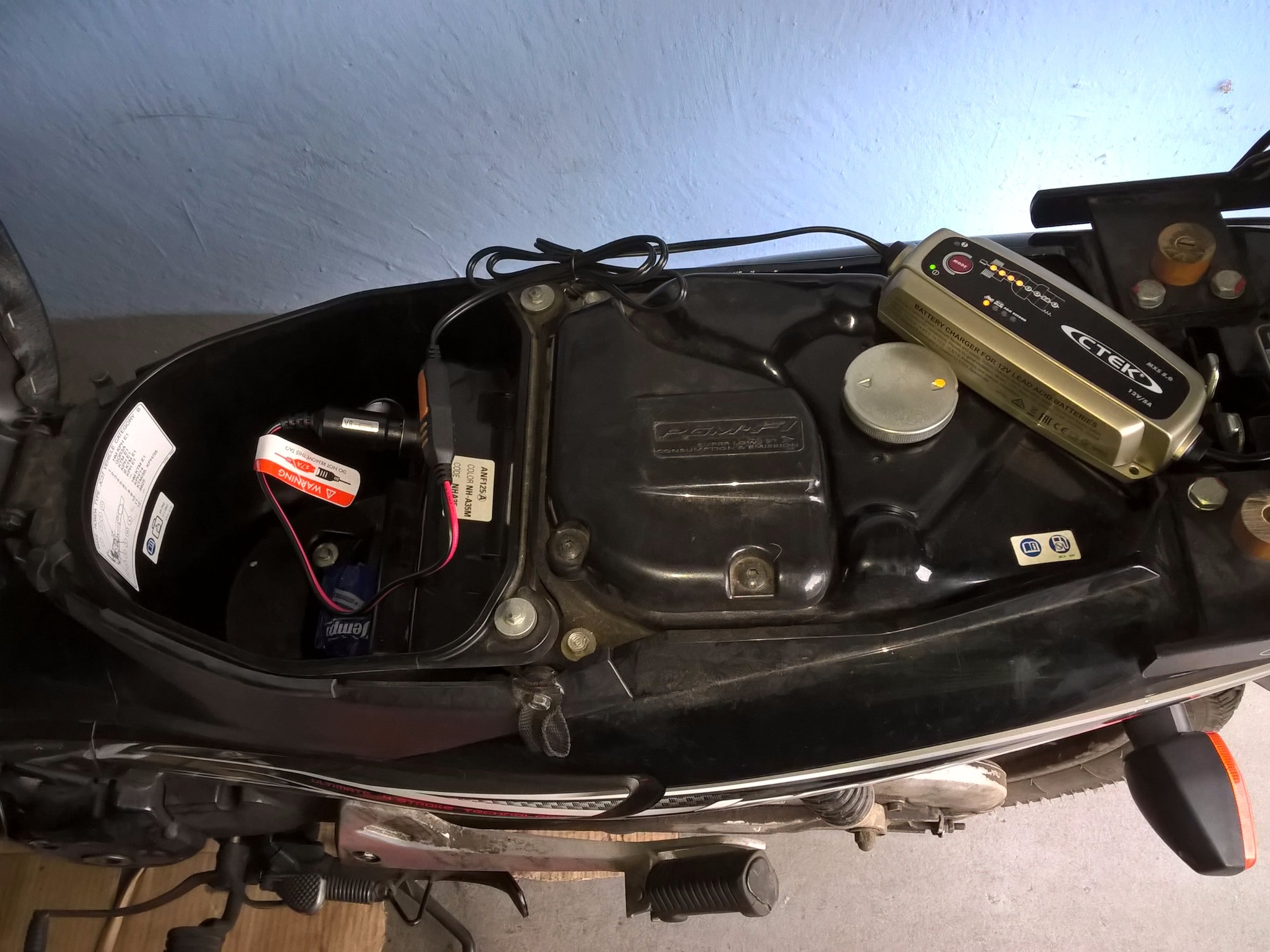 Zum fahren hatte ich Anfangs (als ich noch die alte Batterie im Vision hatte) Kabel vorne fix angeschlossen und eine "vorige" Batterie im Helmfach. So hätte ich immer selber Notstarten können. Habe letztendlich doch ne neue Batterie gekauft, nur so konnte ich sicher sein dass ich nicht plötzlich wegen Altersschwäche stehen bleibe.