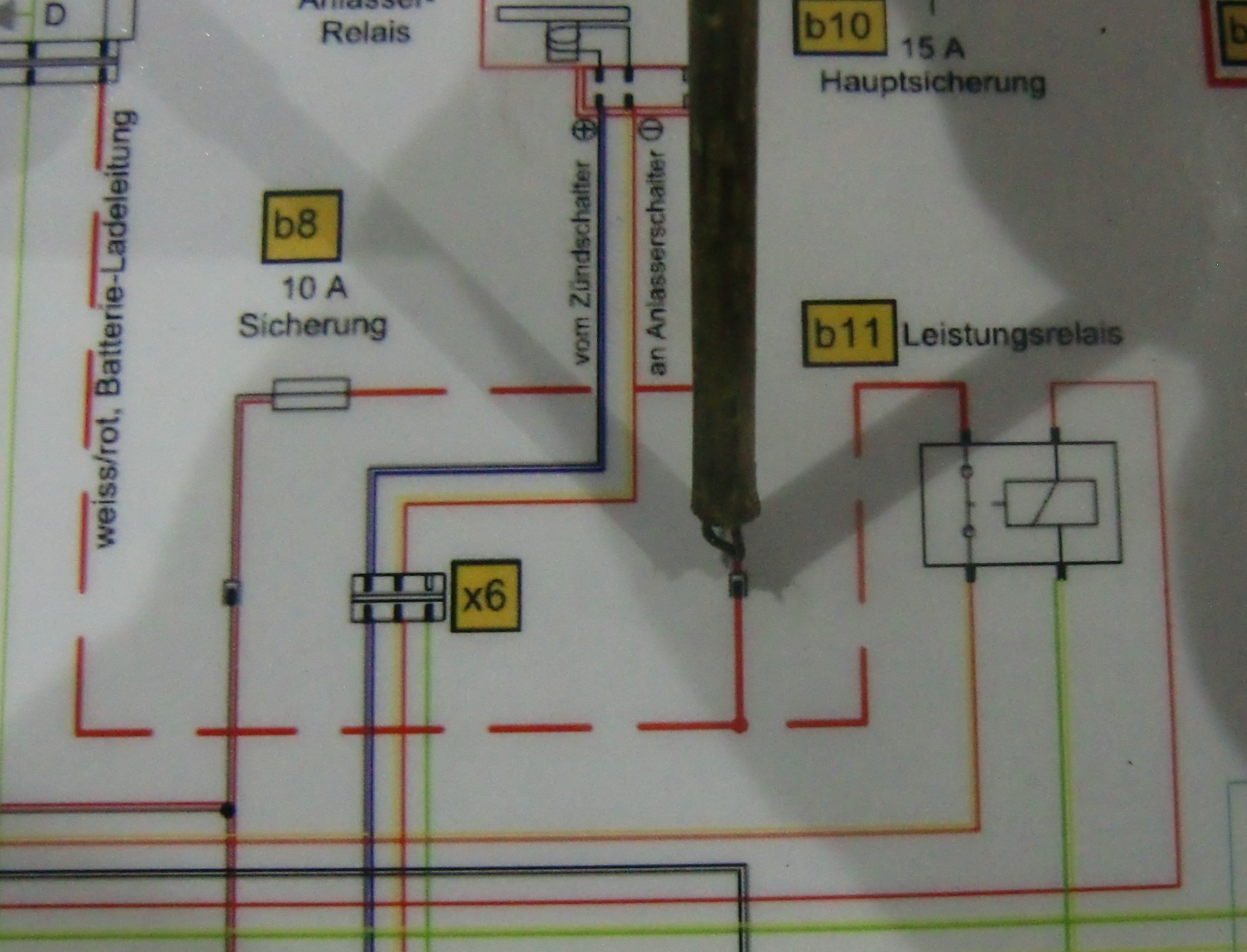 Und an genau derselben Stelle war das Kabel denn auch wieder durchgegammelt oder wegkorrodiert. Im von Harri kunstvoll einlaminierten Schaltplan, improved edition Wolfgang, lag der Fehler HIER: Damit war alles wieder gut. Die Inno trat die Rückreise wieder im Kombi an.