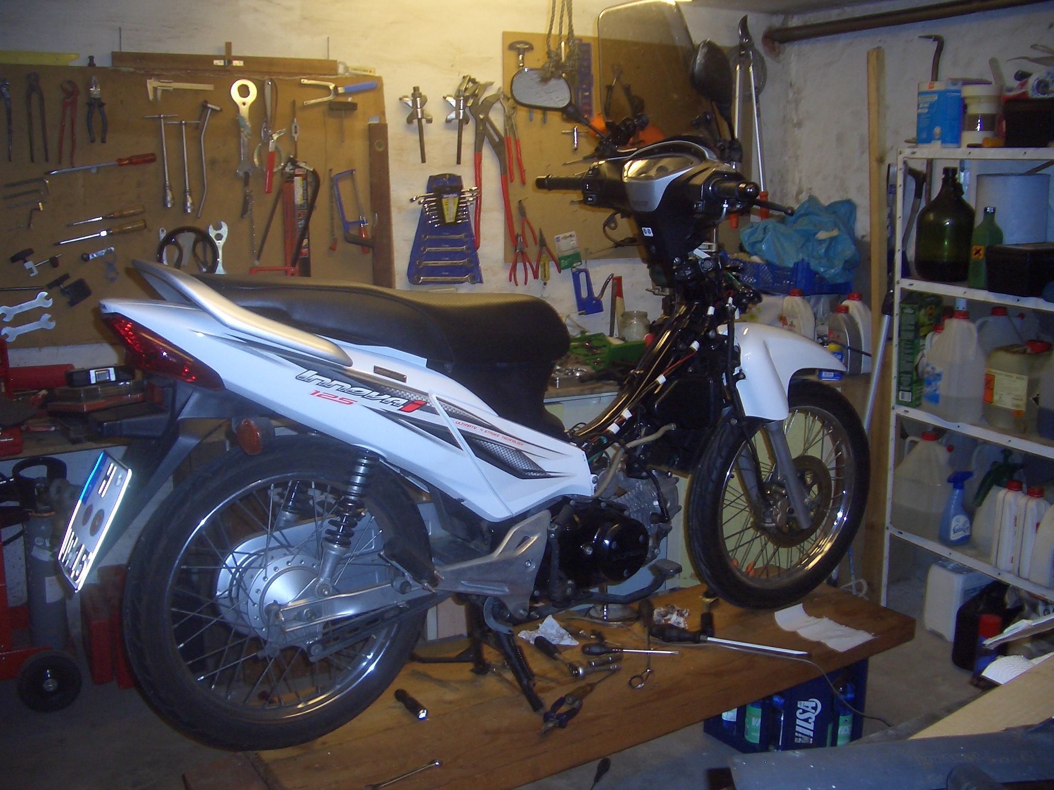 Ich stand in der Garage und dachte mangels Motorradbühne darüber nach, wie ich Rücken-/Knie-/Hüft- und was was ich -schonend die Wave mal wieder auf Winter umrüsten und die Zentrifuge reinigen kann (Mach ich aber doch lieber liegend). Da sah ich meine Wasserkisten und die dicken Leimholzplatten rumstehen.