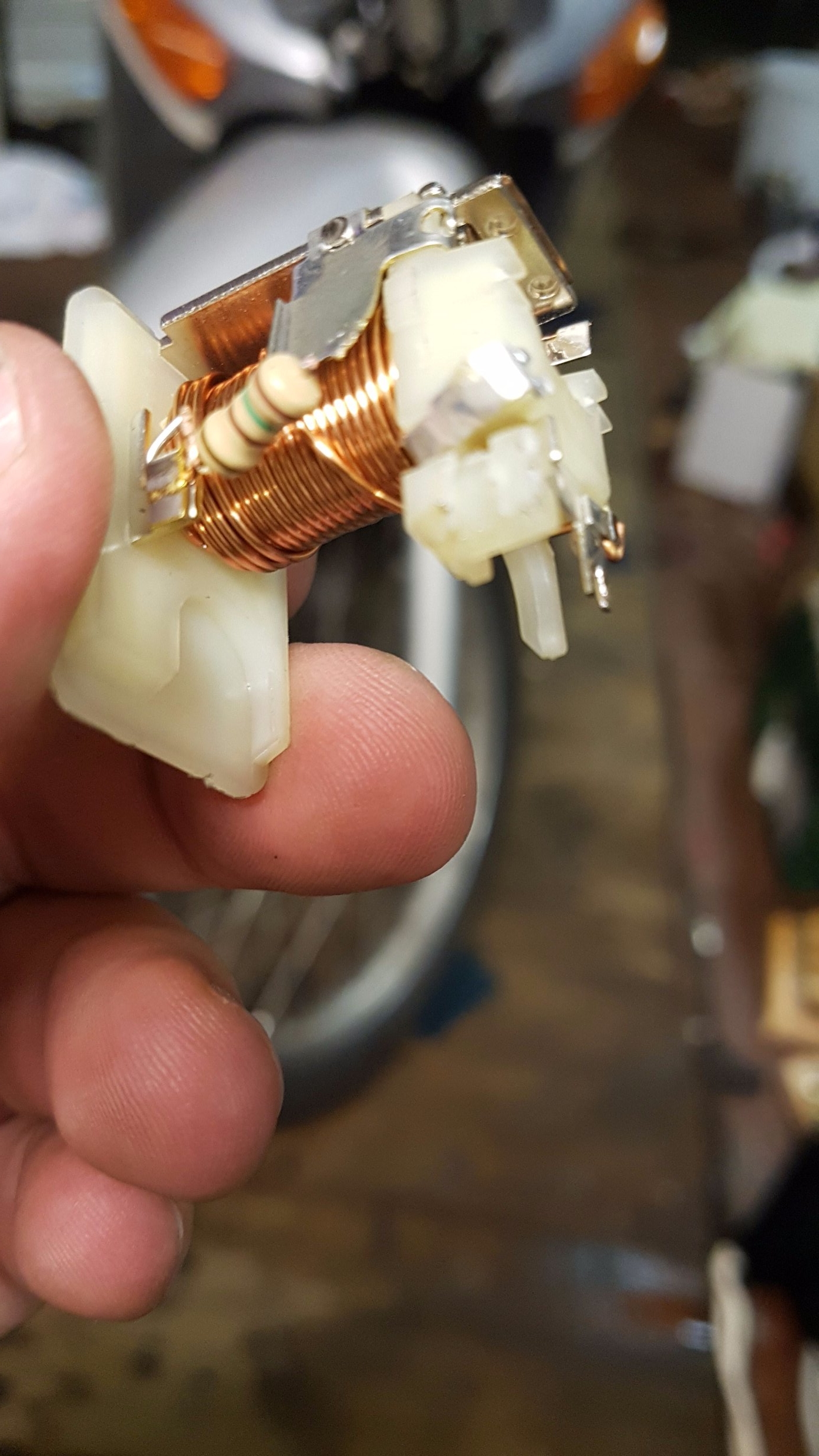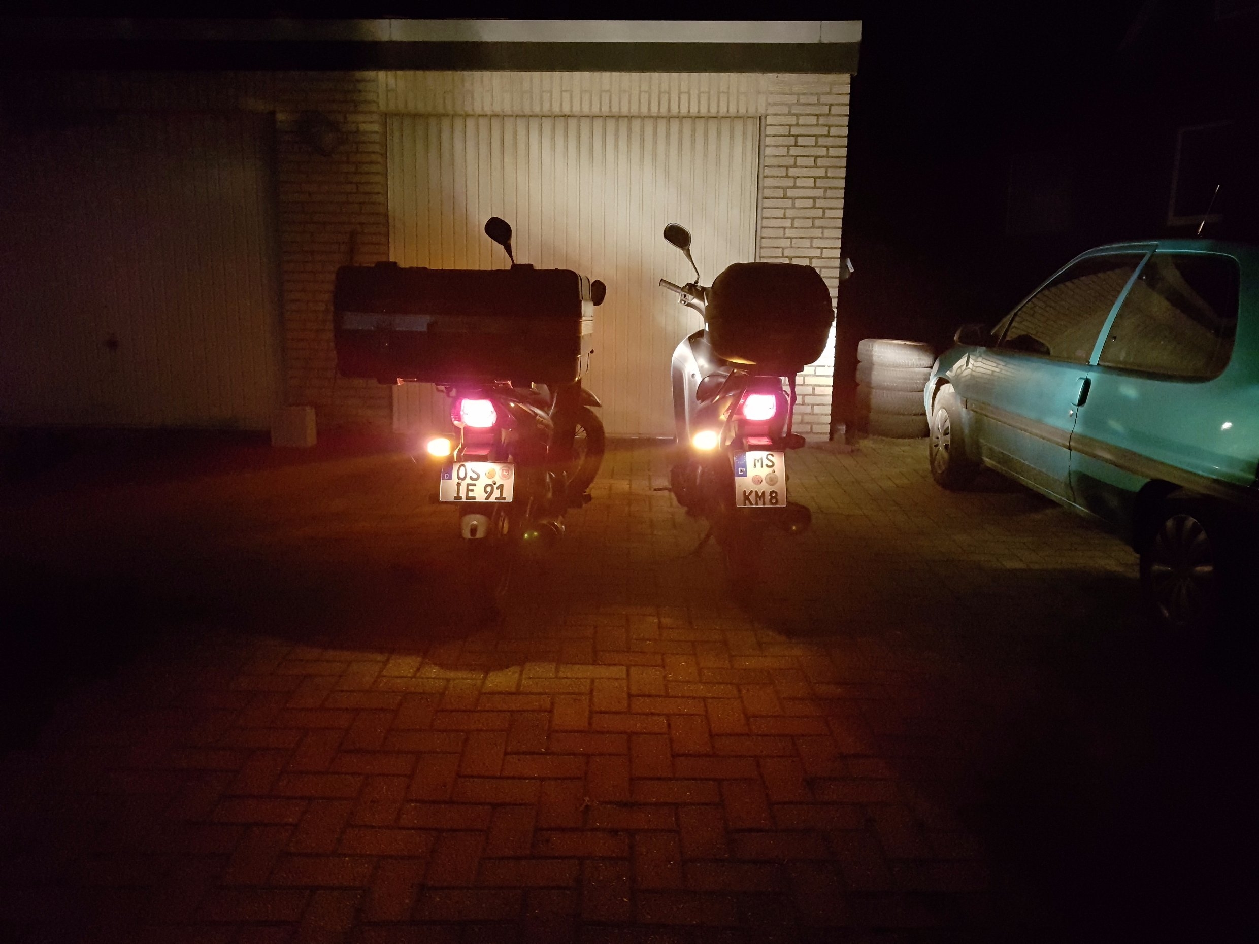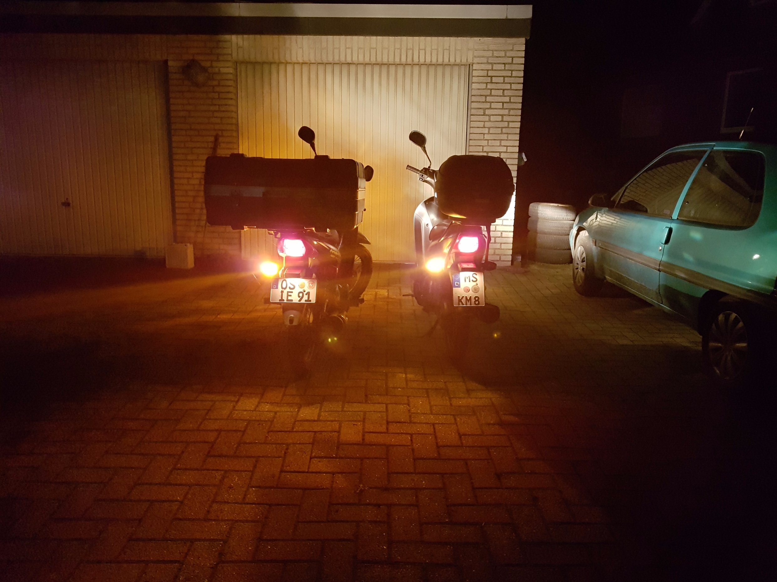 Der zweite Fehler war ein defektes Blinkrelais, welches meineserachtens mechanisch defekt war. Nach 20:00 Uhr konnte ich nur noch ein Jehova Blinkrelais mit 2*10Watt auftreiben ... Die 21W Blinklampen raus und durch 2* 10W ersetzt. .... Bei Pilles Kiste sind hinten Klarglassblinker ... Die orange tauchlackierten Lampen haben eine andere Winkelanordnung der Haltestifte .... Die hatten wir auch aus dem Jehova Gefährt entnommen.