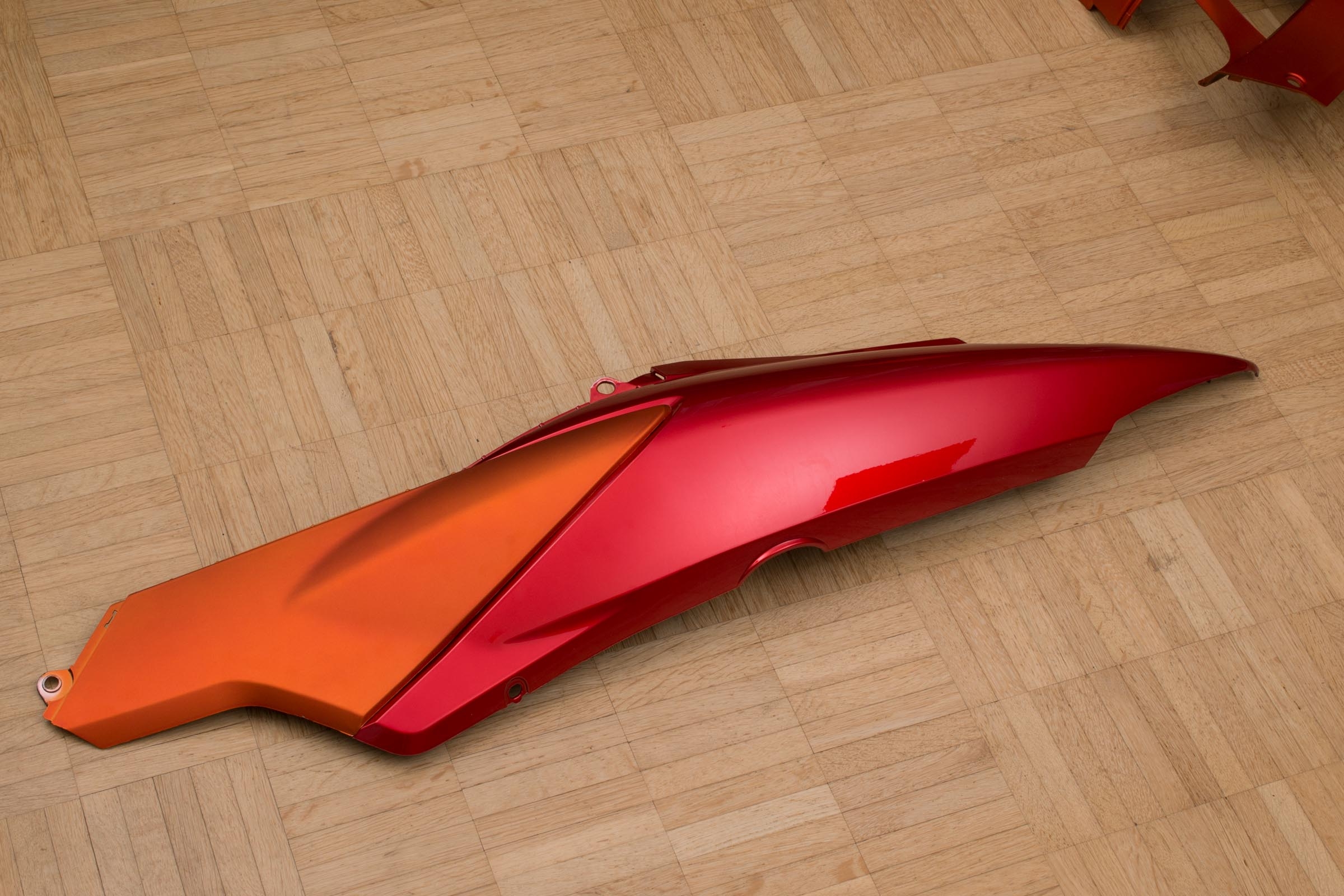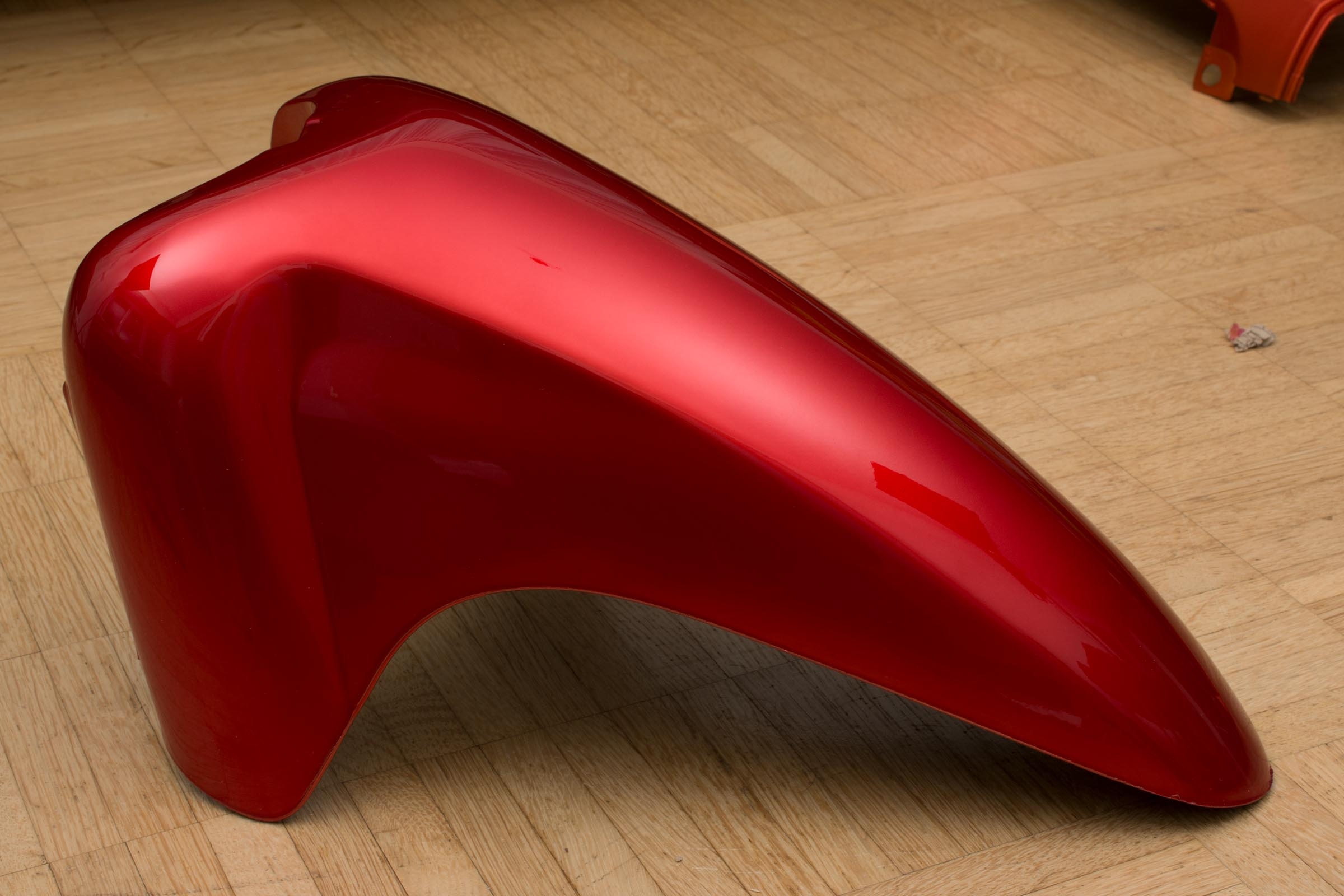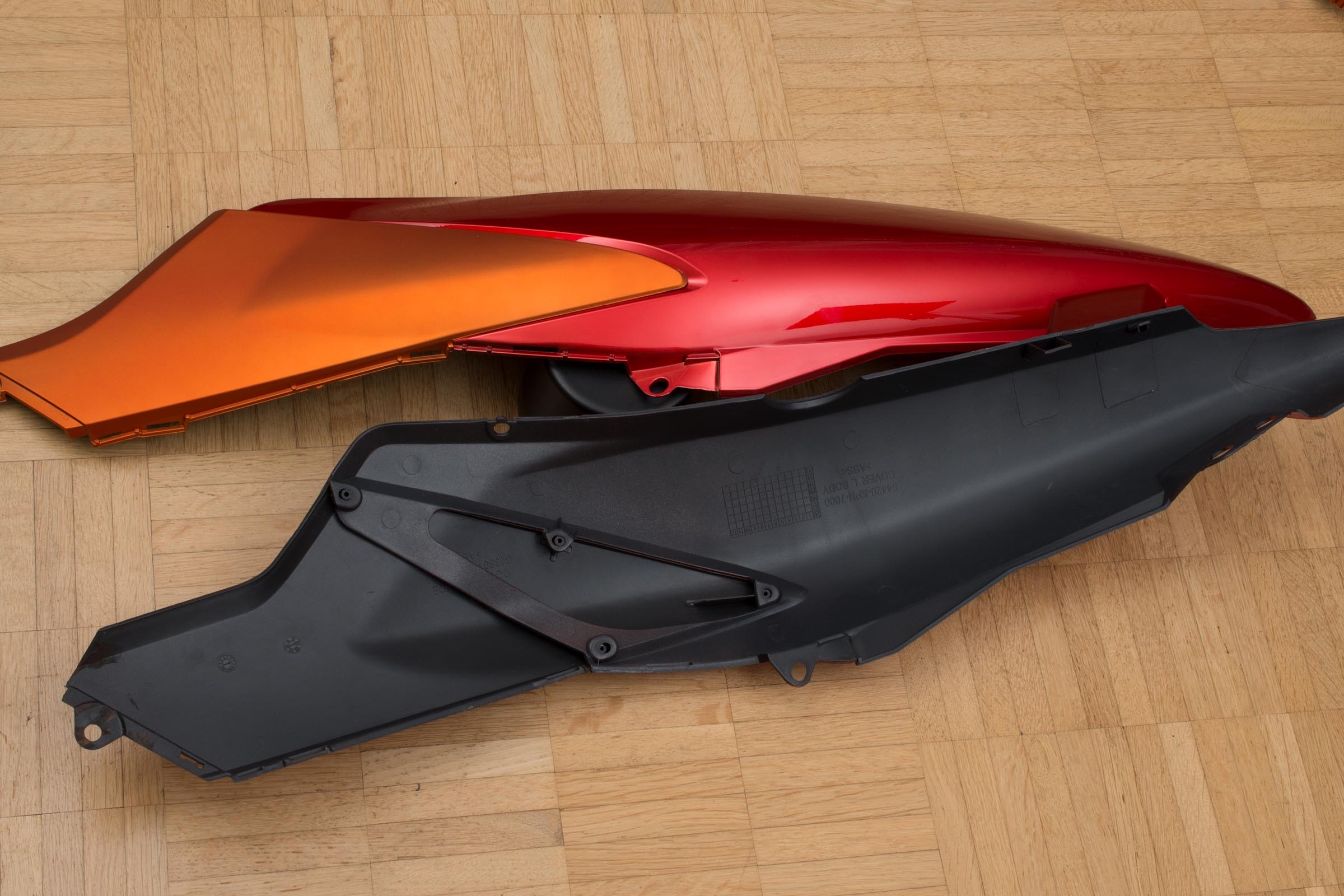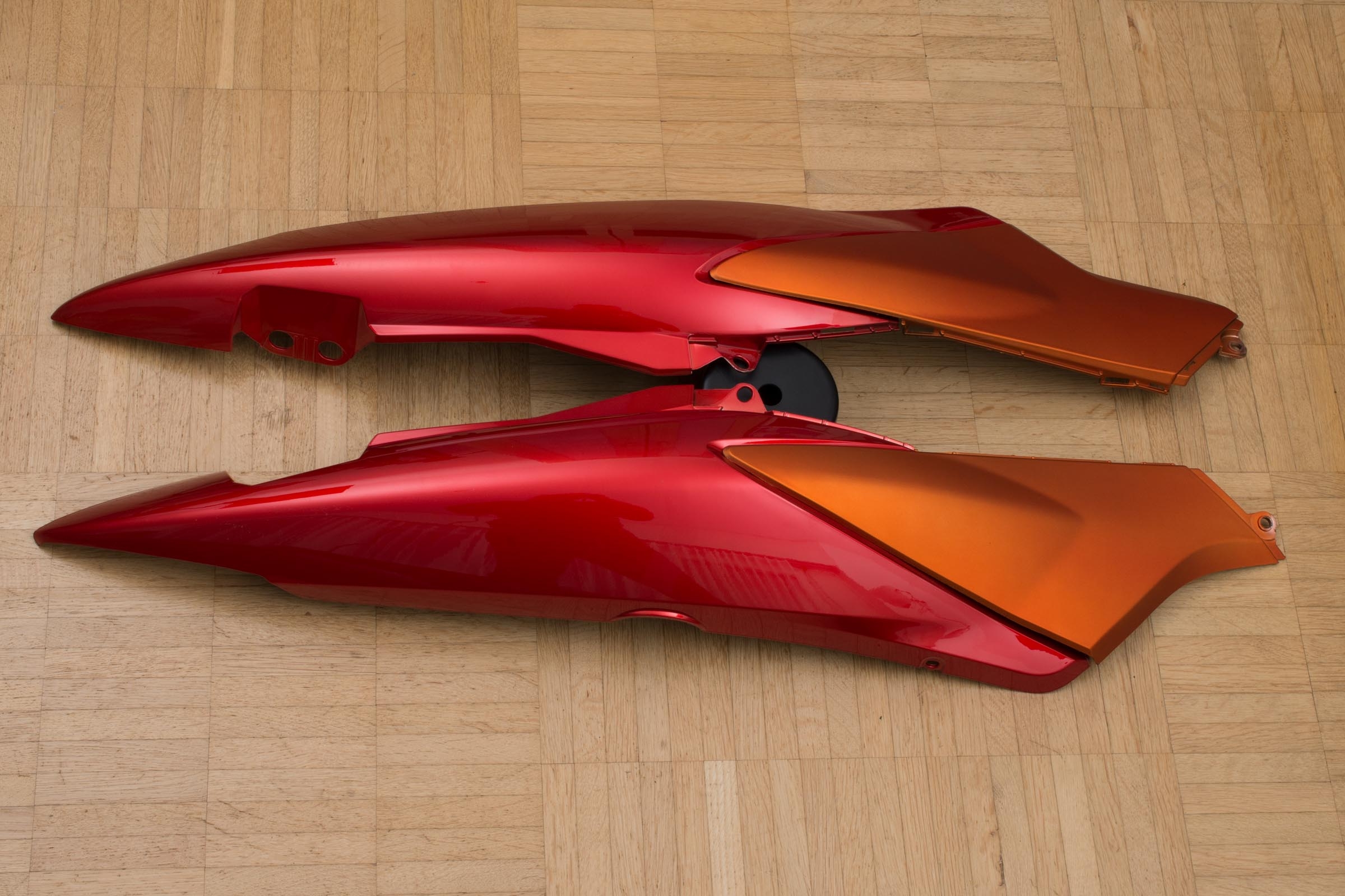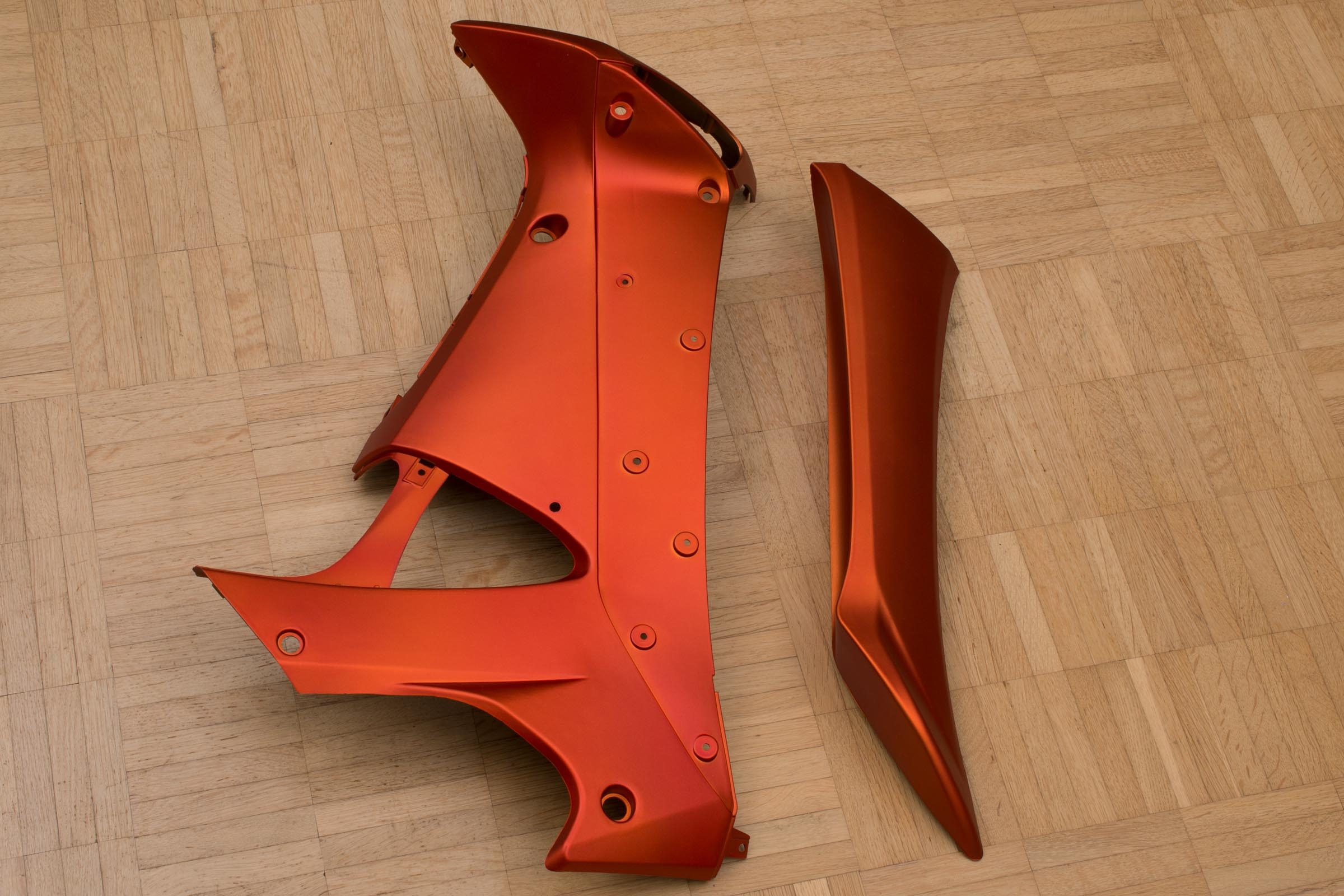 Die Roten Glanz Lackierten Teile. Hintere Seitenabdeckung (schon kombiniert mit dem Orange-Matt Teil) und das Verbindungsteil Hinten.
