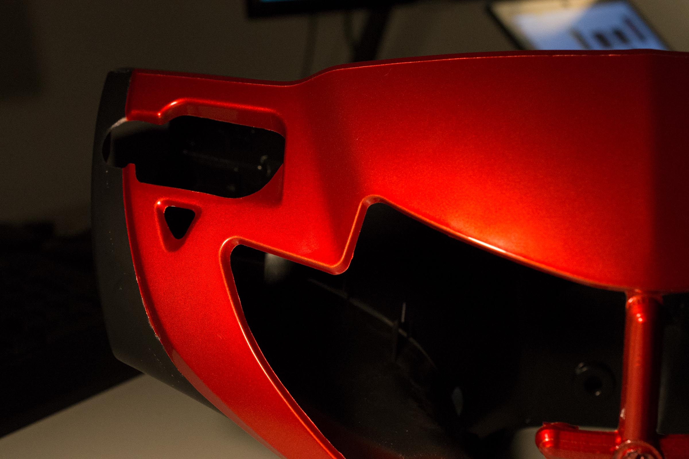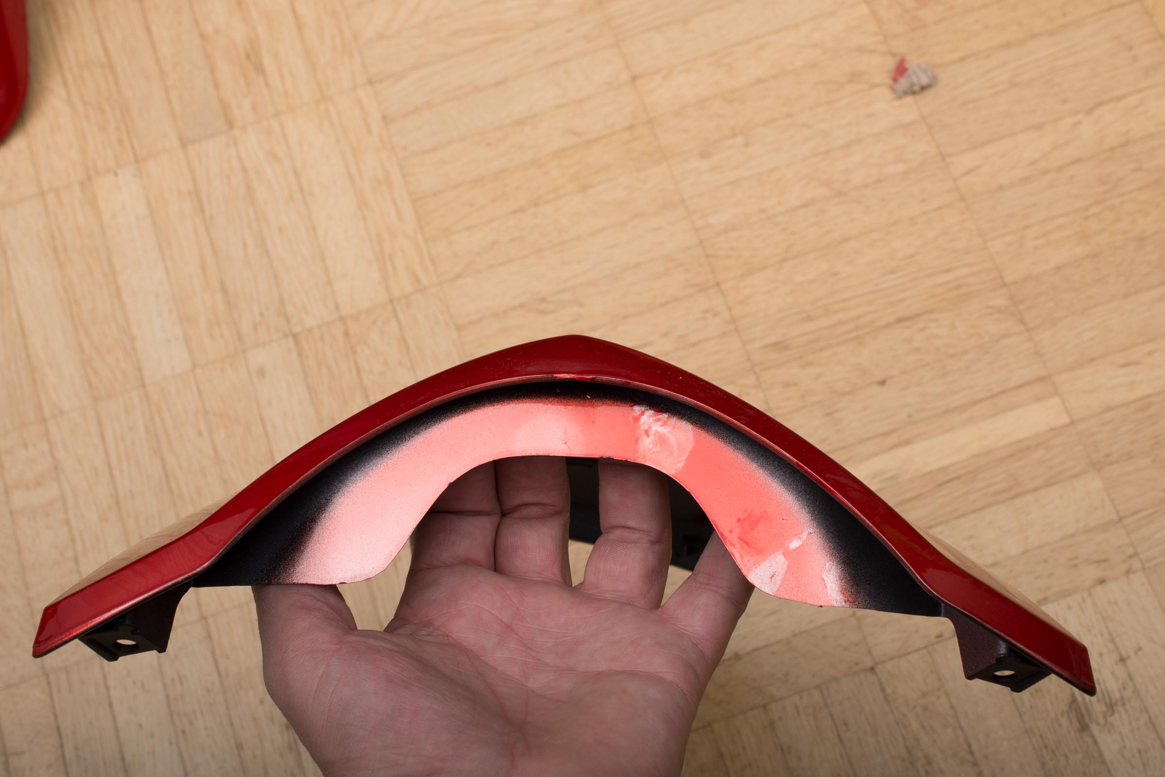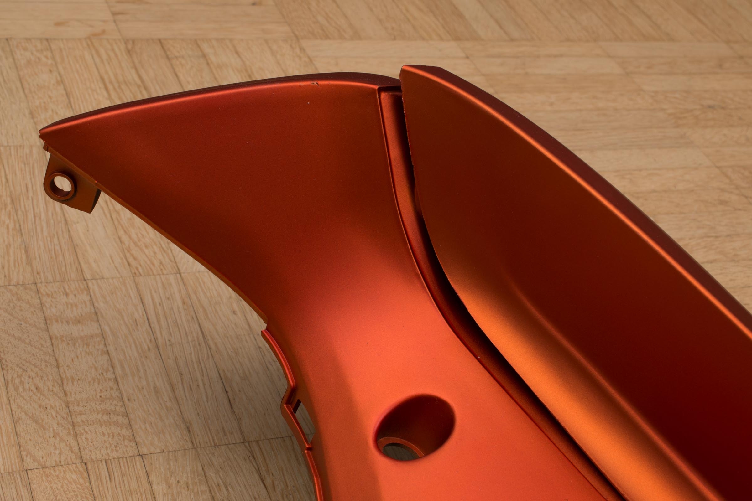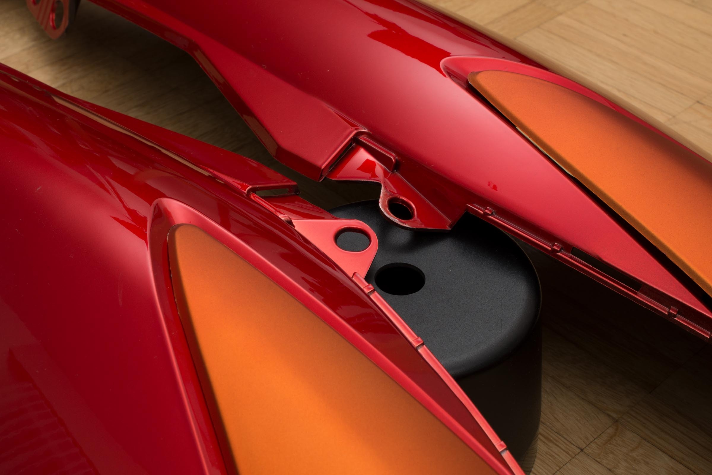 Die Roten Glanz Lackierten Teile. Hintere Seitenabdeckung (schon kombiniert mit dem Orange-Matt Teil) und das Verbindungsteil Hinten.