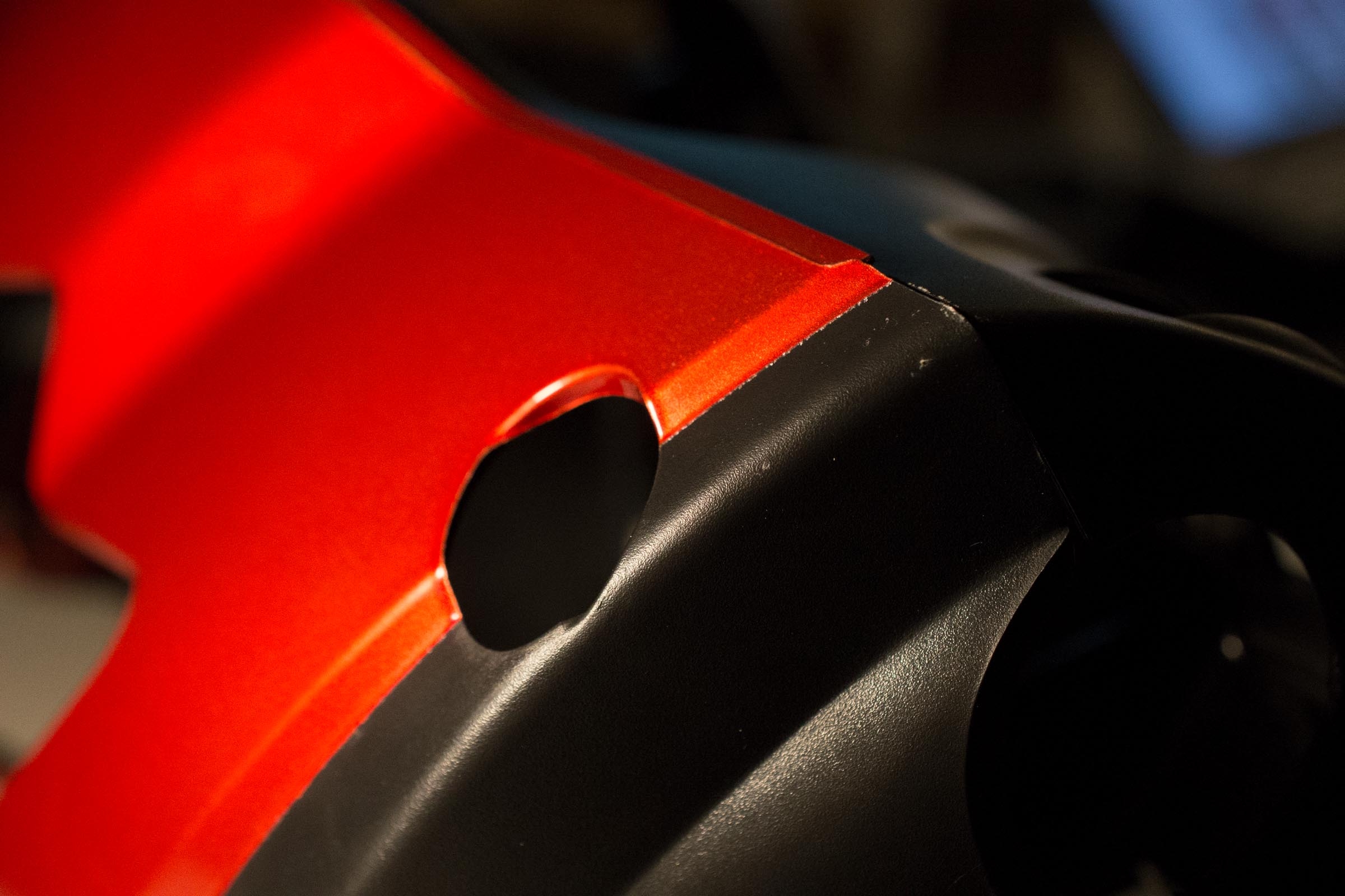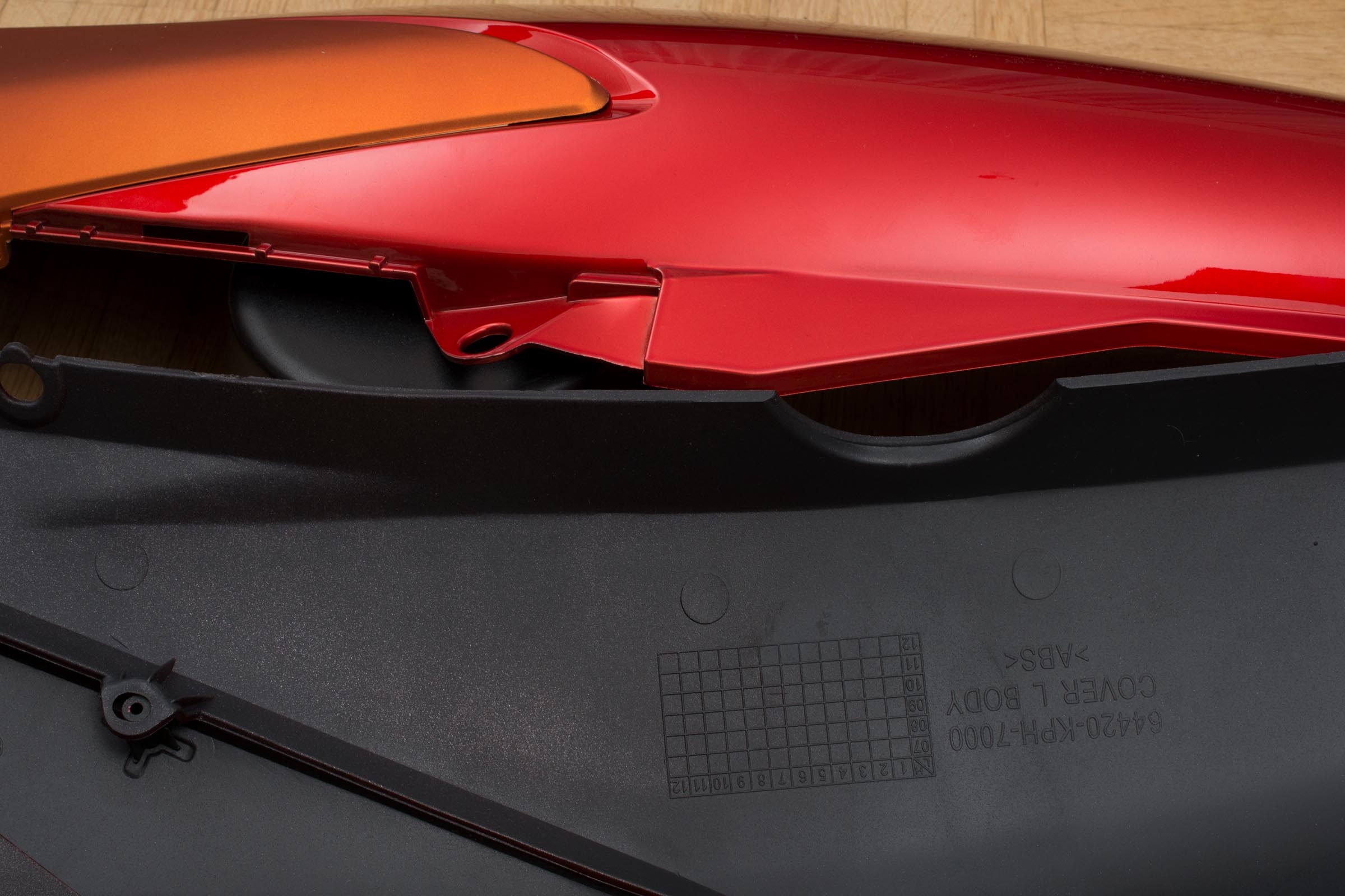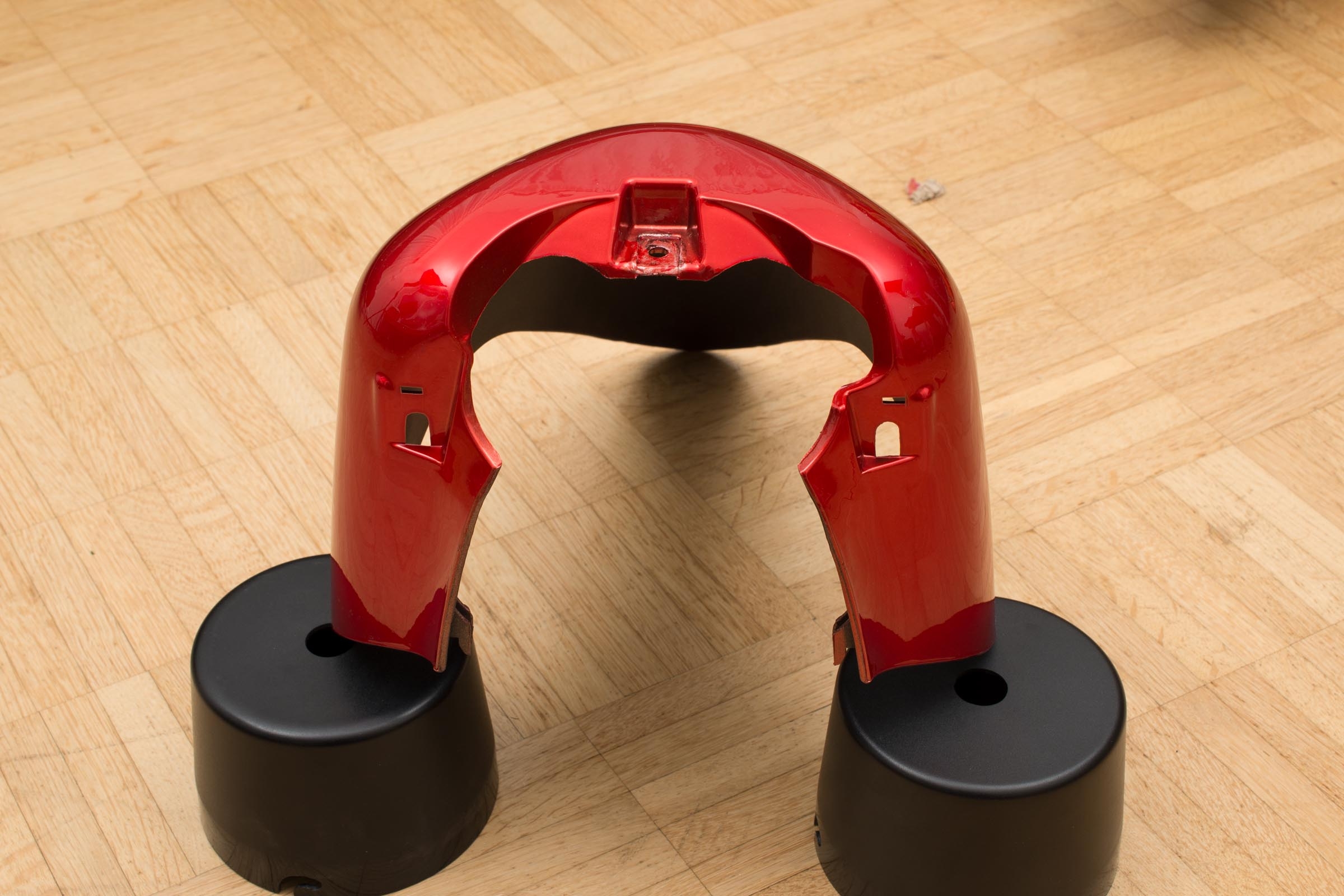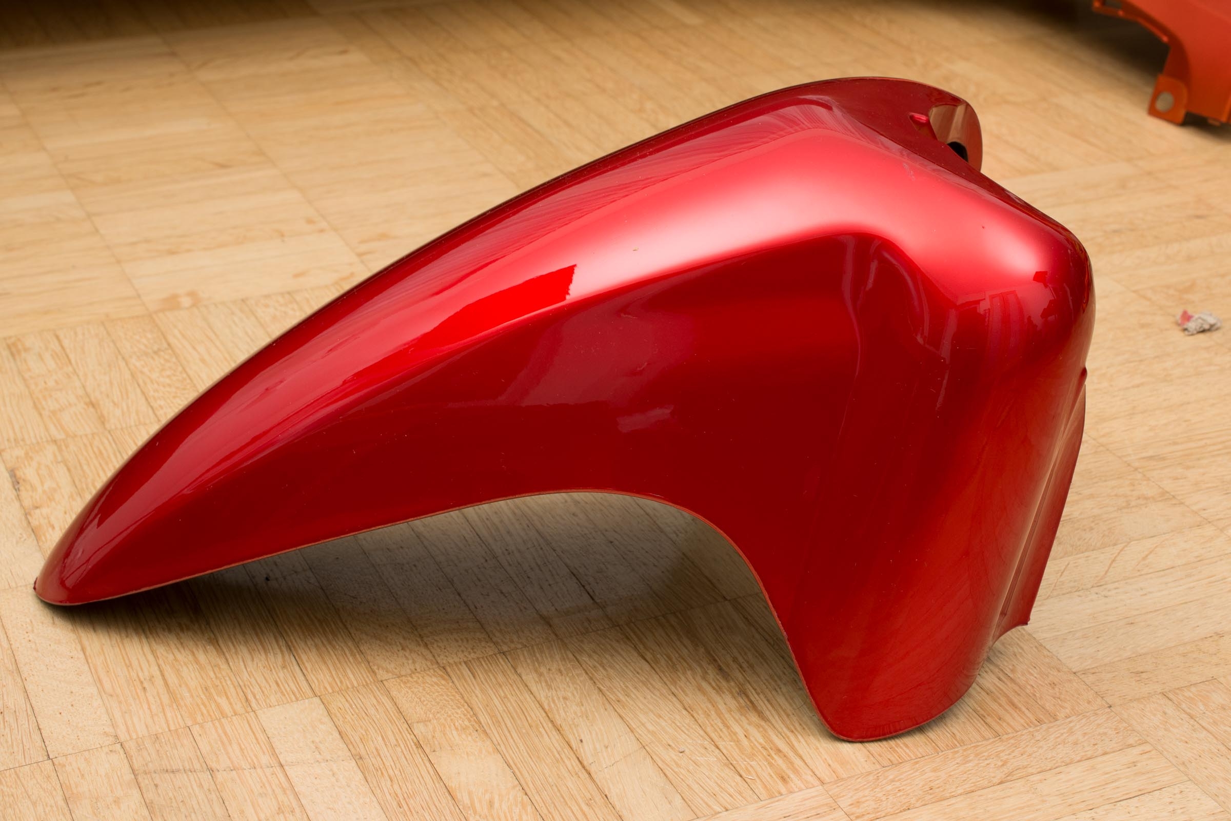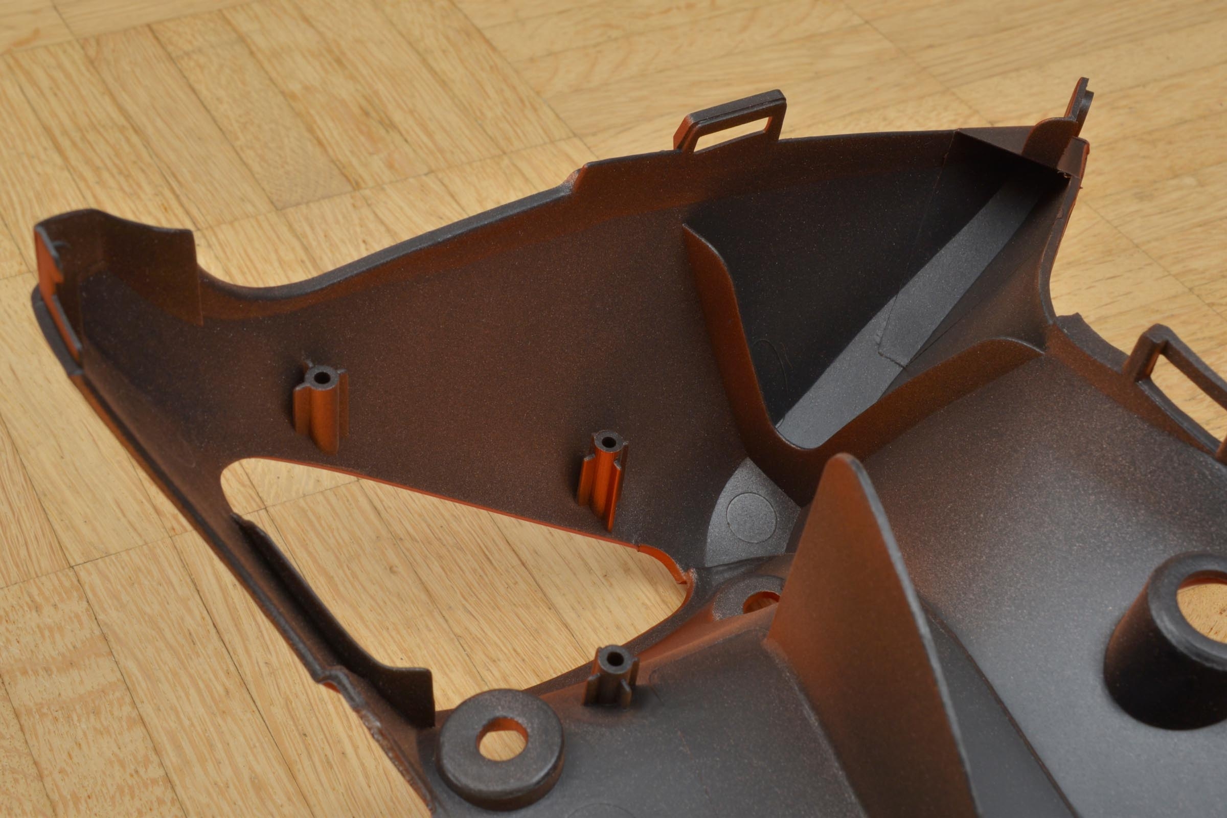 Die Roten Glanz Lackierten Teile. Hintere Seitenabdeckung (schon kombiniert mit dem Orange-Matt Teil) und das Verbindungsteil Hinten.