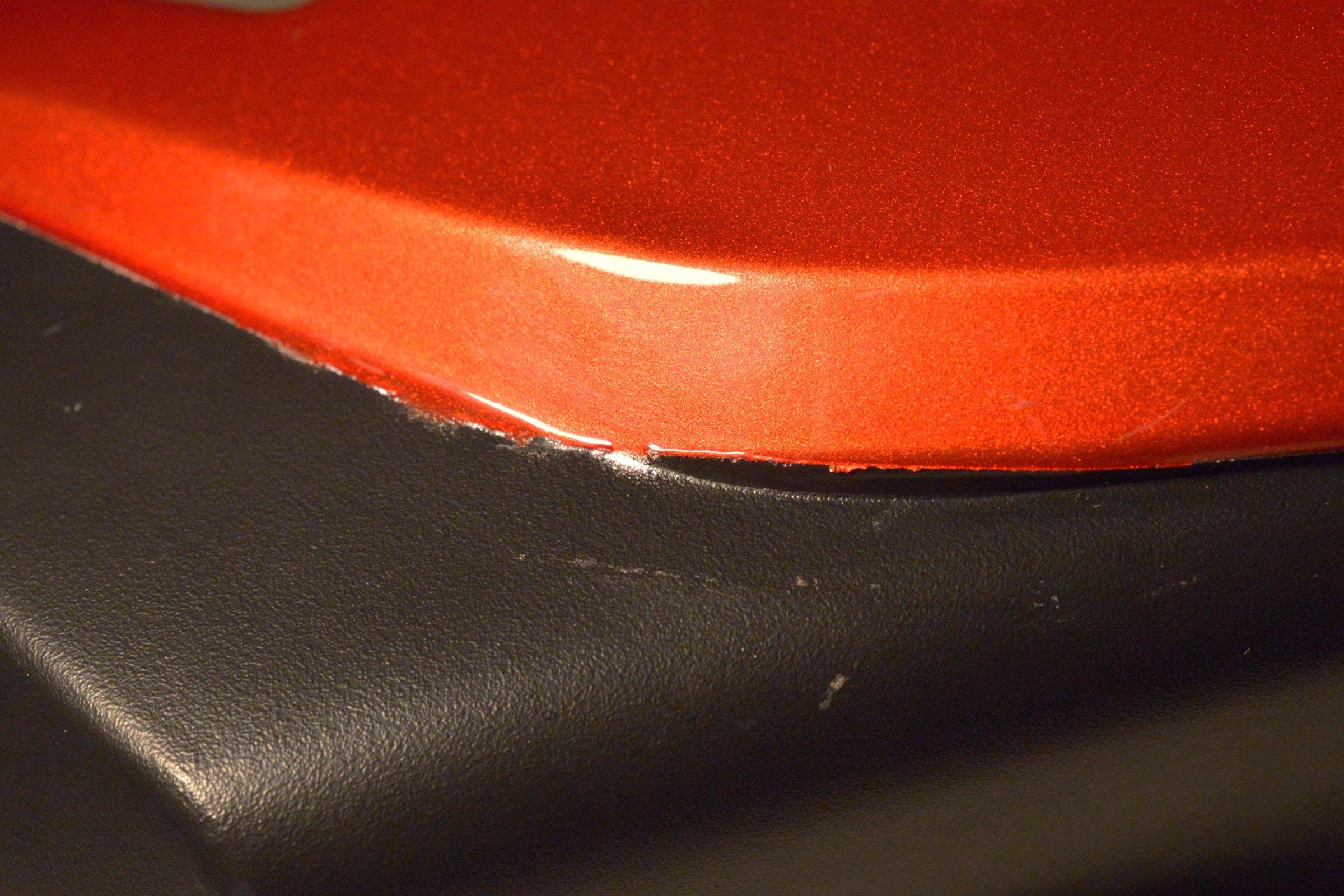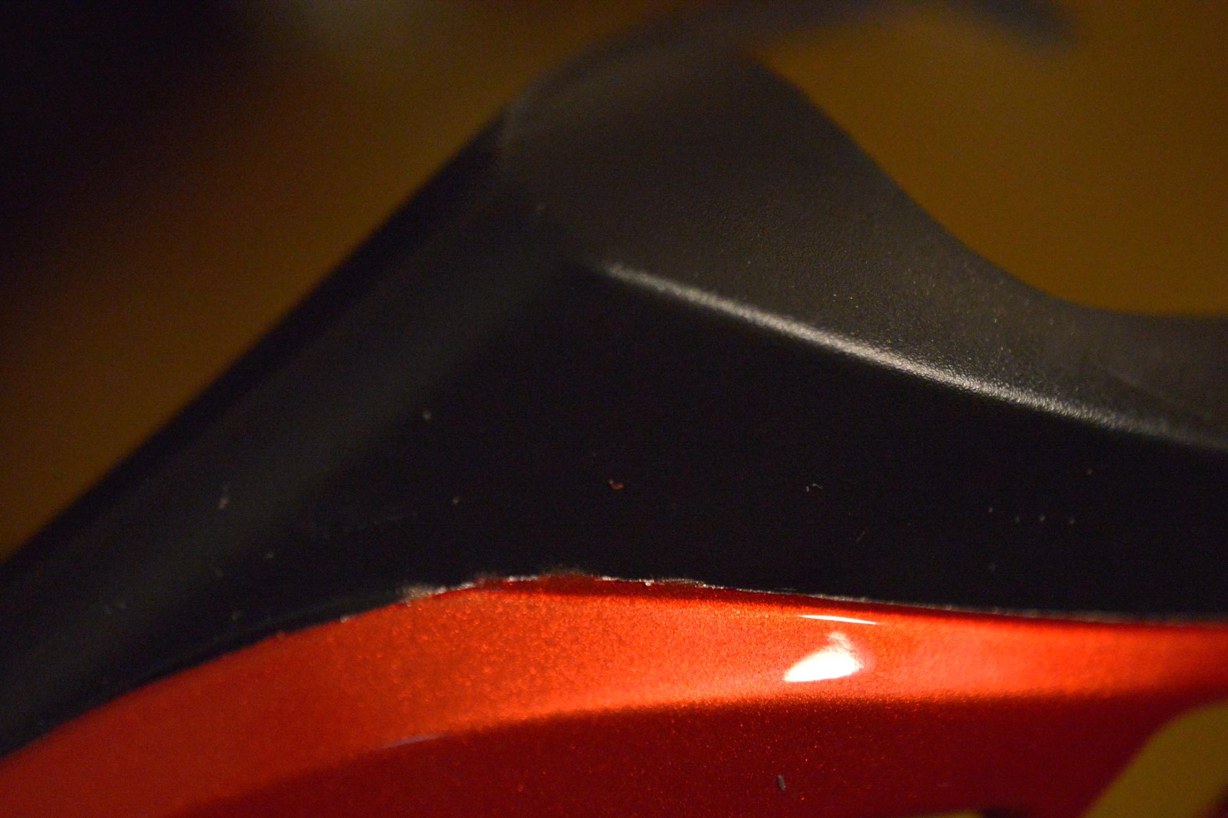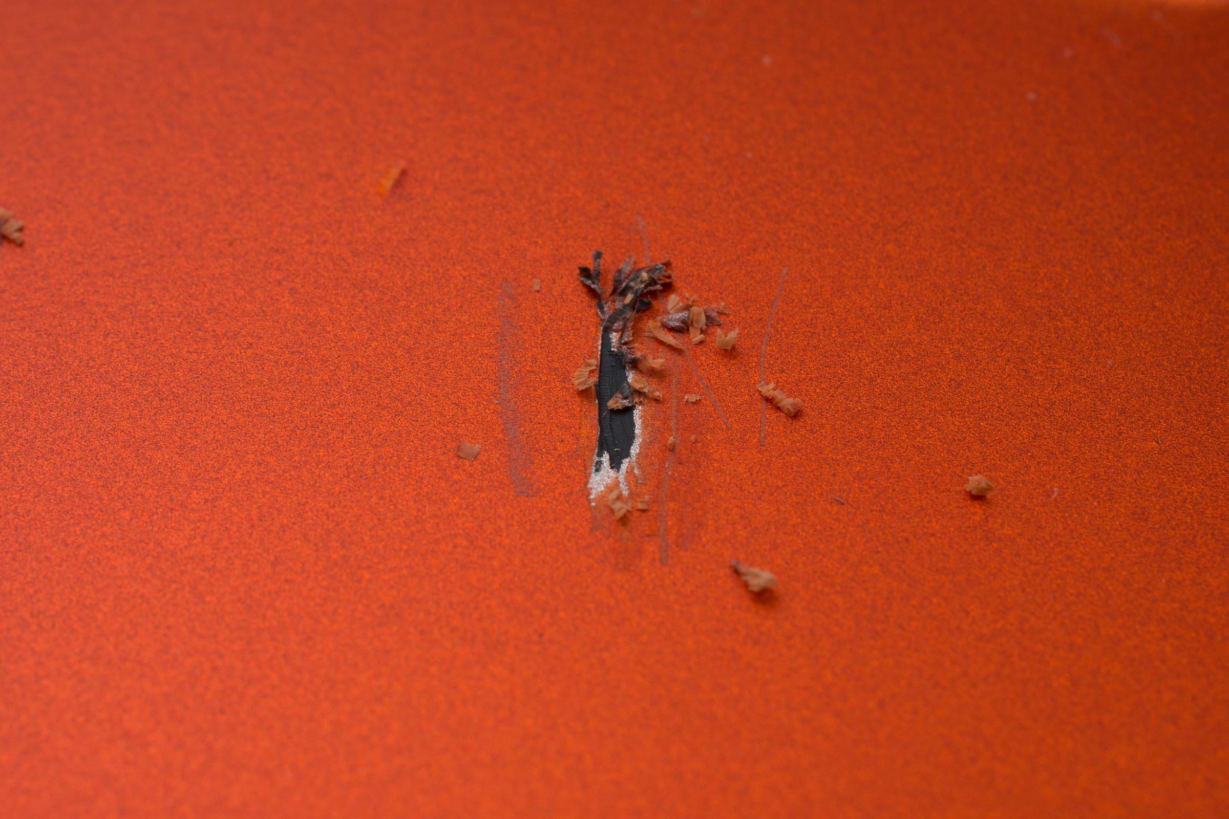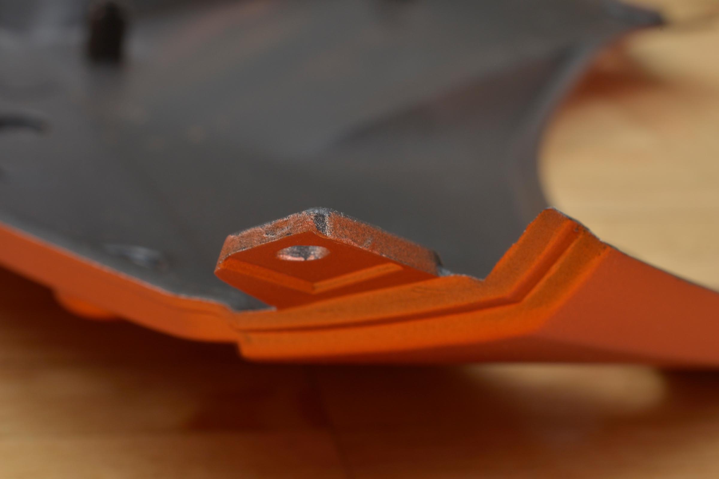 Zerkratz-Test. Oranges Teil: Links 1 x mit der scharfen Klinge drüber. Rechts: Kratzen bis zum Plastik. Mir scheint, da sind mehrere Matt-Lackschichten und man sieht gut die Grundierung. Habe nat. an der Stelle gekratzt wo zugeschraubt wird. Die Matte Oberfläche ist nicht Glatt sondern minim Rau.