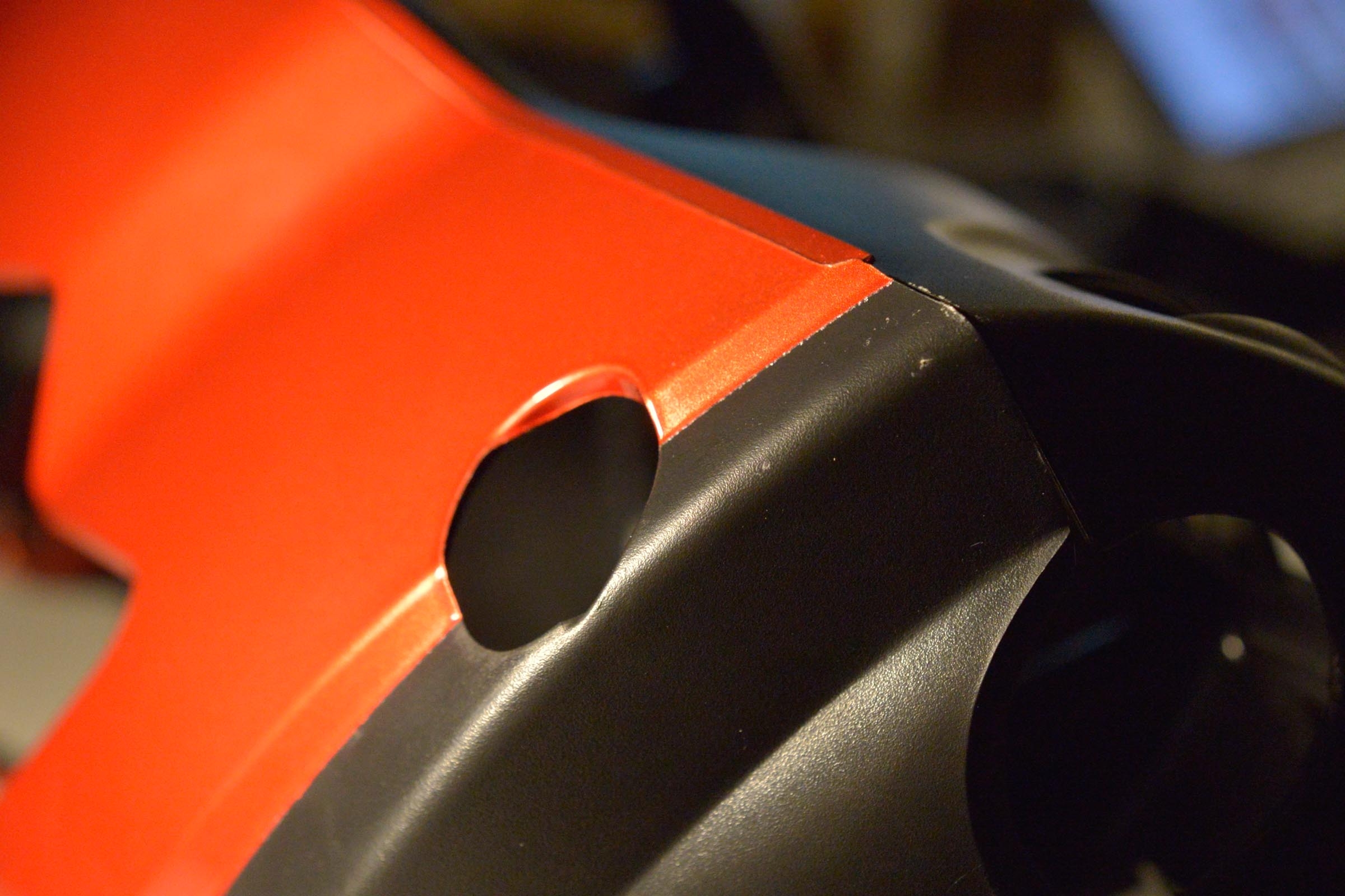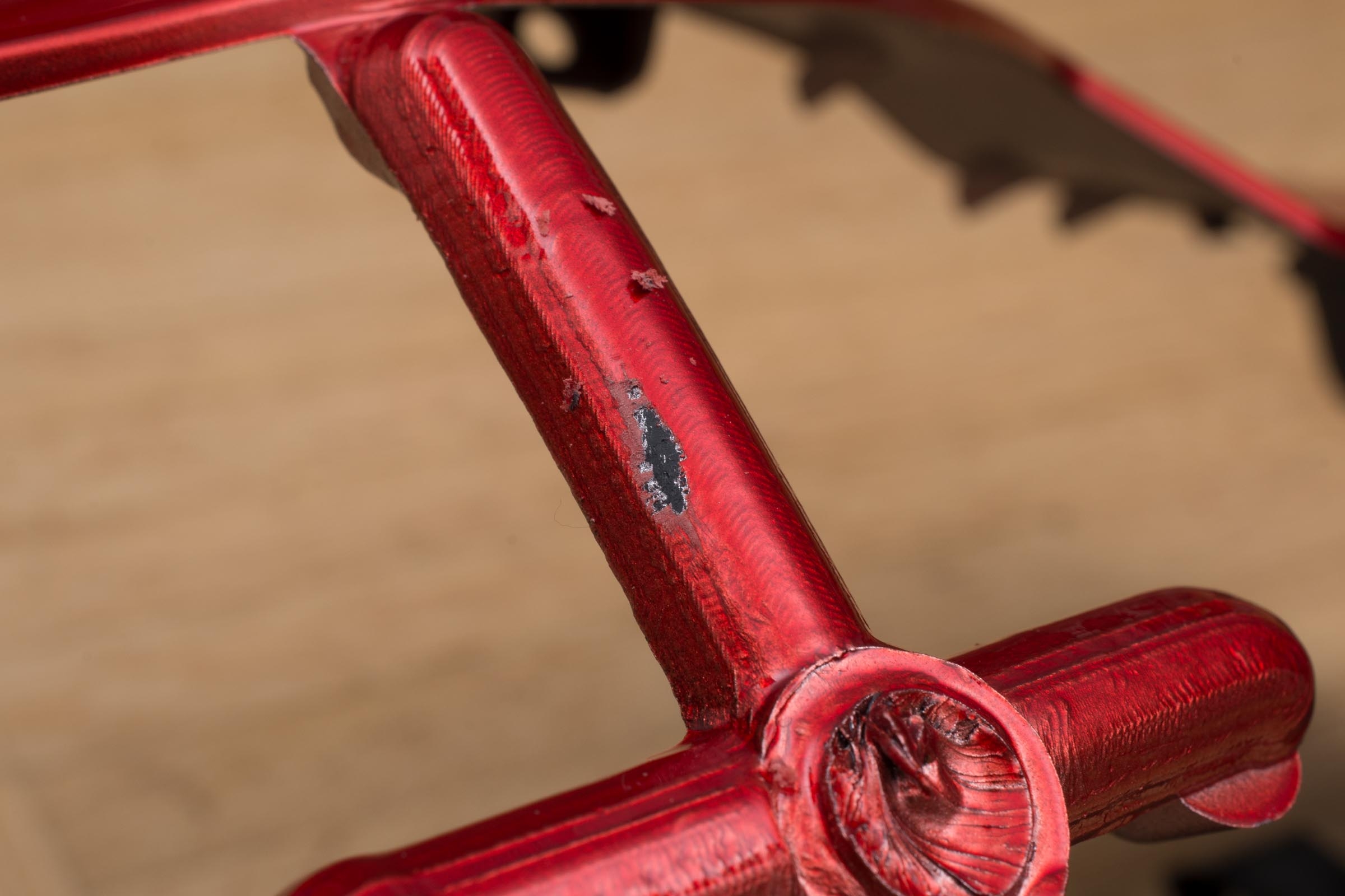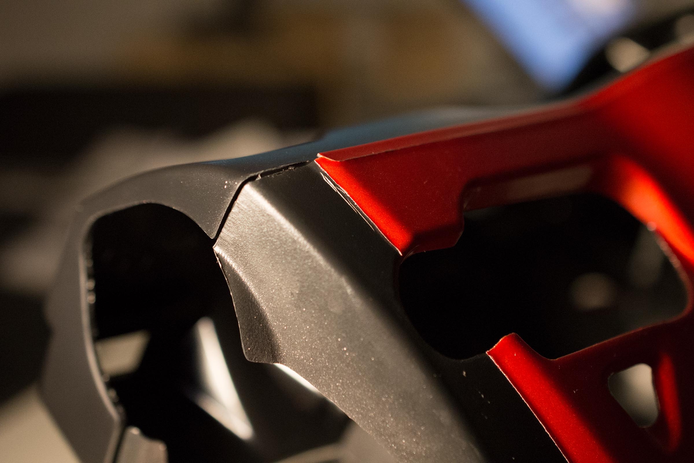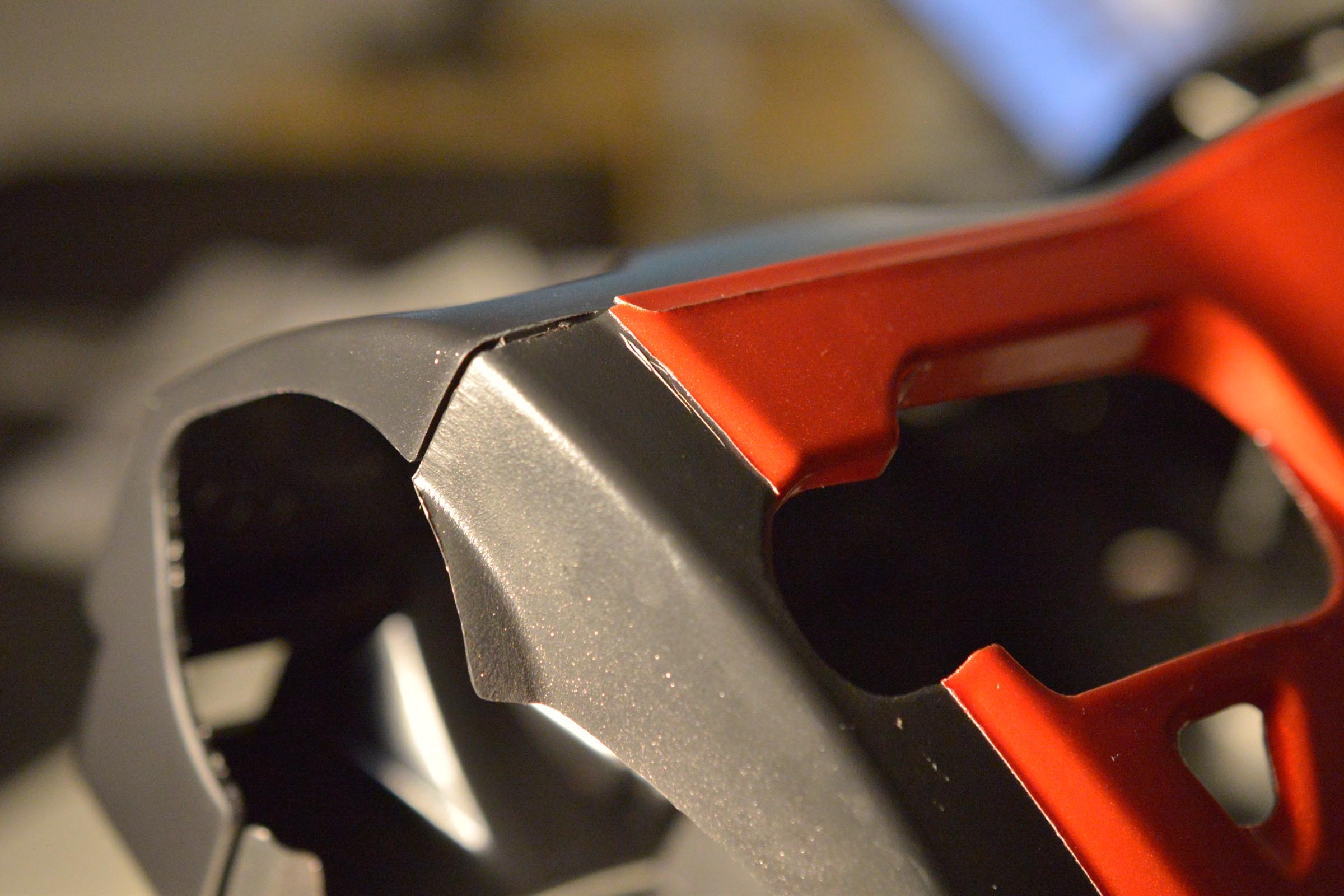 Zerkratz-Test. Oranges Teil: Links 1 x mit der scharfen Klinge drüber. Rechts: Kratzen bis zum Plastik. Mir scheint, da sind mehrere Matt-Lackschichten und man sieht gut die Grundierung. Habe nat. an der Stelle gekratzt wo zugeschraubt wird. Die Matte Oberfläche ist nicht Glatt sondern minim Rau.