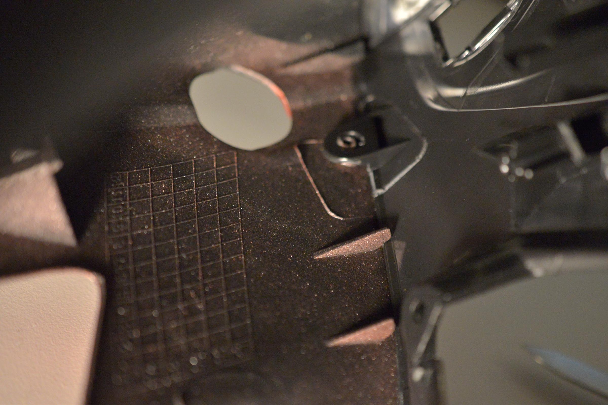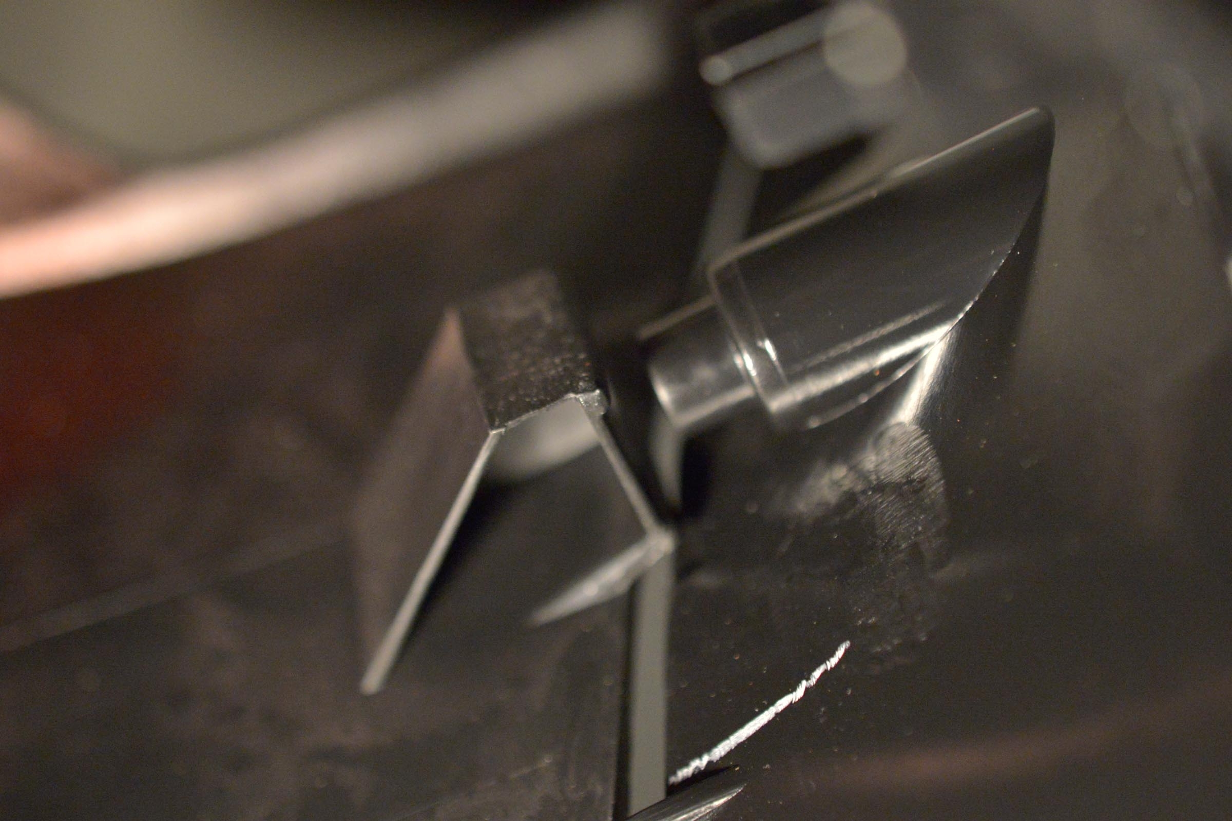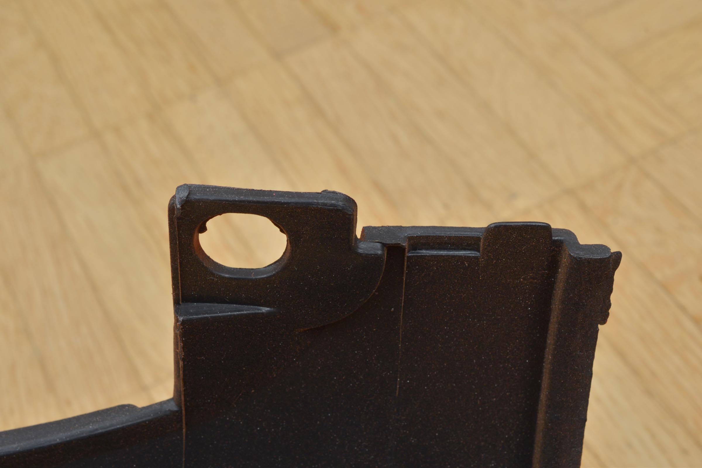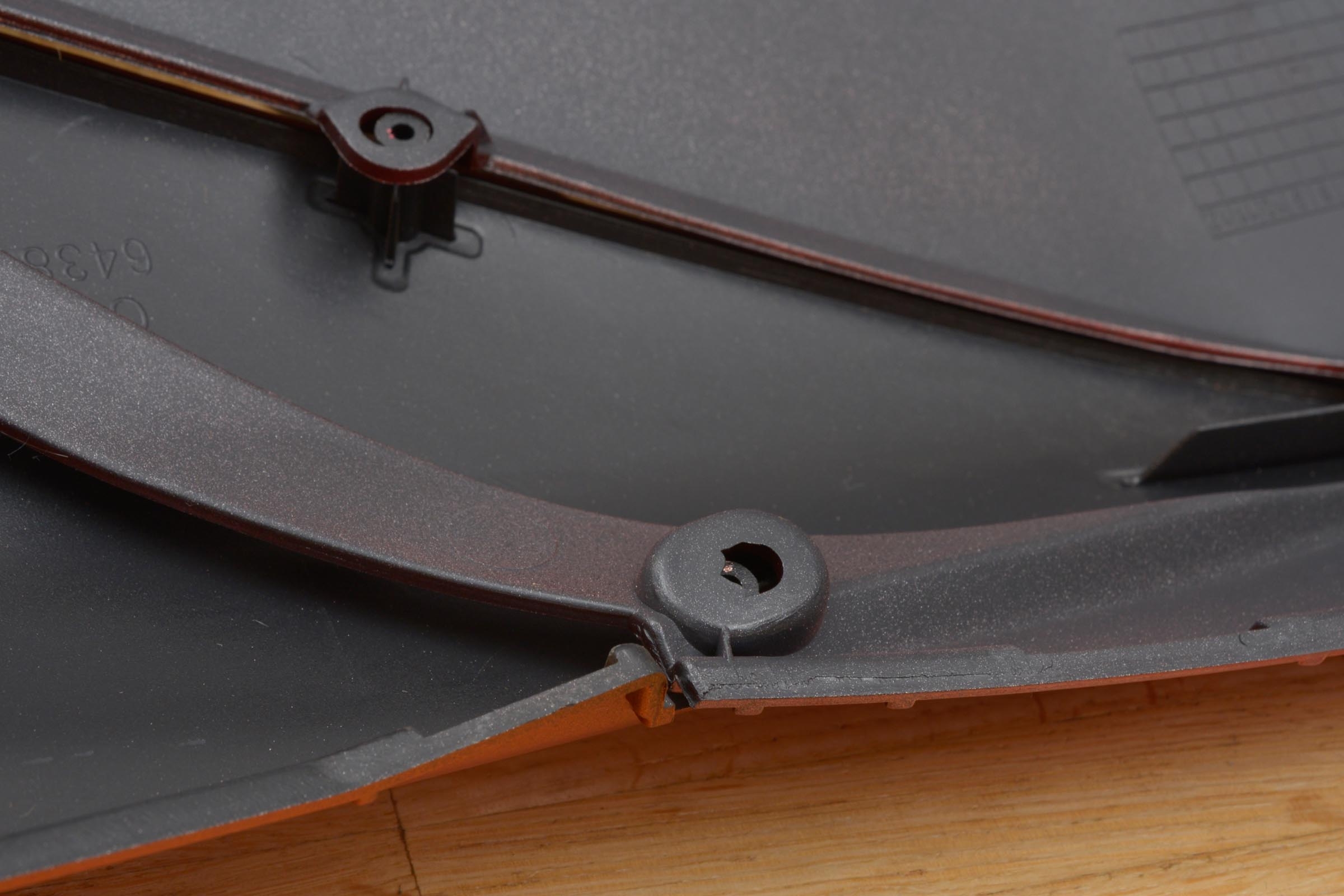 Zerkratz-Test. Oranges Teil: Links 1 x mit der scharfen Klinge drüber. Rechts: Kratzen bis zum Plastik. Mir scheint, da sind mehrere Matt-Lackschichten und man sieht gut die Grundierung. Habe nat. an der Stelle gekratzt wo zugeschraubt wird. Die Matte Oberfläche ist nicht Glatt sondern minim Rau.