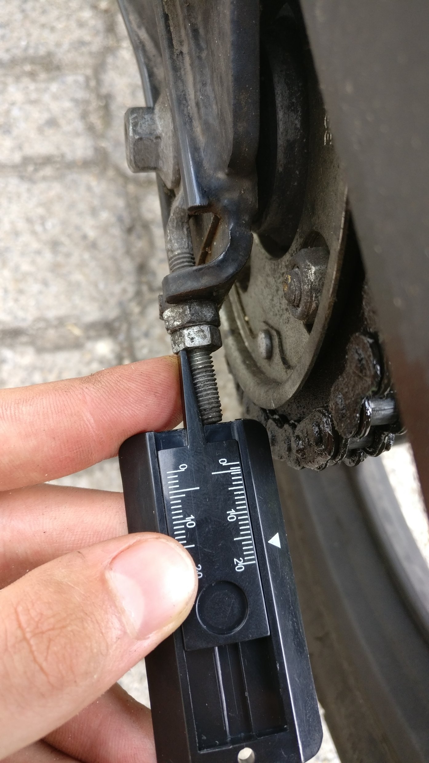 Mir wurde beigebracht die Achse und Kontermuttern zu lösen und auf beiden Seiten gleich viele Umdrehungen zu machen -> fertig. Das habe ich gemacht, bis die Kette wieder einen guten Durchhang hatte. Theoretisch müsste dann ja rechts und links der gleiche Abstand von Kontermutter und Gewindestange sein, oder? Dem war leider nicht so.