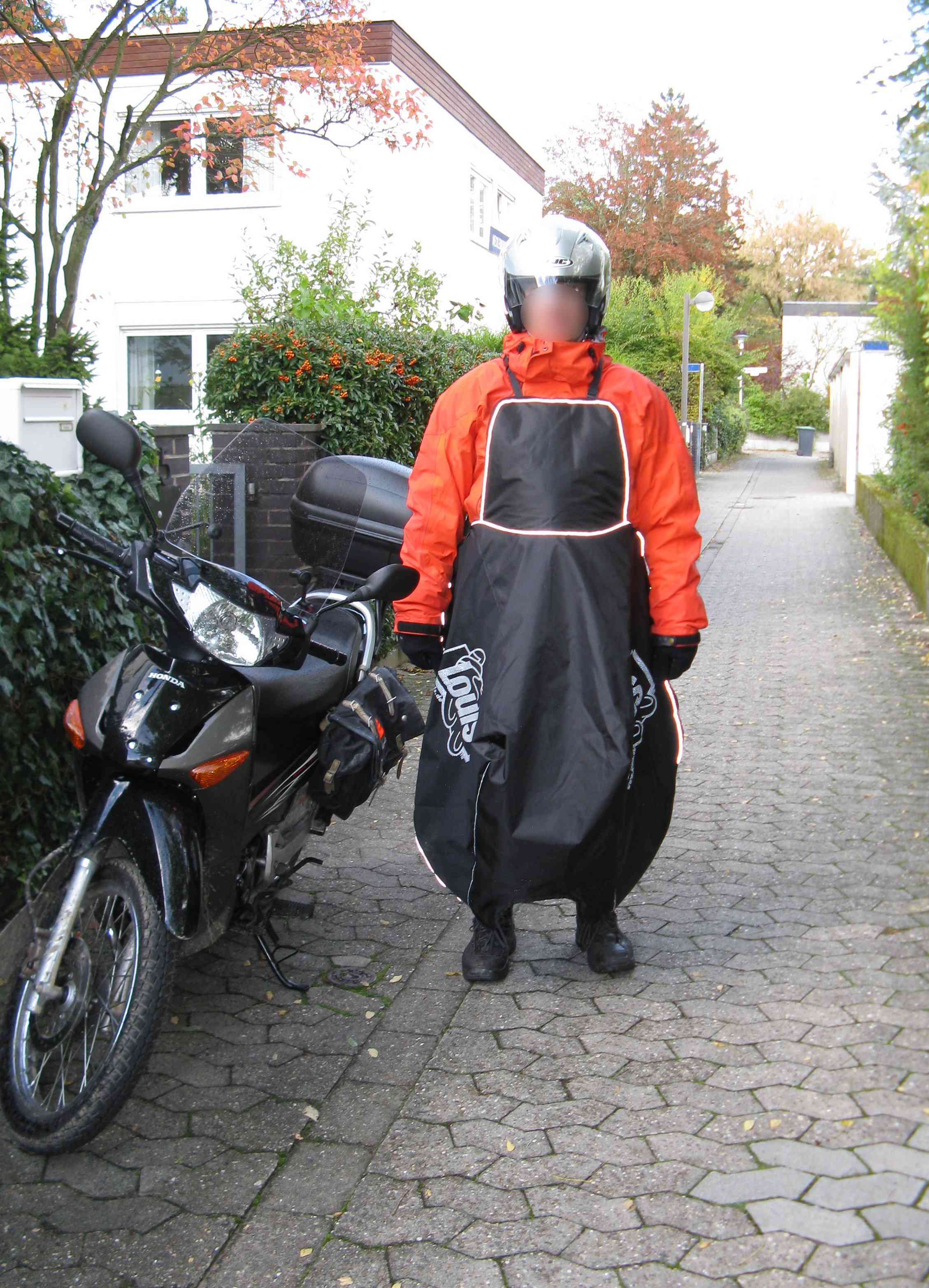 Die letzen Tage war es morgens doch schon ziemlich kühl und regnerisch, aber für den Thermoboy noch zu warm. Die original Honda Decke + Regenjacke = :up2: Nachmittags ohne Regen aber wieder zu warm. Aber die Decke ist dermaßen perfekt geschnitten, daß ich sie auf der Sitzbank liegen lassen, mich draufsetzen und dann auch fahren kann. An den Auspuff kommt sie nicht ran und die Motorwärme macht dem Material auch nichts aus. Somit könnte man sie zmindest im Hersbst fast immer mit dabei haben.