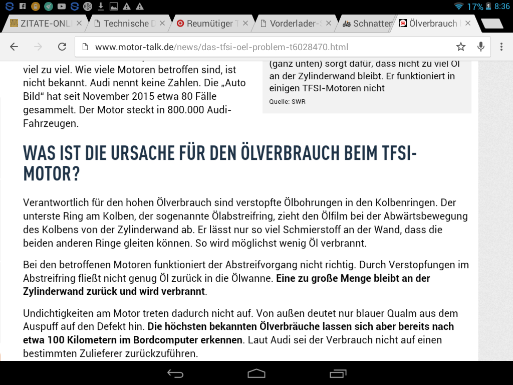 Nun lese ich aber, dass etwa 800.000 TFSI Motoren des VW-Konzernes verbaut wurden und "infolge Zusetzung der zu klein gehaltenen Bohrungen im Kolben" (inner/unterhalb des Ölabstreifringes)