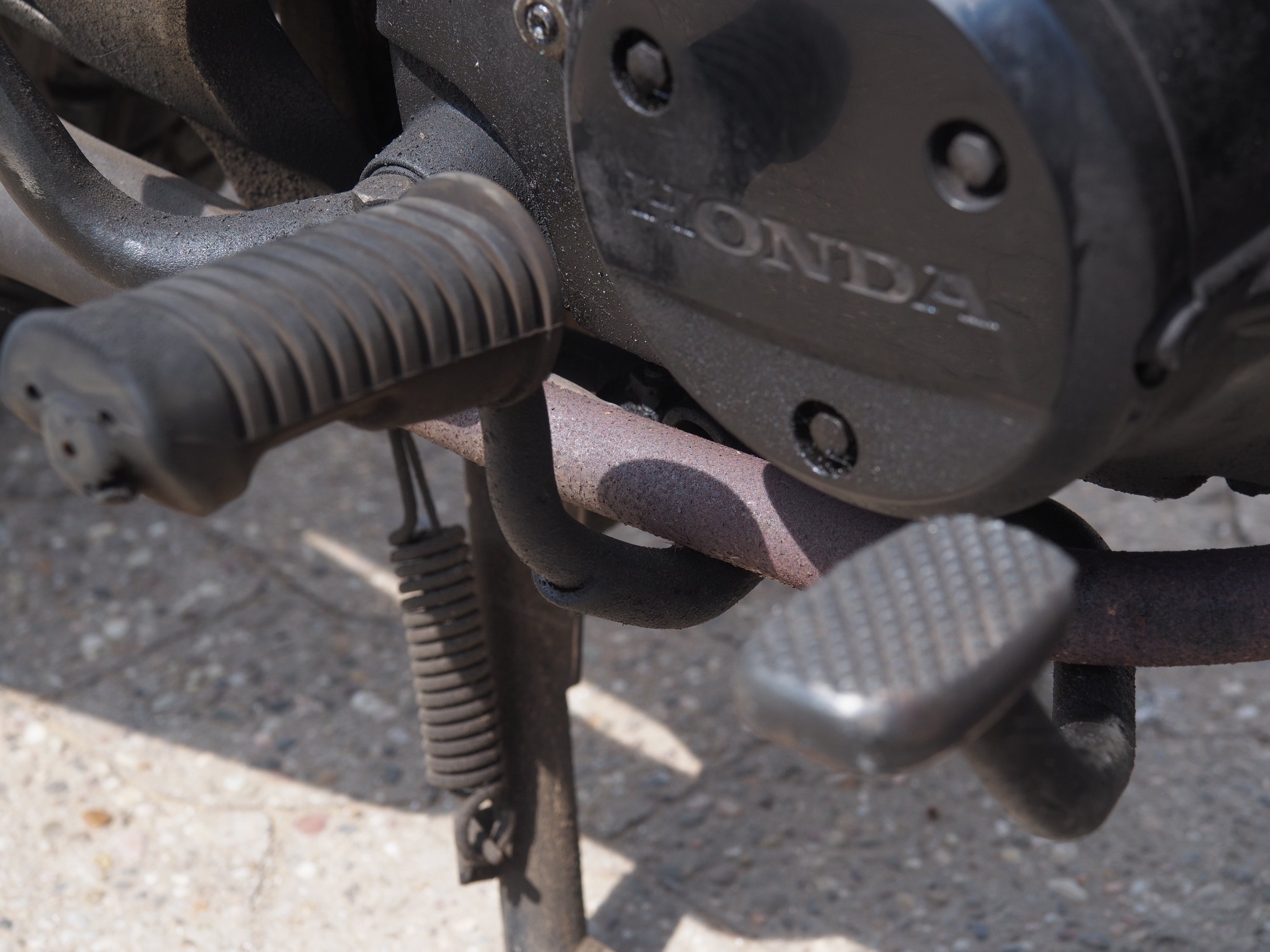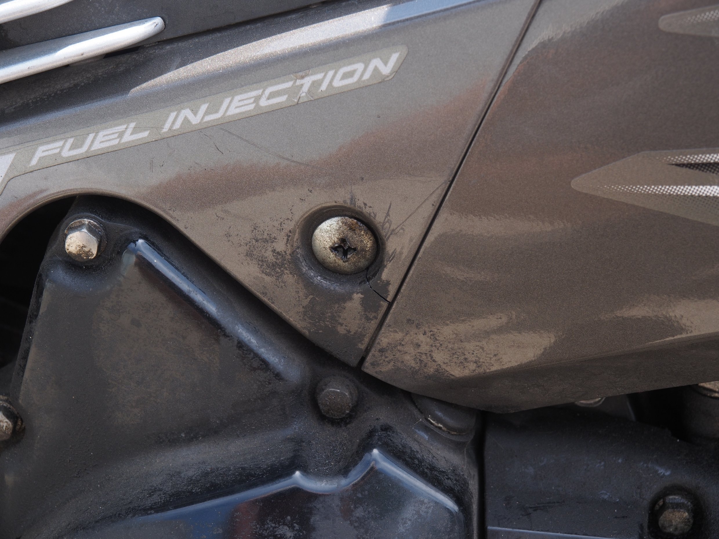 Ganz am Anfang habe ich in der Stadt vorne überbremst und bin nach rechts geklatscht. Nicht gerutscht, nur mit Schmackes umgekippt. Seitdem hat die kleine Puig leichte Kratzer rechts. Den Bremshebel habe ich zurückgebogen, der Lenker ist einen Hauch verzogen. (Einen Ersatzlenker, damals Chaosengel abgekauft, gibt es dazu)