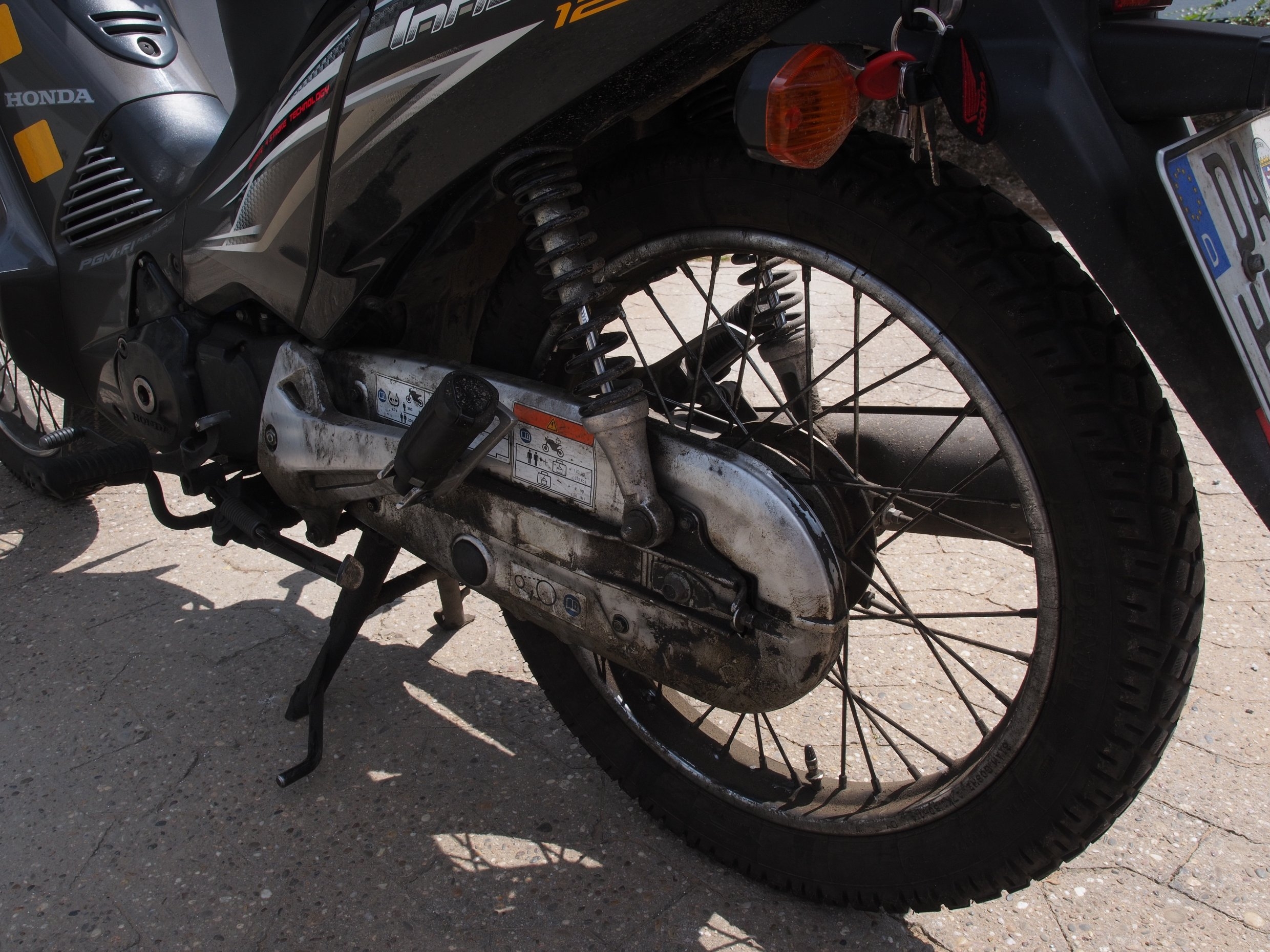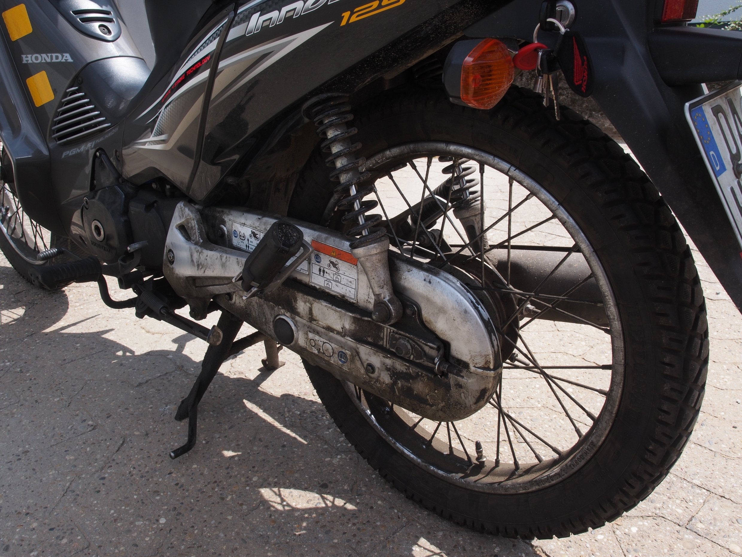 Ich bin kein Putzer, entsprechend sieht die Inno aus. Die ersten beiden Winter bin ich durchgefahren, danach nicht mehr. Trotz dick Korrosionsschutz und vielen Eimern kalten Wassers sind die Speichen angefressen, ihr kennt das. Der originale LR-Satz sieht da etwas schlechter aus, als der später gekaufte zweite.