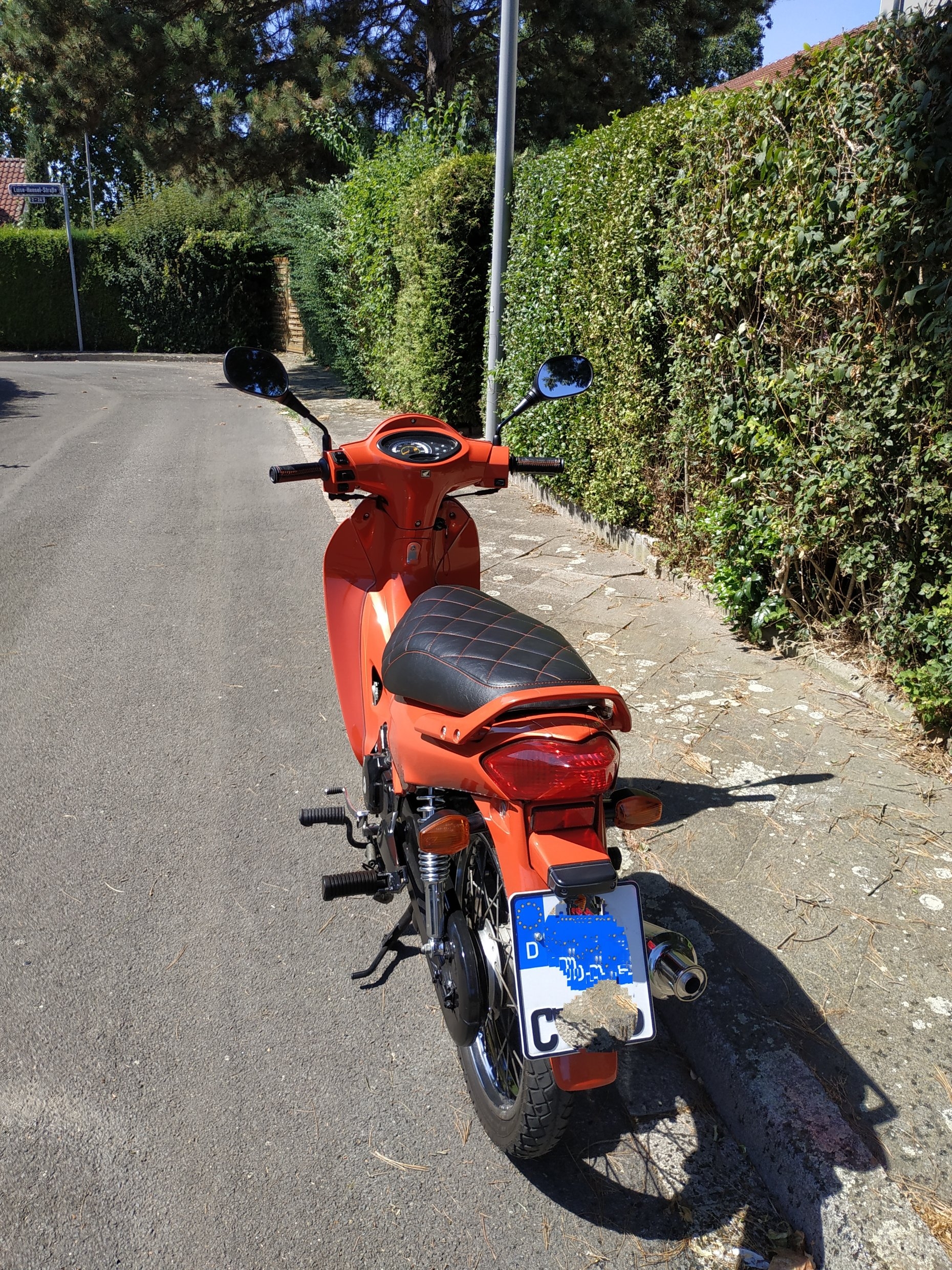 die schöne sieht von hinten einfach zu Orange aus. Ein Farbkontrast wäre der Handbügel schwarz beschichtet, in verbindung mit Hinterradspritzschutzum das Kennzeichen in schwarz. Bei Hornbach wird gerade abziehbarer Sprühlack, Schwarz matt und Glanz für runde 6e die Dose abverkauft... die Profilackierung würde nicht beschädigt werden, zum ausprobieren und finden, eine optimale Lösung... ohne sich Teile in den Keller zu legen, wie ich immer wieder diesen Fehler begehe