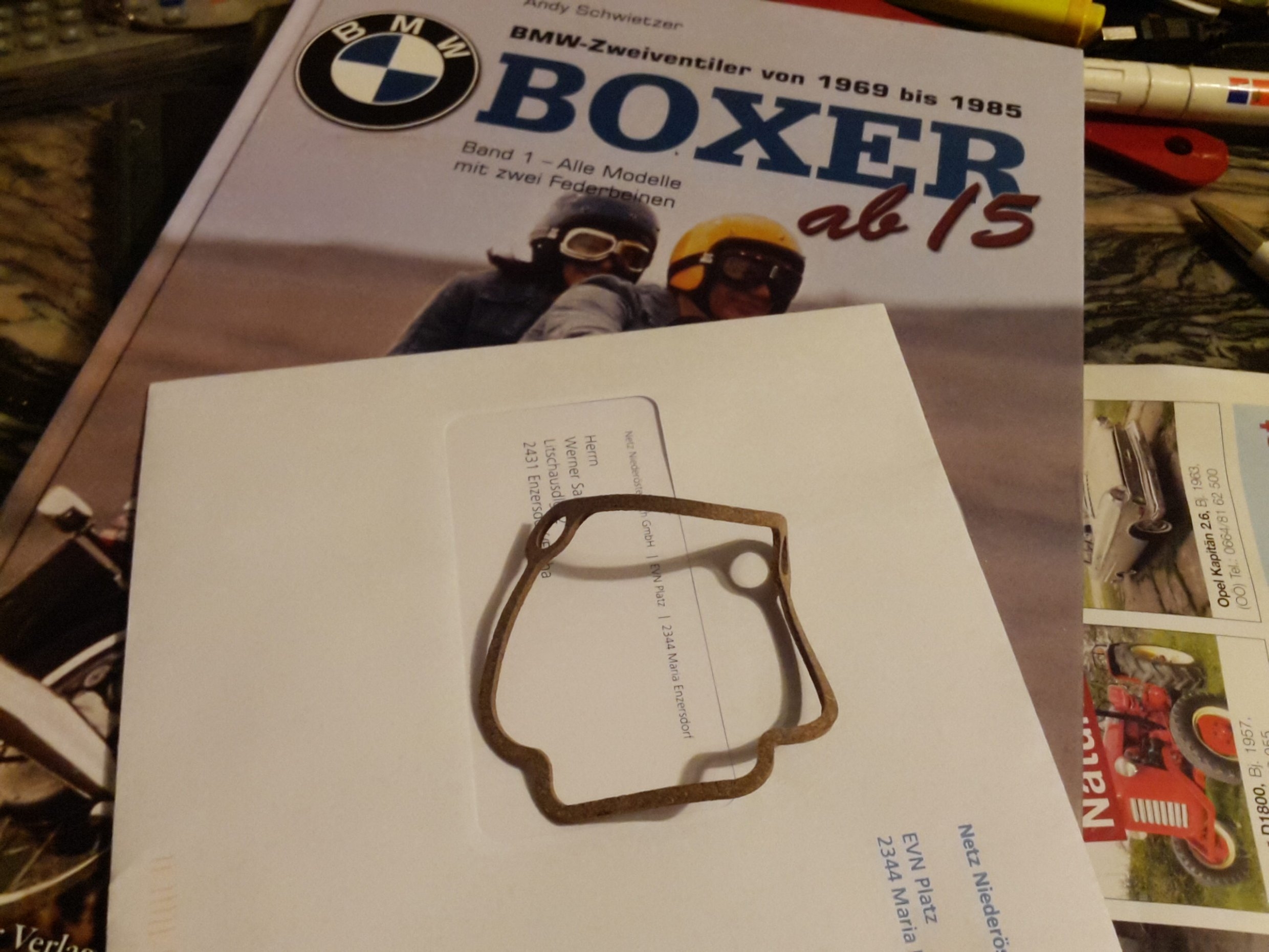 Ich kam also eben jetzt um 18.30 Uhr nach 7 1/2 h Babysitten heim und will von der Bayerischen, die ja jetzt so gut geht und täglich besser zu werden scheint, absteigen. Und siehe da, eine Öse der Wanderstiefel hat sich in den Schwimmerkammerhaltebügel des BING eingeklammert, der Sprit rinnt, die Kammer liegt unten, der Bügel ist verbogen und die Korkdichtung (vom Dezember 1986?) ist entzwei.
