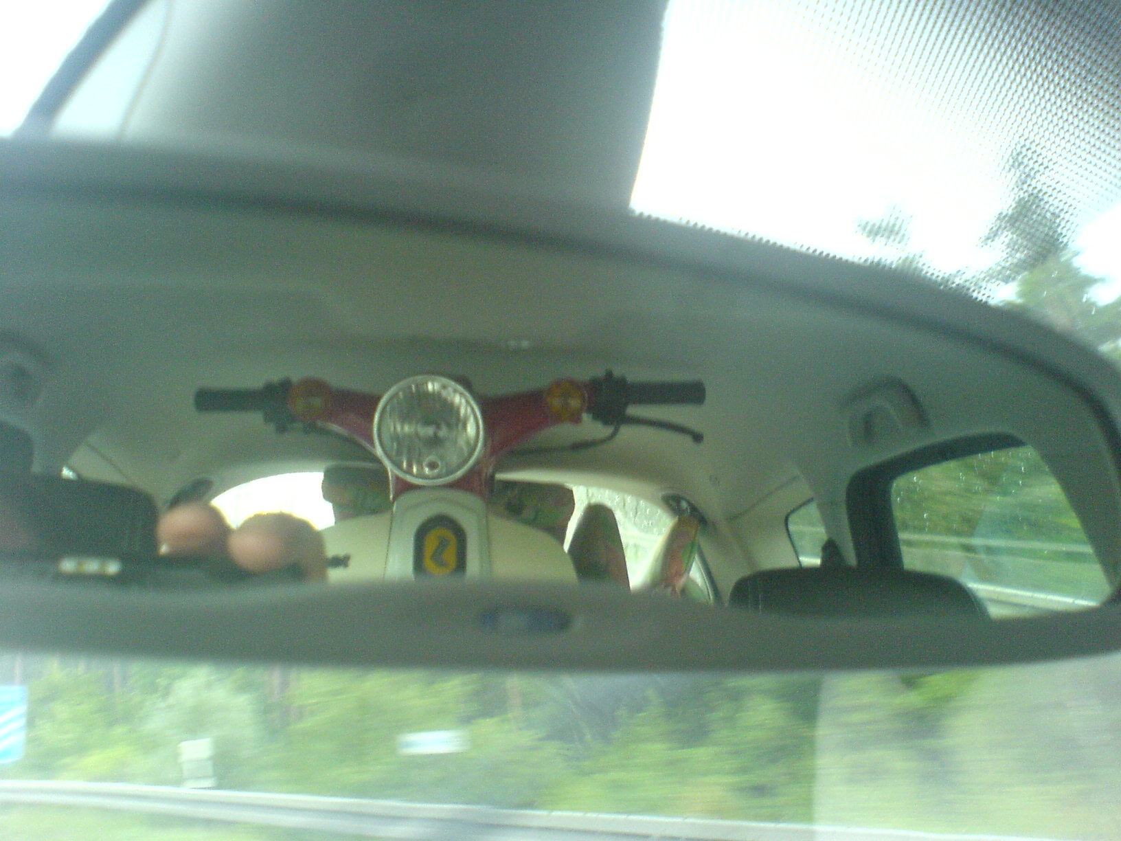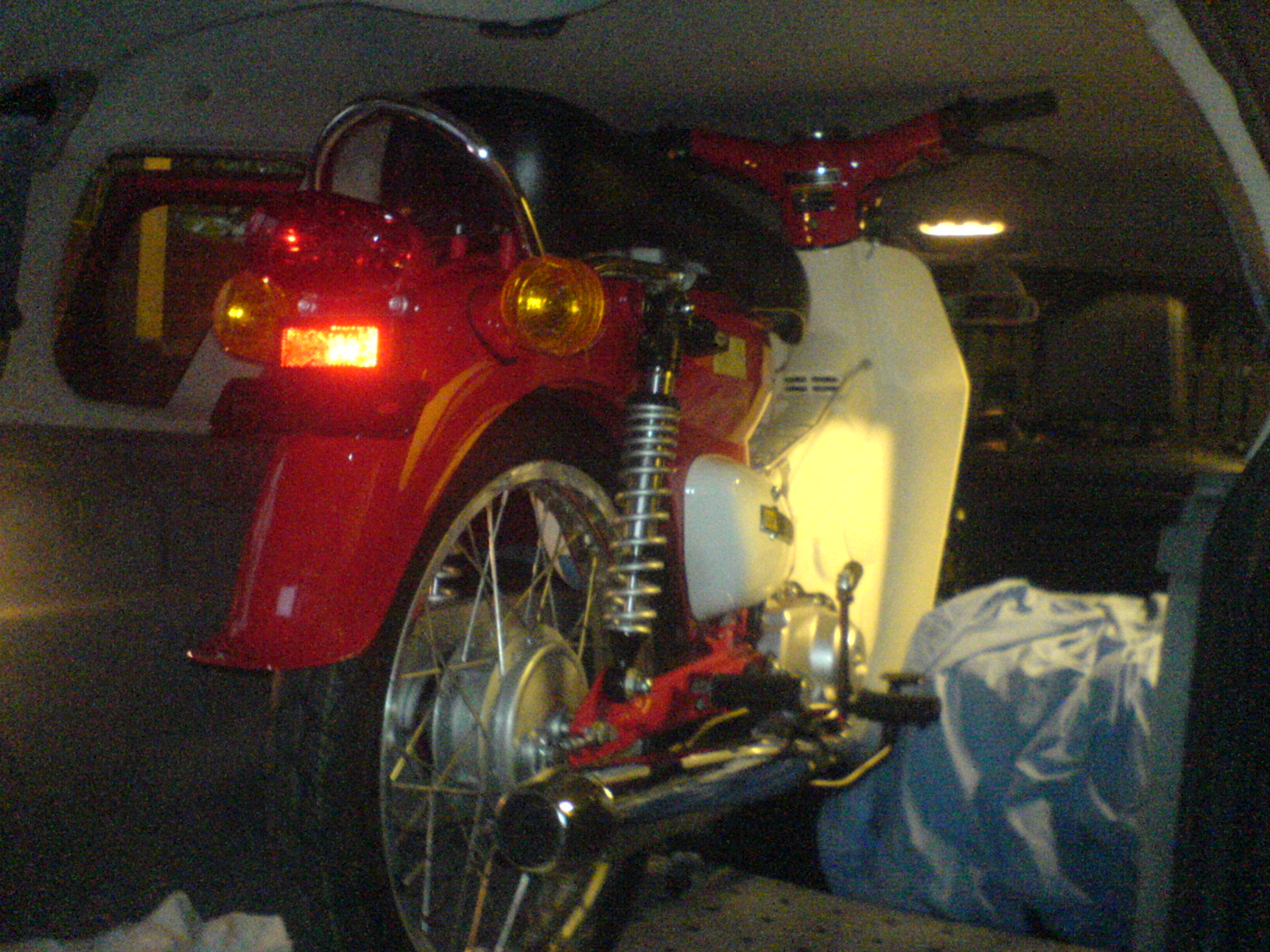 Ich musste dazu die Spiegel bei der Super abschrauben und sie diagonal in den Kofferraum schieben. Drinnen wieder aufrichten. Ich habe den hinteren mittleren Sitz demontiert. Die Lehnen der beiden äußeren Sitzen habe ich herunter geklappt, dazwischen hat das Moped optimal gehalten. Natürlich habe ich mit alten Gartenstuhl und Gartenliegepolstern das Ganze ausgepolstert und gesichert.