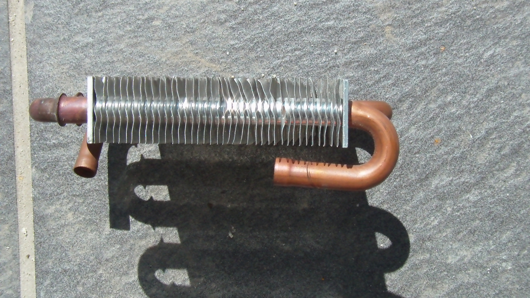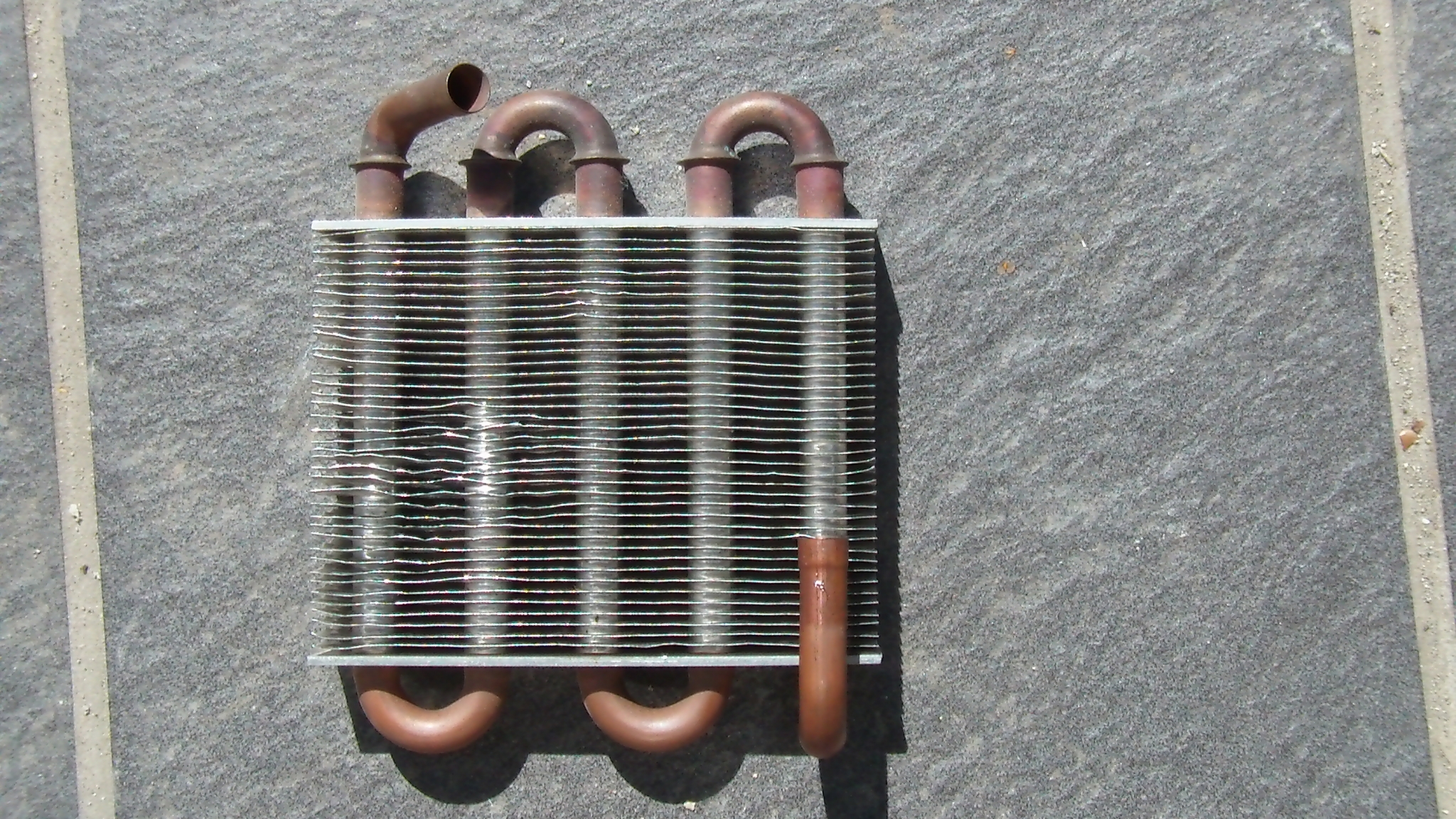 wenn du so etwas gebrauchen kannst, kannst du ihn gegen Erstattung des Portos haben. Die Maße: 12.5 cm breit und 10cm hoch, 2,5cm dick. Anschlüsse 10mm. Ist ein Wärmetauscher aus einem Sauerstoffkonzentrator.