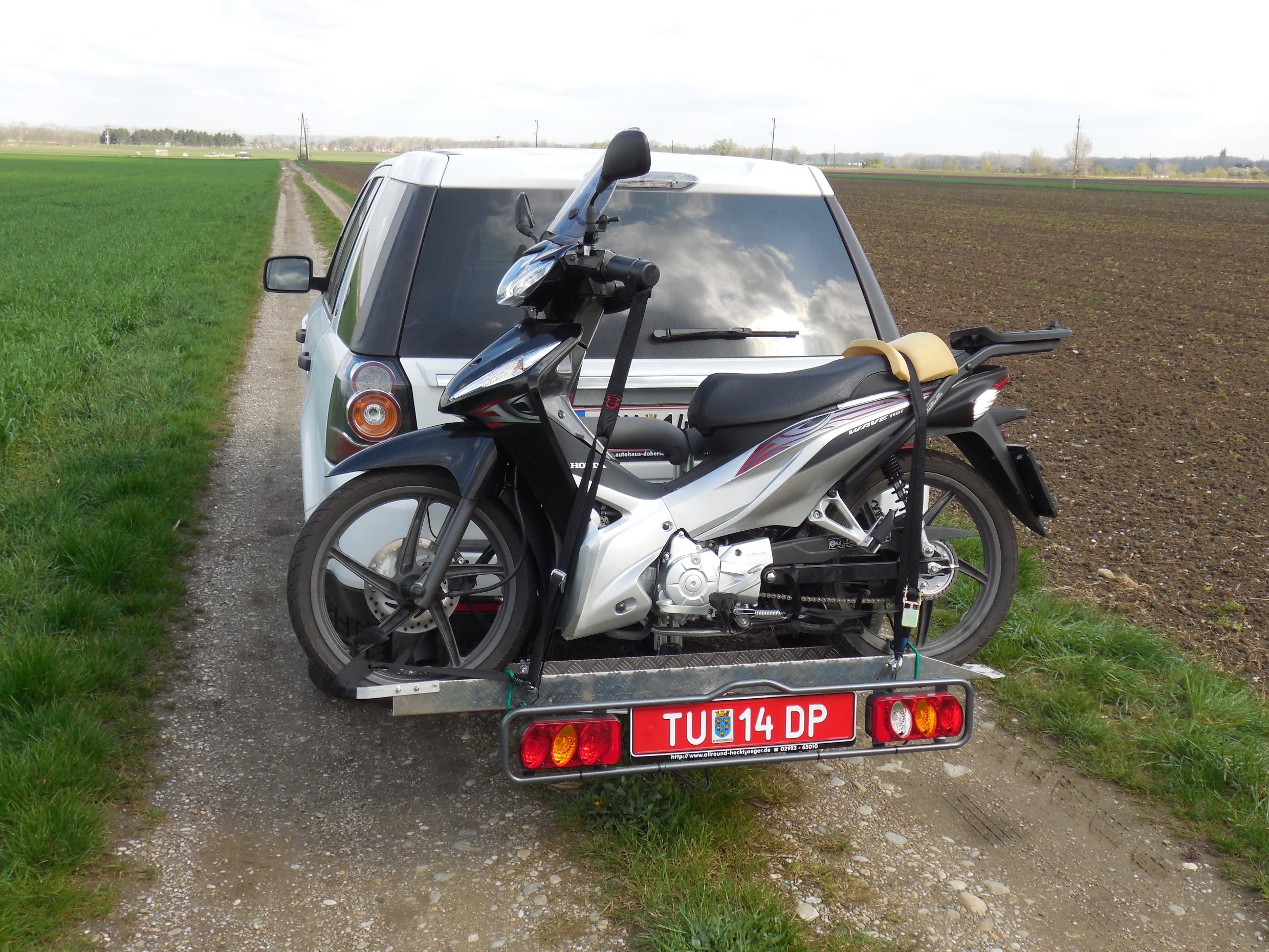 Wenn Du sowieso die Spiegel abbauen willst/musst, besorge Dir 2 stabile Winkeleisen und 2 laengere Spiegelschrauben (vielleicht gar nicht einmal noetig, musst es ausprobieren). Die Winkeleisen bleiben unter den Spiegelhalterungen und daran machst Du die Zurrgurte fest. Beim Einparken ins WoMo lockerst Du die Spiegelschrauben ein wenig, drehst die Spiegel seitwaerts und drehst sie wieder fest. Zurrgurt an die Winkeleisen und schon steht die CUB auch vorne felsenfest.