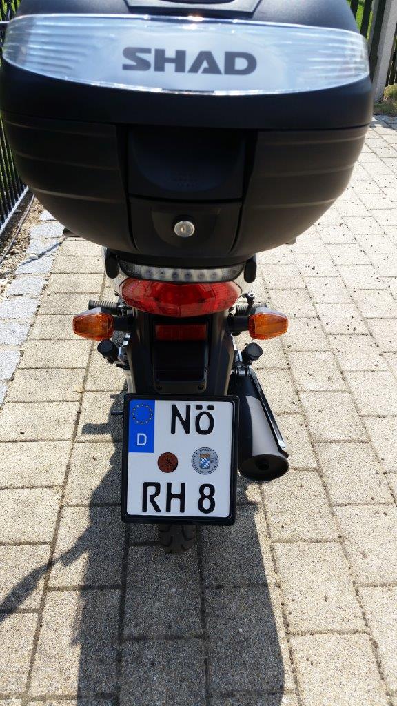 ich habe mich bewusst für ein kleines Motorrad-Kennzeichen entschieden. Nummer vorher online reserviert und mir das Kennzeichen vorher für 5€ prägen lassen. Ging vollkommen problemlos. Der Vorteil des Motorradkennzeichens ist, dass nicht jeder meint, in der Stadt überholen zu müssen.