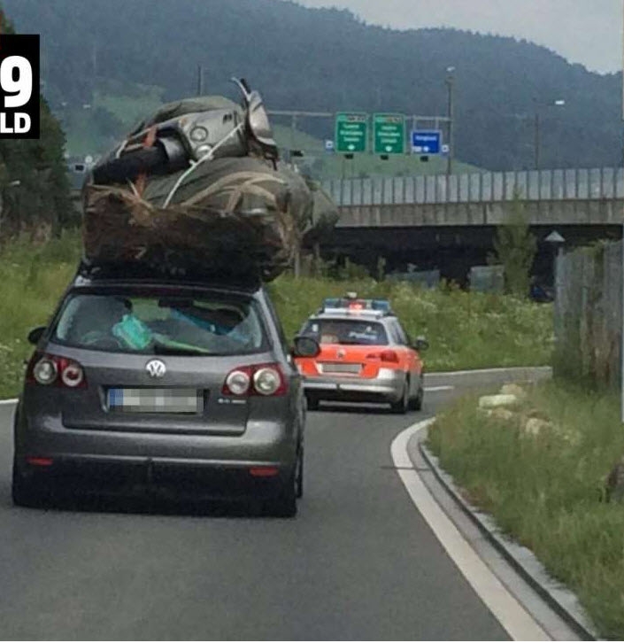 Aber sogar die Polizei war darob soviel Genialtät und Raumausnutzung erstaunt. Denn im Artikel steht folgendes: "Die Kantonspolizei Luzern hielt das überladene Fahrzeug bei Stansstad NW an und untersucht nun die kreative Konstruktion. "