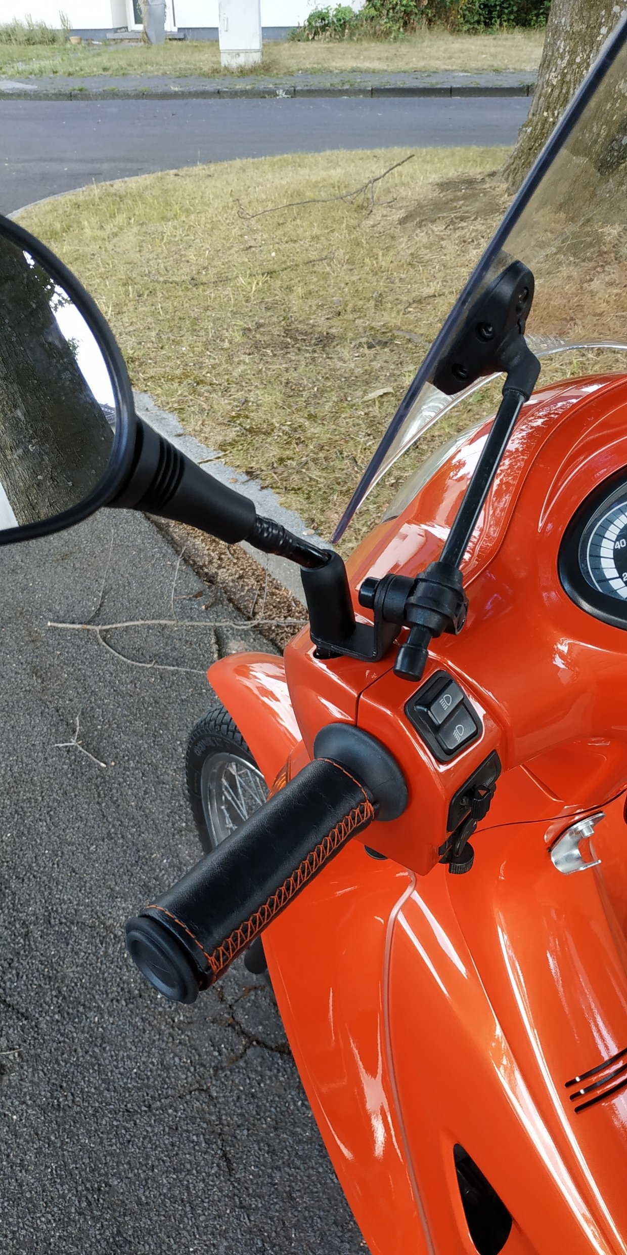 Die Scheibe verstellt sich nicht, ich bin auch 2x Schnellstraße gefahren und auch bei GPS Vmax 120km/h hat sich nichts verstellt. Aber die Scheibe wackelt/vibriert durch die Anströmung wie ein Lämmerschwanz. Sie steht, wie auf den Bildern zu erkennen, recht steil und mit einem Spalt zur Verkleidung/zum Scheinwerfer. Der Luftstrom trifft mich unterhalb des Helms auf der Brust - trotzdem ist die Inno mit Scheibe deutlich schneller und die neue Version sieht deutlich eleganter aus - bleibt also dran.