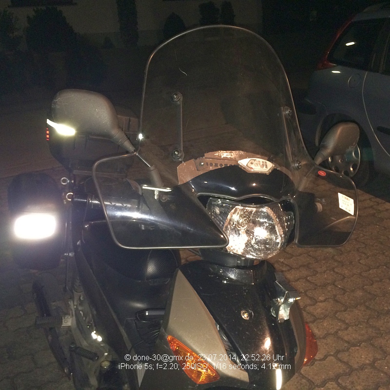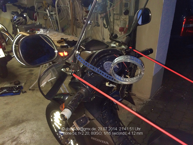 Start am Nachmittag mit leichtem Gepäck. Den Bereich über den Scheinwerfer hab ich mit einen Putzlappen ausgestopft und mit einem Streifen schwarzes Klebeband etwas abgedichtet. Die Scheibe bekam noch zwei weiße Reflexaufkleber verpasst. Ich habs gern, wenn ich im Straßenverkehr wahrgenommen werde. Kurzer Fotostop weiter im Süddeutschen drin. Scheibe entlastet den Oberkörper und die Finger im aktuellen Zustand schon ernorm, erzeugt jedoch viel Krach, wenn die Verwirbelungen genau aufs Helmvisier treffen. Strecke ich mich ein paar Zentimeter durch, dann ists besser. Bevor ich aber die Säge ansetze probiere ich noch ein paar andere Möglichkeiten des Anbaus.