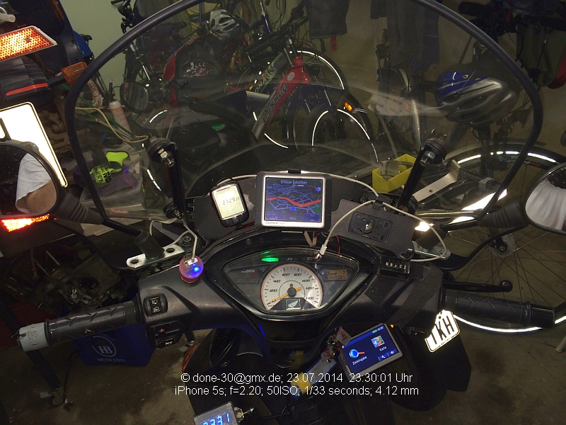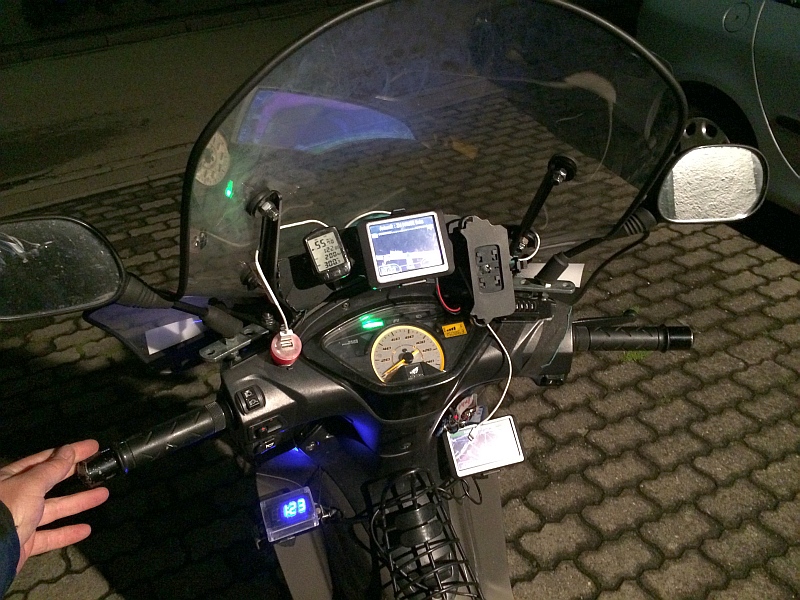 Vor der Rückfahrt durch die Nacht mit den provisorischen Cockpit:Drei navigationsfähige Geräte im Cockpit sind schon etwas overkill, aber die Blendwirkung ist tatsächlich gering. Der Putzlappen tat was er sollte, Eigenblendung durch Scheinwerfer war kaum wahrnehmbar. Einzig die etwas weit vorstehende Unterkante der Scheibe erzeugte an den Fahrbahnrändern einen noch ungewohnten seitlichen Schatten. Aber das serienmäßige Licht der Inno ist sowieso etwas fleckig.