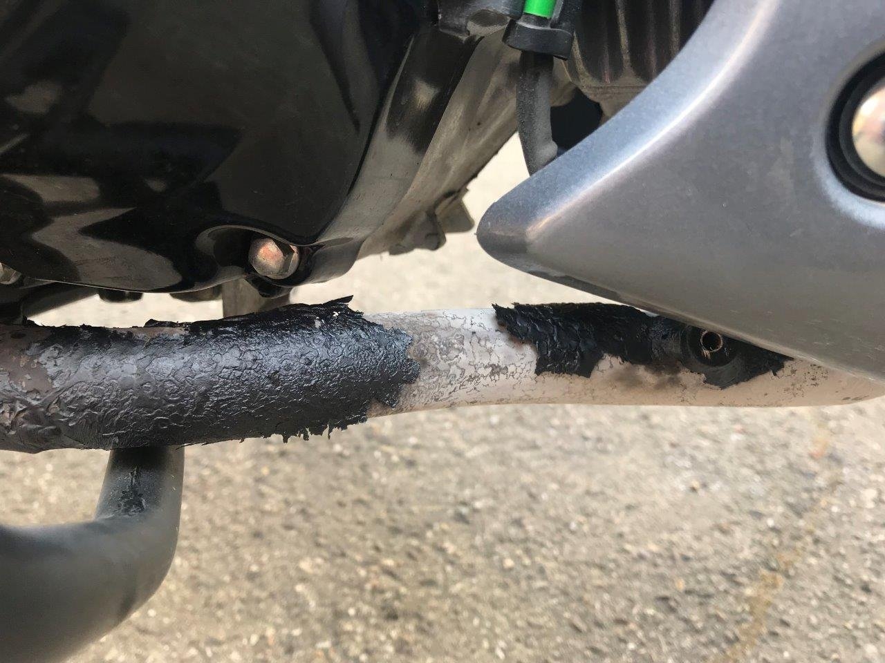Nach der ersten Fahrt sah der leider nur mit ungeeigneter (da überhaupts gar nicht hitzebeständiger) Farbe lackierte Krümmer so aus: