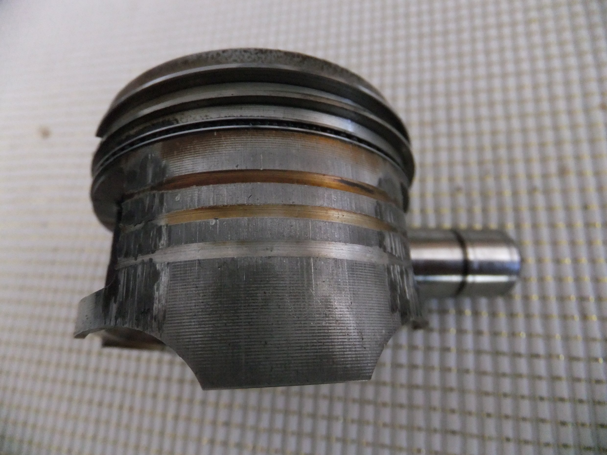 Der Motor war noch nie geöffnet und hat noch den 52,4 mm Kolben verbaut. Das Pleullager muss so kaputt sein dass es den Kolben regelrecht von einer Seite zur anderen drückte. Die 4 Fressspuren am Kolben zeigen das.