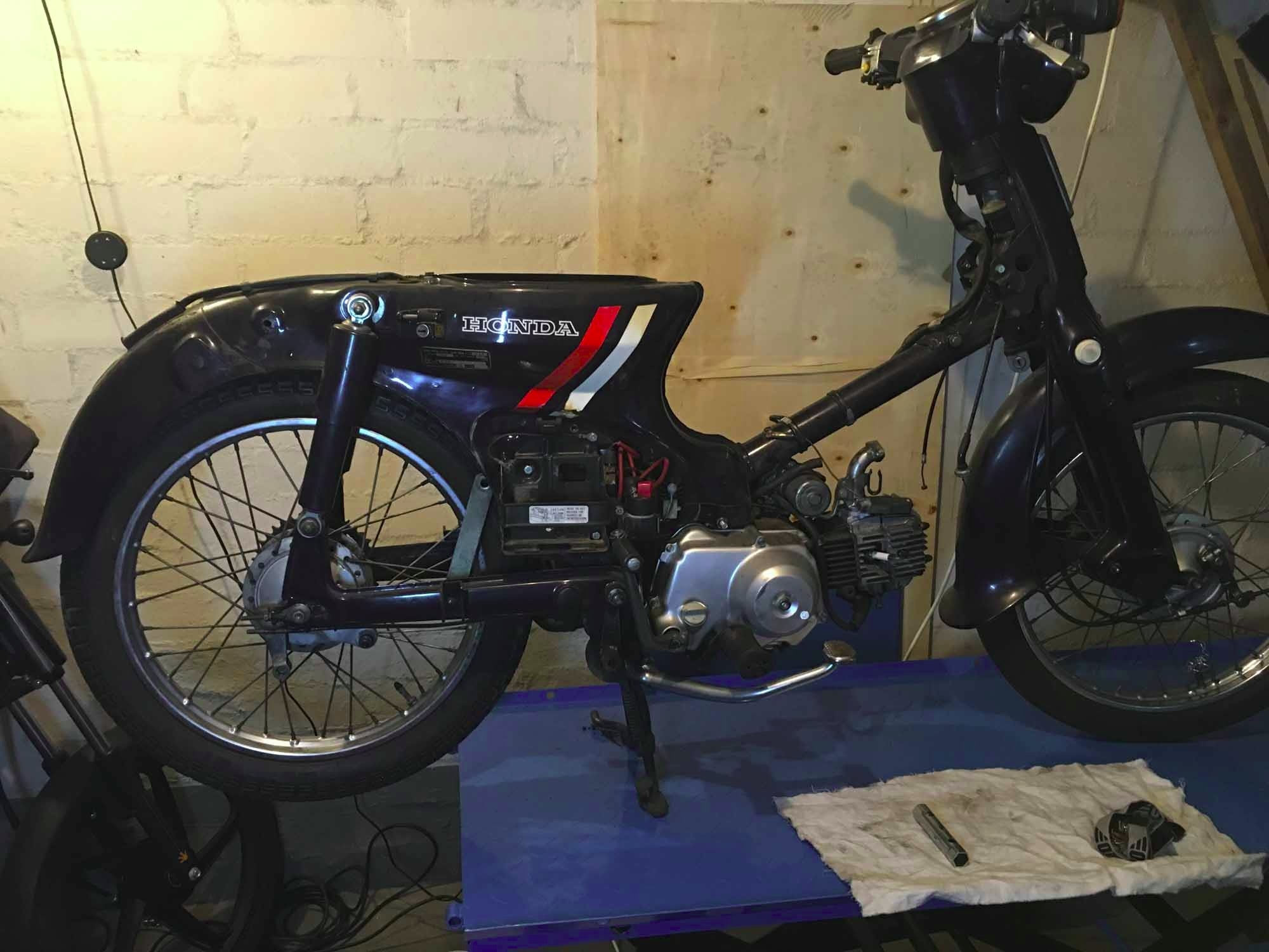 Nachdem ich bei CMSNL oder so ein par Teile bestellt habe konnte ich das Hinterrad wieder sauber einbauen, das Moped kann nun schon mal wieder rumgerollt werden. Habe dann aber noch weiter demontiert. Lampe, Gepäckträger, Vergaser, Auspuff, Kerze mal raus genommen, Loch in den Heck-Kotflügel gemacht.