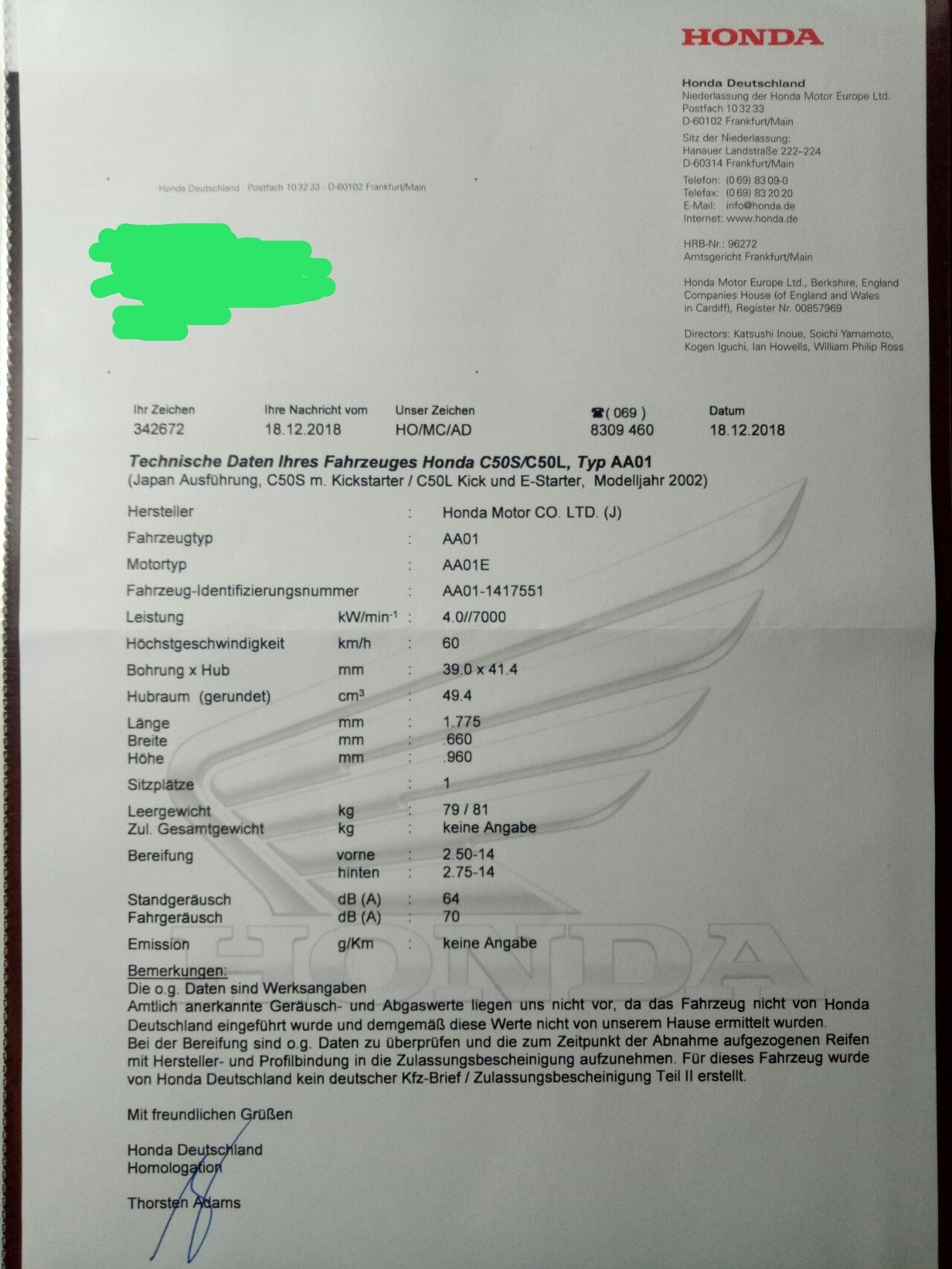 nach 3 Wochen schickte Honda mir dieses. So nun geht´s es weiter mit Tüv oder Dekra und erzählen, dass es sich hier um ein Umzugsgut oder? Ich muss wieder einlesen, lange keine Zeit für die Cub.