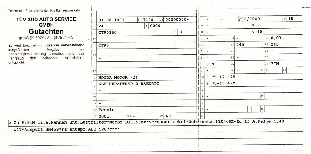Wieder einmal ohne Datenblatt von Honda. Nur ein altes Gutachten eines dieser Fahrzeuge vorgelegt.