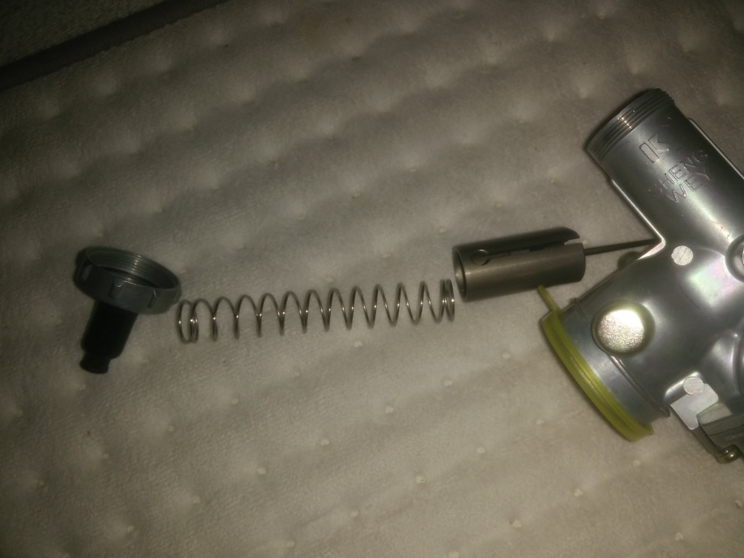 Der Gasschieber schaut ja ein bischen aus wie ein umgedrehtes Altbierglas (angeknabbert).Ist die Funktion der V-förmigen Haltefeder nur das Niederhalten der Nadel im Gasschieber?