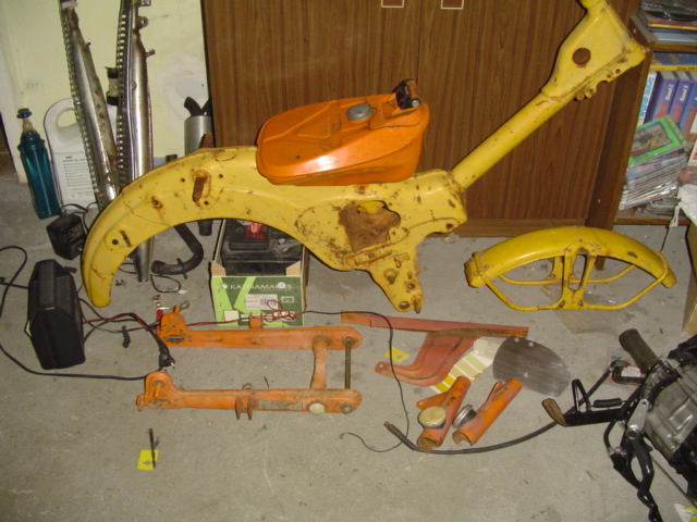 der Rahmen wurde sandgestrahlt, grundiert, weiß lackiert und dann mit RAL 1003 Gelb lackiert, anschließend das Typenschild (auf selbstklebenden weißen Papier ausgedruckt und doppelt ...) aufgeklebt, das ganze mit viel Klarlack versehen, Benzinfest versteht sich wohl von selbst.