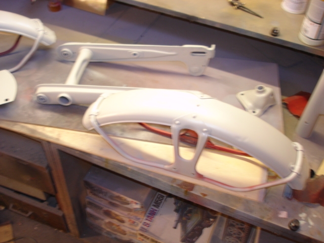 Rahmen, Kettenschutz, Schutzblech, Lampengehäuse, Lampenhalter gestrahlt grundiert und lackiert. RAL 4020 kam ziemlich nahe dran.