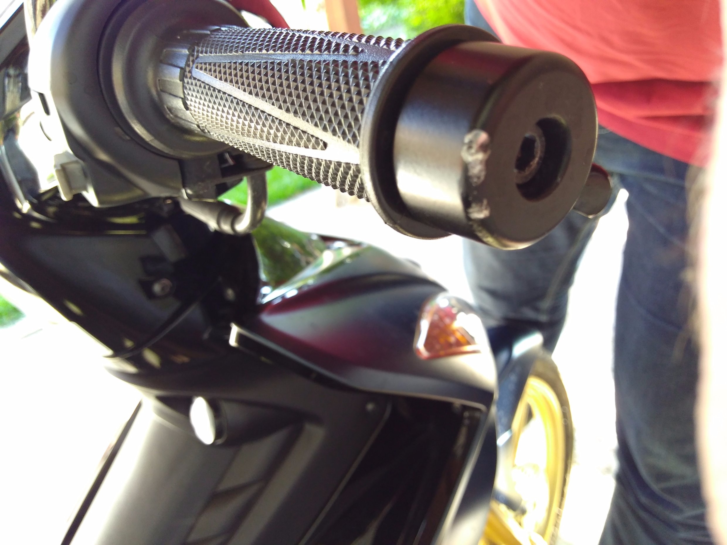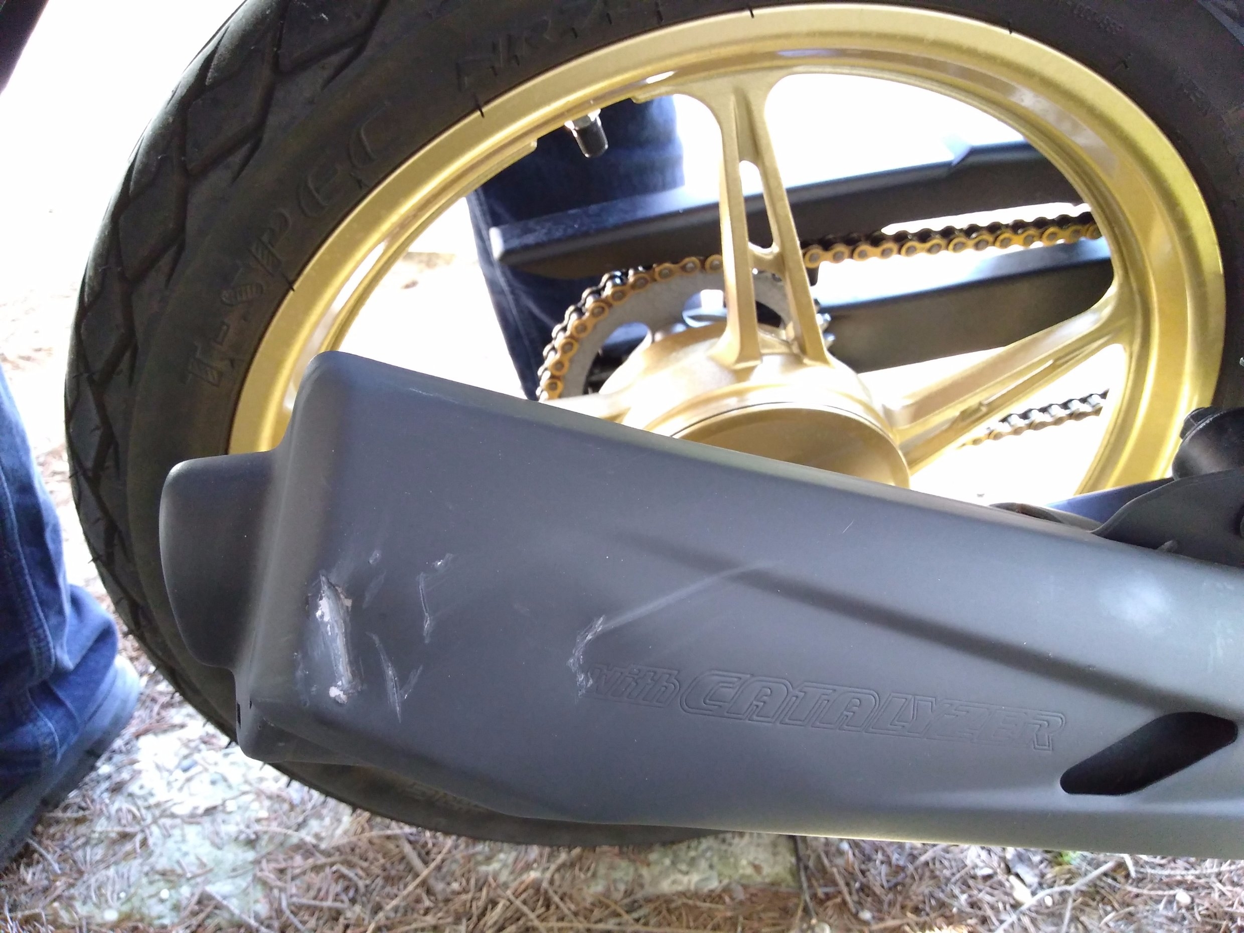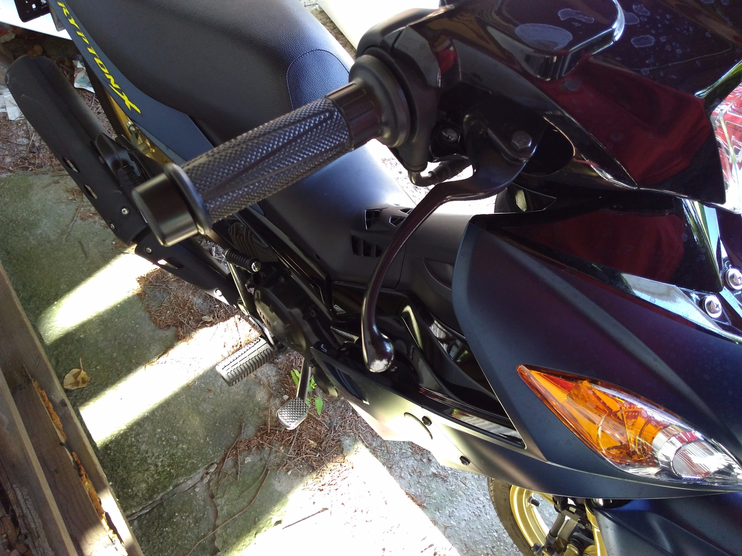 Allerdings weiß ich noch immer nicht ganz WIE. Hab sie aufgebockt, mich umgedreht und da lag sie dann 2 Sekunden später. Hauptständer nach wie vor ausgeklappt, sie ist mir also nich runtergesprungen. Ich verstehs nicht... Der Schaden hält sich allerdings in Grenzen. Bremshebel, Lenkergewicht und Hitzeschutzblech vom Auspuff. Rechter Fußraster etwas raufgebogen, ca. 1 cm wenns hochkommt. Den Fußraster hab ich nicht bestellt, den bieg ich wieder grade, alles andere kostet zusammen bei Yamaha original 19€, das find ich in Ordnung. Um den Preis richt ich das Moped gern wieder her.