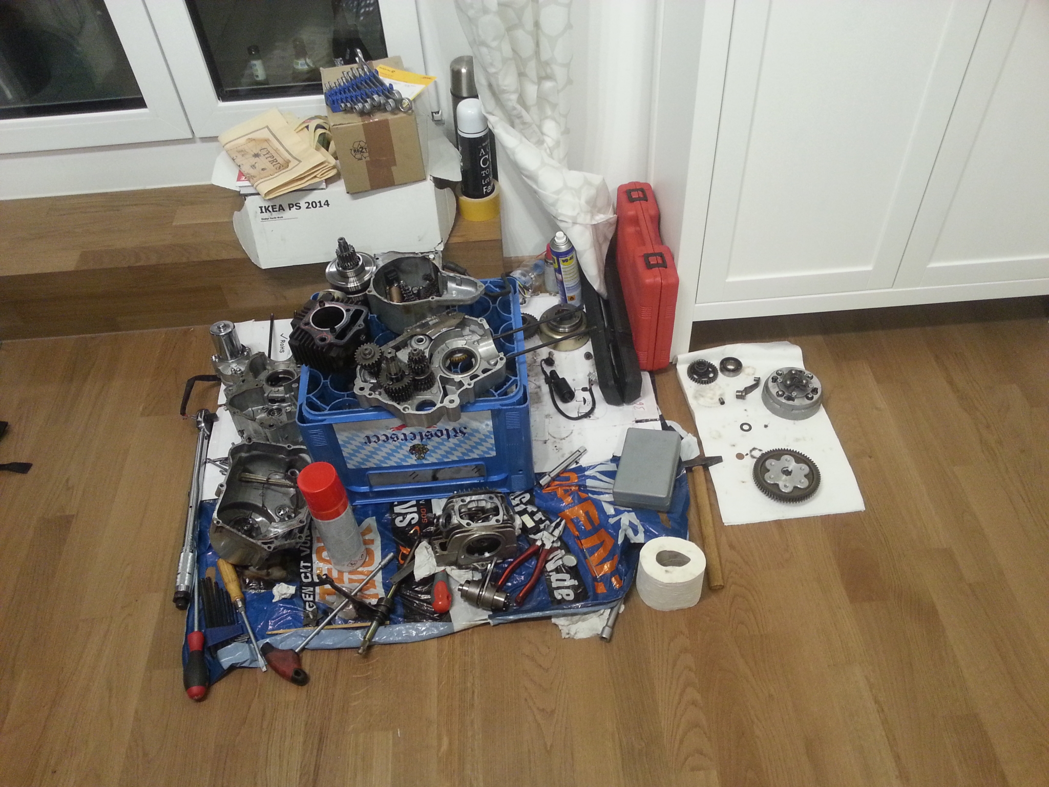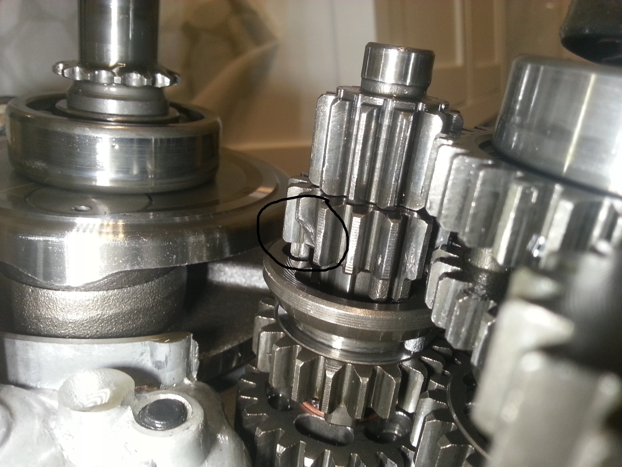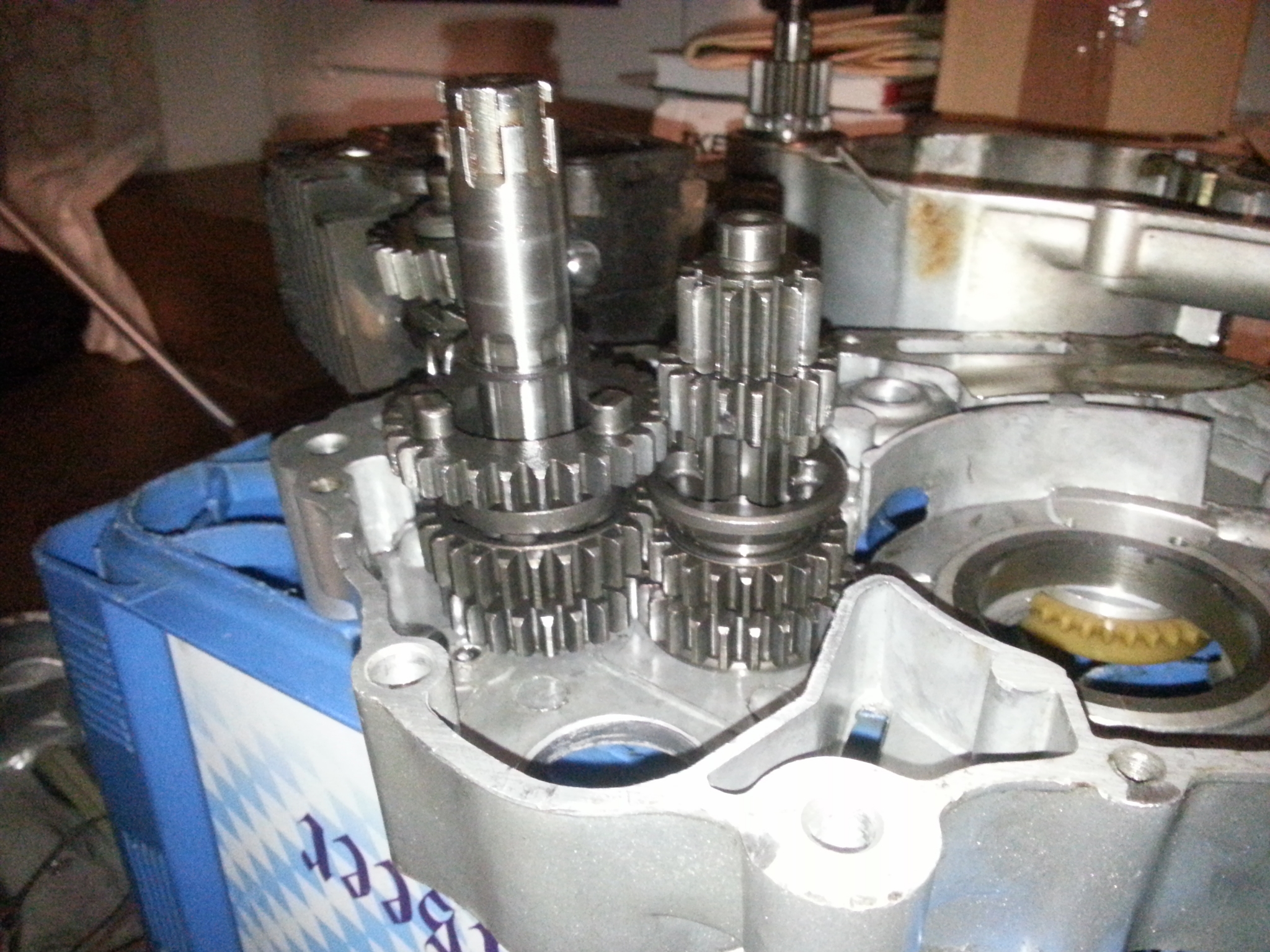 die Zahnräder schauen bis auf minimales Pitting ( viel weniger als eine 125er Duke nach 25.000KM) noch sehr gut aus, auch keine abgeriebenen Zähnräder wie es hätte zumindest ab einem paar sein müssen, da es ab und zu passiert ist, dass ich im 3. Gang hängen geblieben bin von 2. In den 4. Auch das knacken beim Schieben habe ich erst auf Zähnräfer geschoben die abrutschen weil Welle aus der Lage durch den Riss, aber da ist nichts zu sehen.