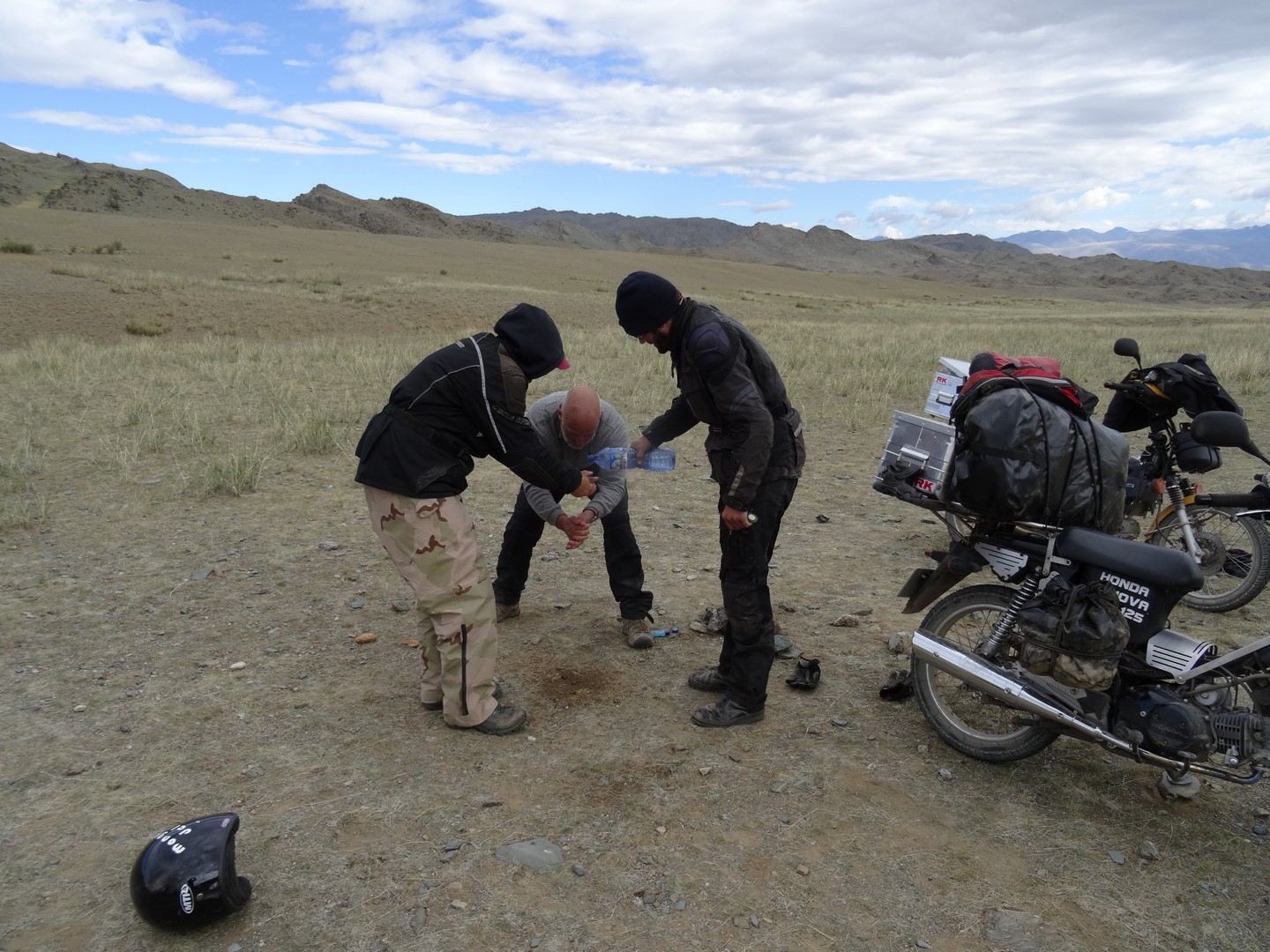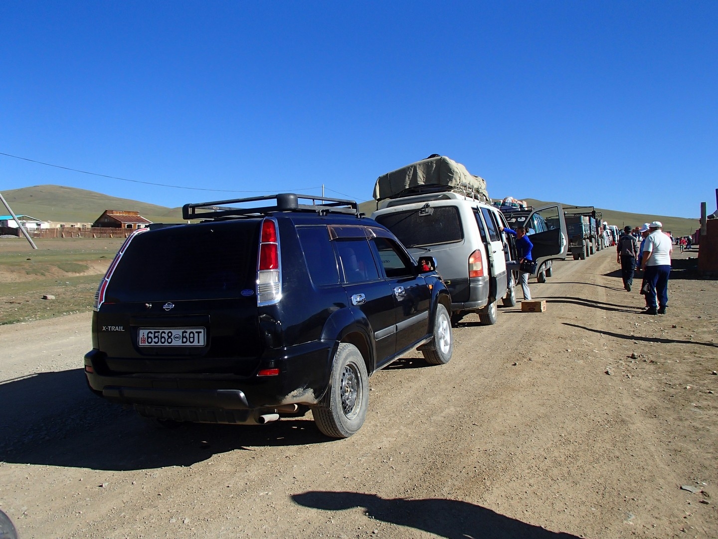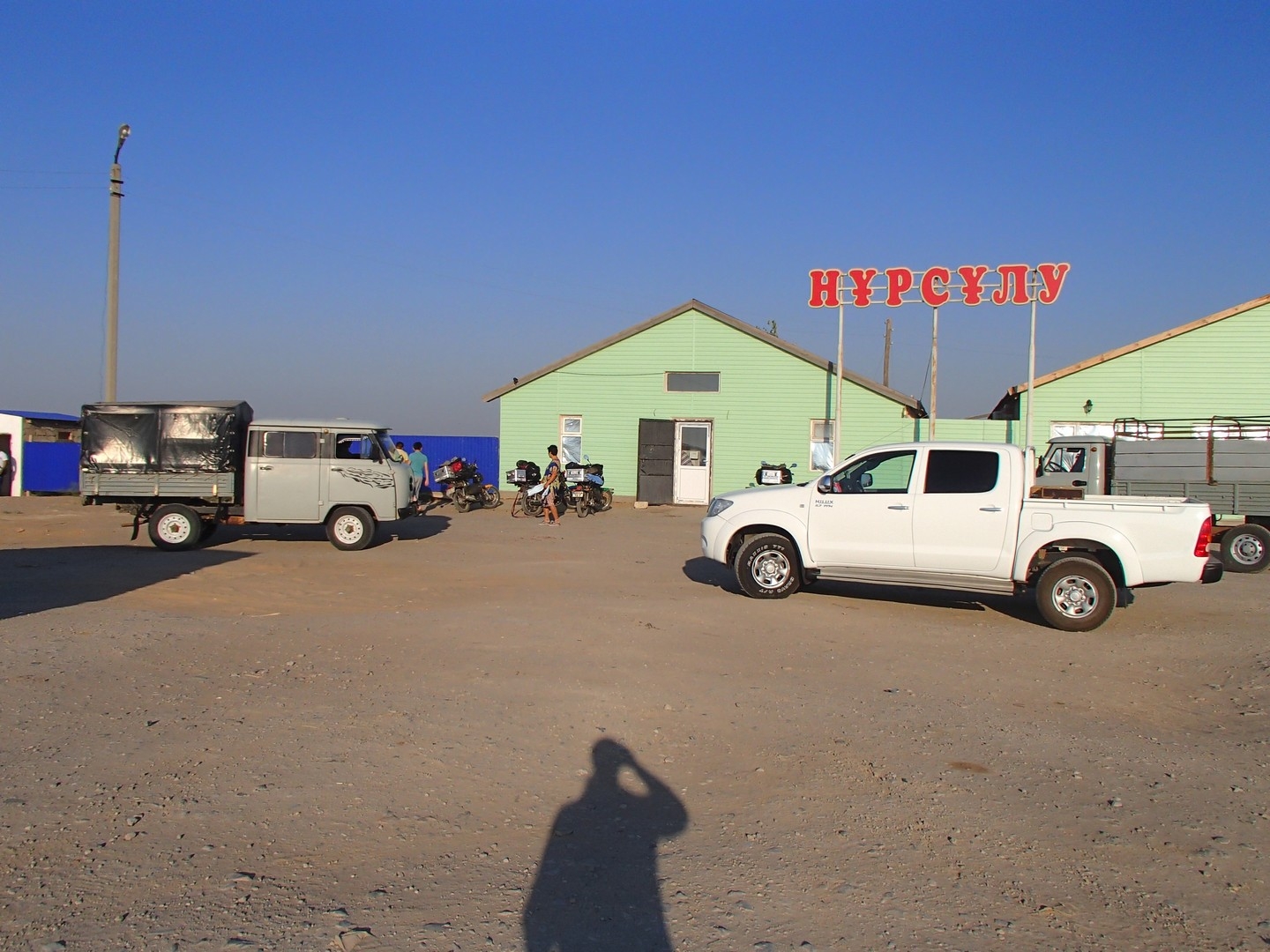 Als ich endlich alle meine Stempel hatte war es 17.30 Uhr und in 30 Minuten sollte die Abfertigung nach Russland für 36 Stunden schließen...ich raffte alle meine Papiere zusammen und wir rannten aus dem Gebäude. Da wir keine Wasservorräte mehr hatten schenkten uns die Belgier noch einen vollen 5-Liter-Kanister für den Fall dass wir wirklich nicht mehr nach Russland reinkommen (und natürlich auch nicht mehr in die Mongolei zurück!), so hatten wir wenigstens etwas Wasser zum trinken.