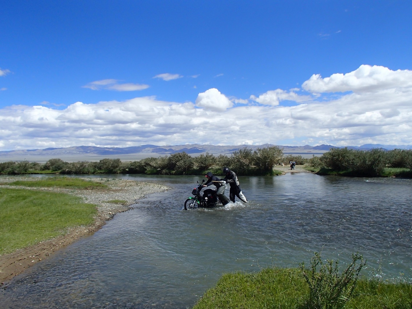 Marin blieb verschwunden, Janni und ich wollten keinen Umfaller im Wasser riskieren und schoben unsere beiden Mongos mit vereinten Kräften durch den Fluss: