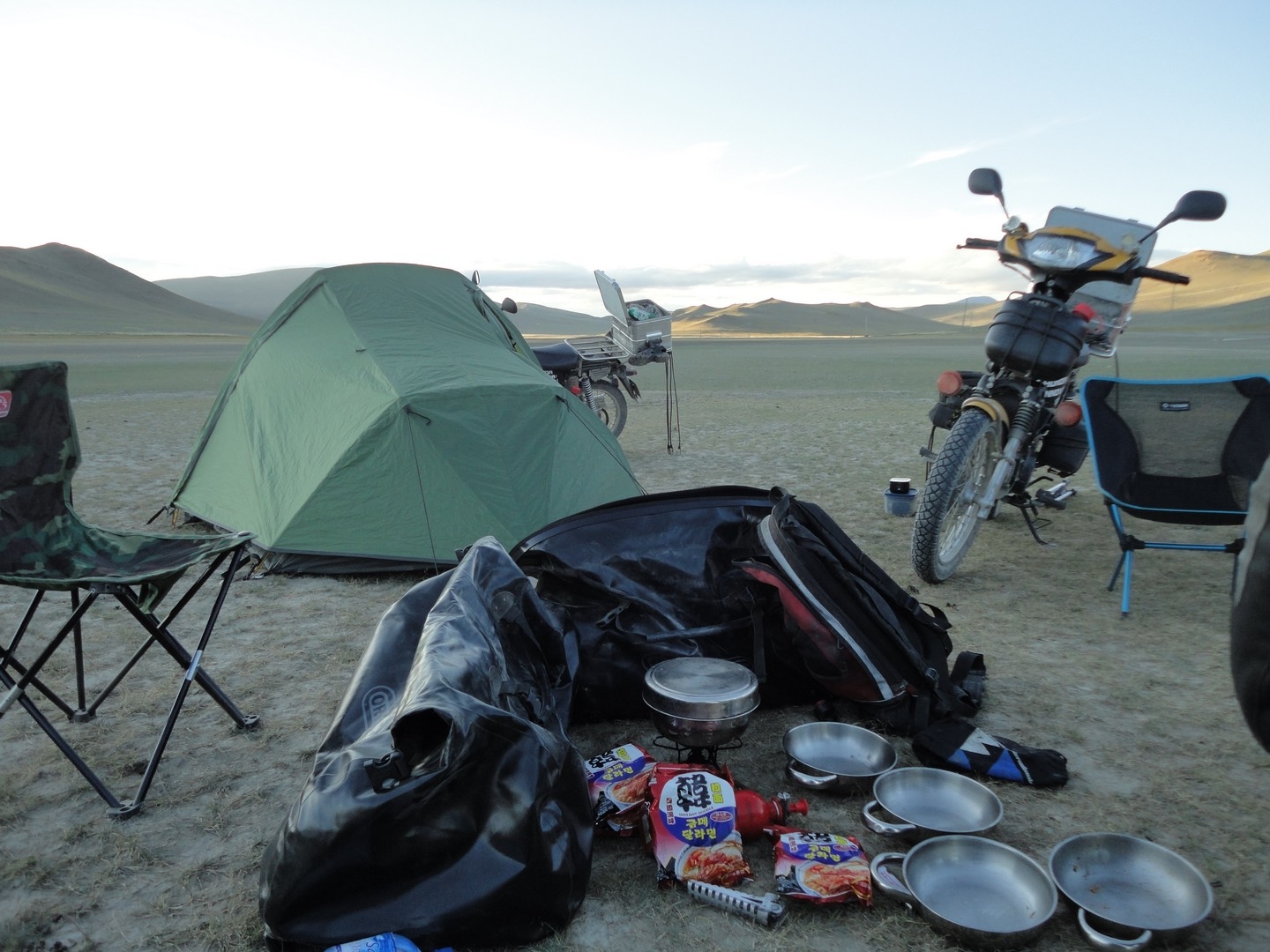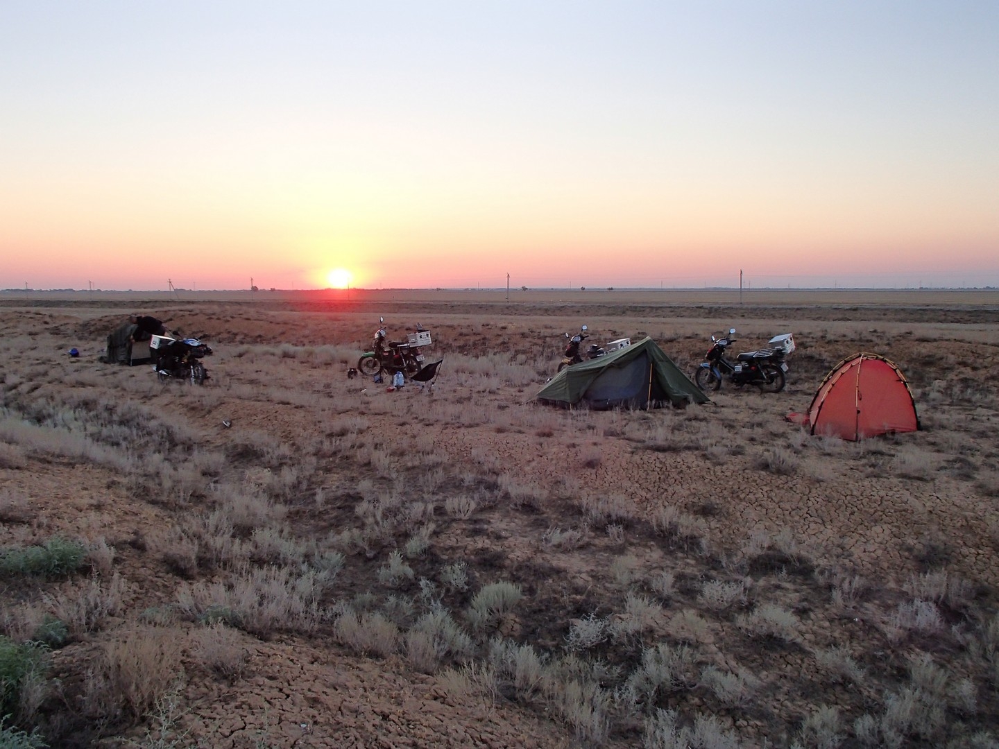 Wir tauschen noch unsere Erfahrungen aus und müssen dann schon wieder weiter und fahren noch bis zum Sonnenuntergang. So schaffen wir es trotzdem noch auf 190 Kilometer und sind alle fix und fertig. Unterwegs haben wir noch in einem kleinen Dorf ein paar Flaschen Bier kaufen können. Wir feiern das Wiedersehen vor dem Zelt und haben uns viel zu erzählen.