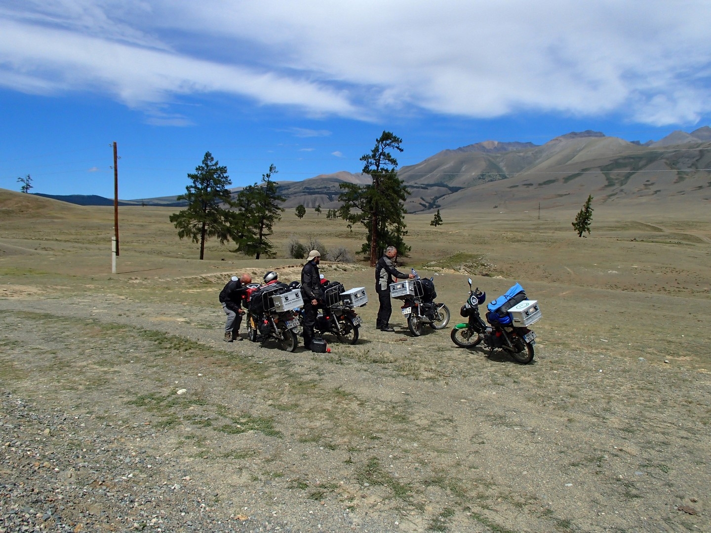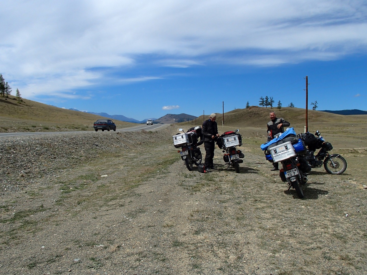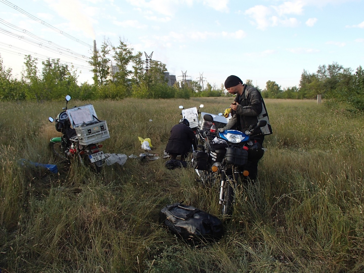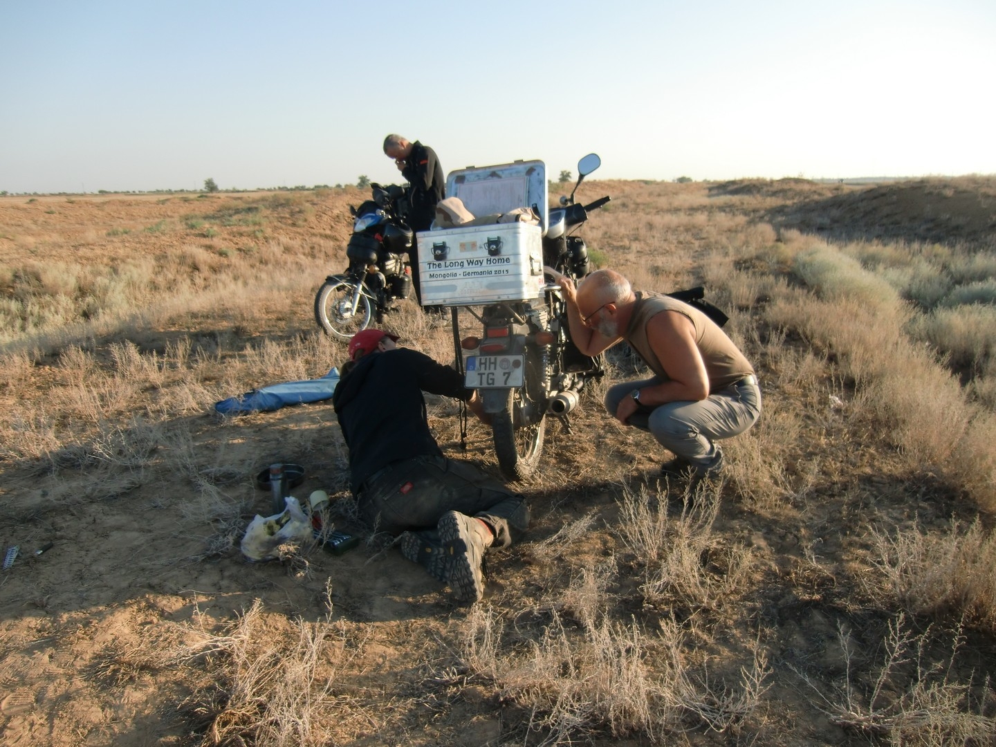Die erste Nacht auf Russlands Boden war sehr erholsam. Der Nervenkrieg gestern beim Grenzübergang hat Kraft gekostet. Wir hatten gestern Abend noch etwas auf unsere "Ankunft" in Russland angestoßen, die Erleichterung war allen anzumerken. Wir lagen zwar noch zeitlich einigermaßen im Plan, trotzdem wurde es jetzt auch mal endlich Zeit 'Kilometer zu machen'. Direkt hinter der Grenze fuhren wir auf Asphalt, und wir alle waren heiß drauf es mal wieder richtig laufen zu lassen. Über 2 Wochen waren wir jetzt mit der ultra-kurzen Übersetzung (55er Ritzel) unterwegs, sind trotzdem tagelang auf Schotter und im Tiefsand oft nicht aus dem 2. oder 3. Gang herausgekommen und abends stand nicht einmal ein 20er Schnitt auf dem Garmin. Das muss sich jetzt ändern, es war Zeit zum Umbauen angesagt... :mrgreen: