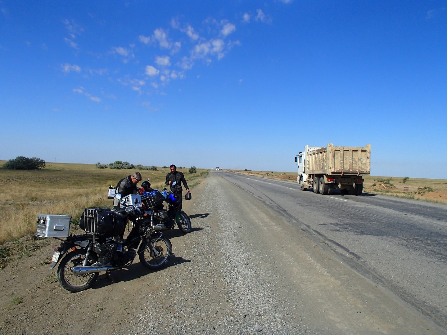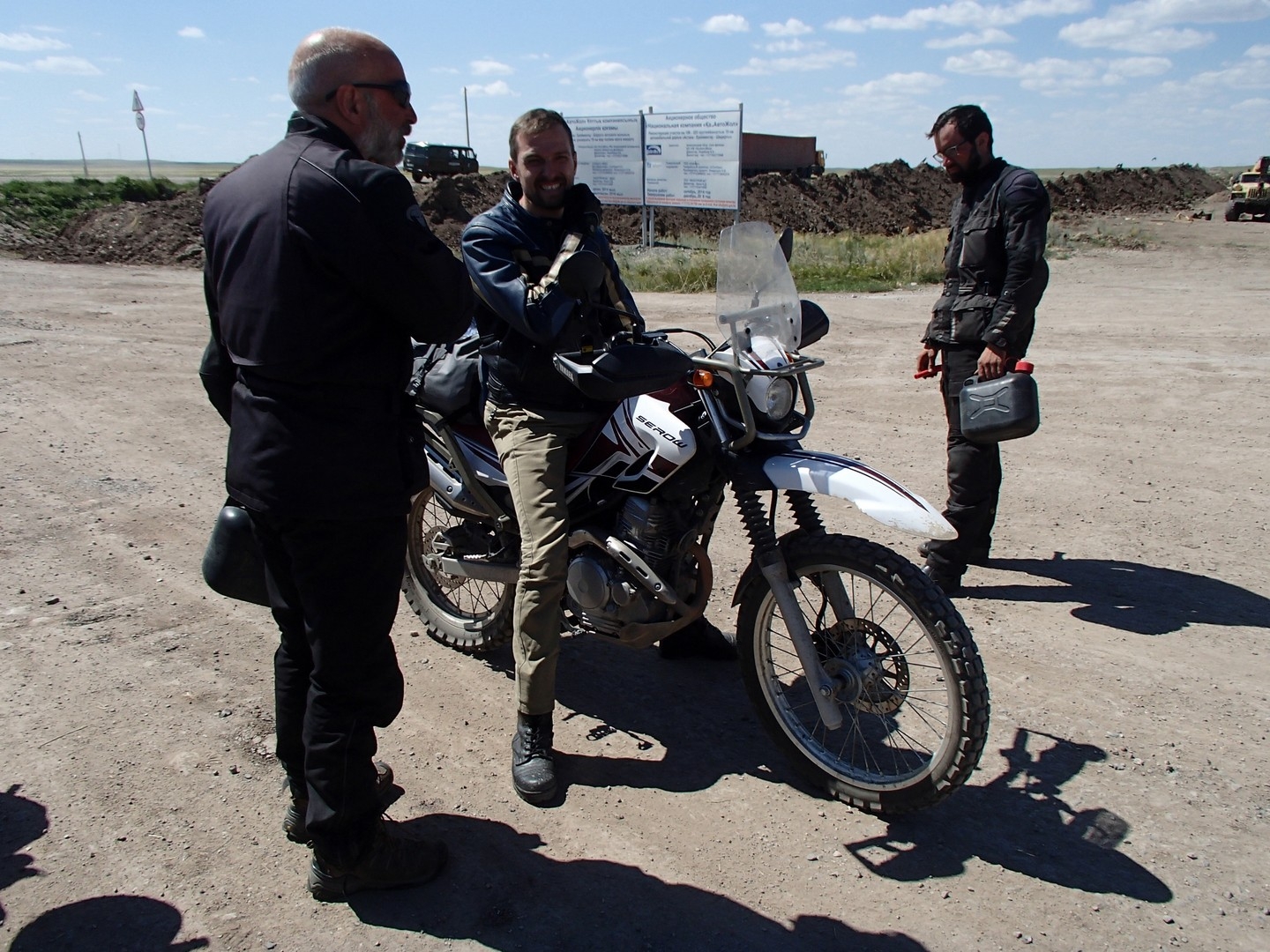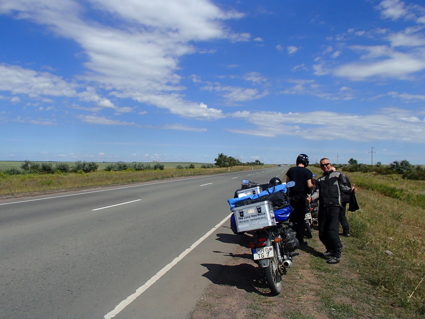 Martin musste losfahren, wir konnten ihm noch zurufen dass er sein Handy auf Empfang halten sollte und wir versuchen ihm die Infos zu besorgen. Wir 3 standen alleine da und konnten die Lage immer noch nicht begreifen. Nach kurzem Beratschlagen wollten wir wie geplant jetzt erst einmal nach Astrachan weiterfahren, dort ein Hotel suchen um im Internet zu recherchieren und Jannis Mongo wieder flott zu bekommen. Die hing ja immer noch am Spanngurt, diesmal hinter Reinhards Mongo. Jetzt heißt es die Nerven zu bewahren...