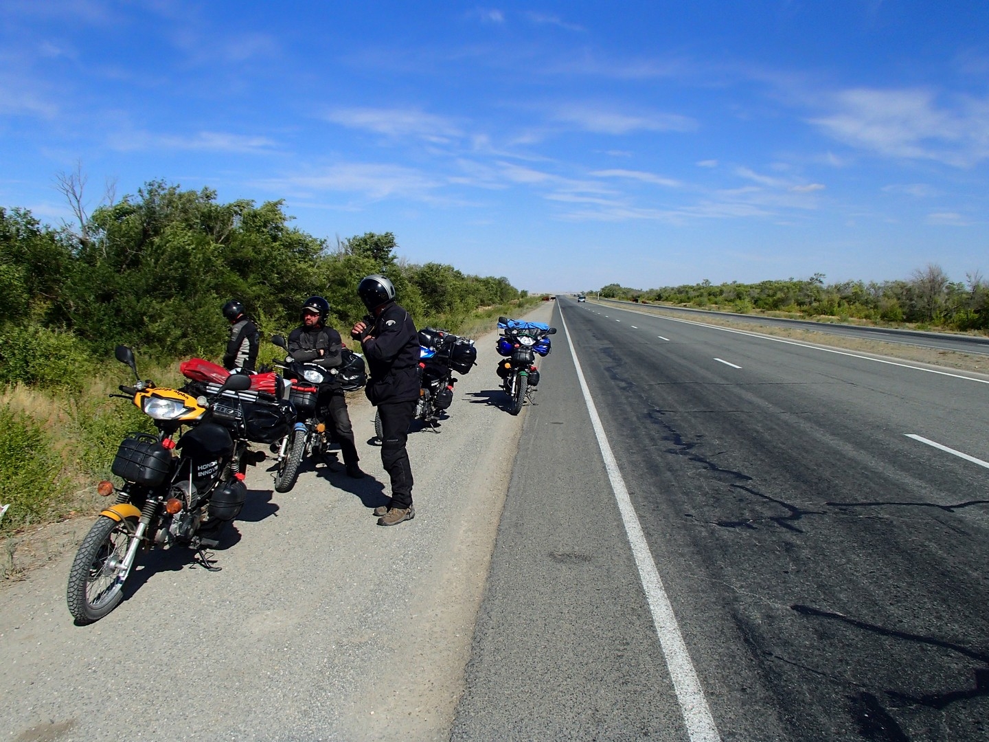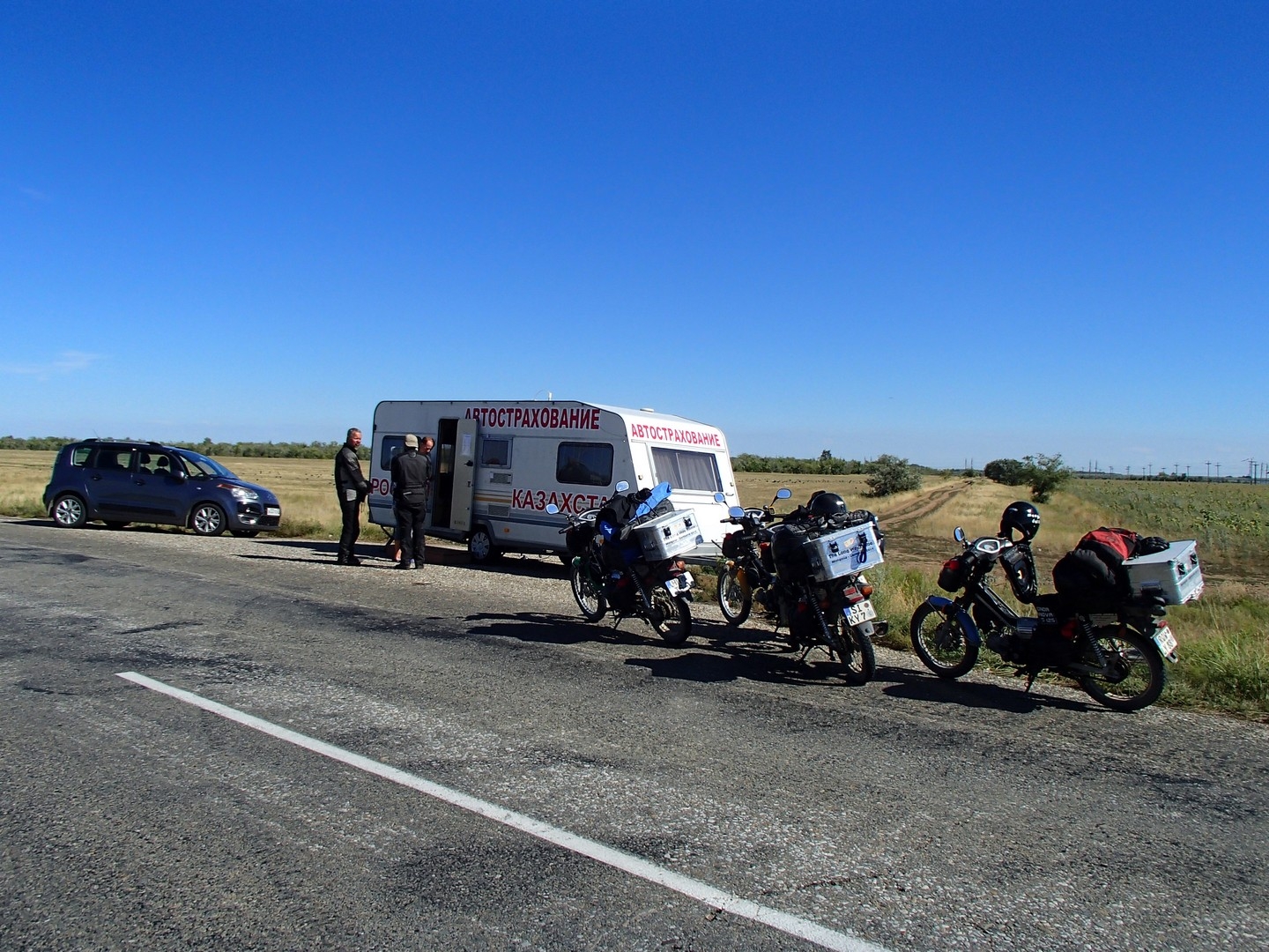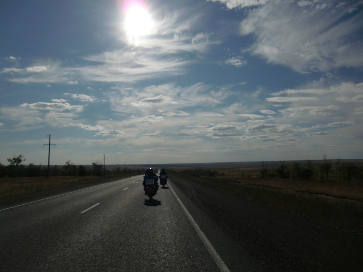 Martin musste losfahren, wir konnten ihm noch zurufen dass er sein Handy auf Empfang halten sollte und wir versuchen ihm die Infos zu besorgen. Wir 3 standen alleine da und konnten die Lage immer noch nicht begreifen. Nach kurzem Beratschlagen wollten wir wie geplant jetzt erst einmal nach Astrachan weiterfahren, dort ein Hotel suchen um im Internet zu recherchieren und Jannis Mongo wieder flott zu bekommen. Die hing ja immer noch am Spanngurt, diesmal hinter Reinhards Mongo. Jetzt heißt es die Nerven zu bewahren...