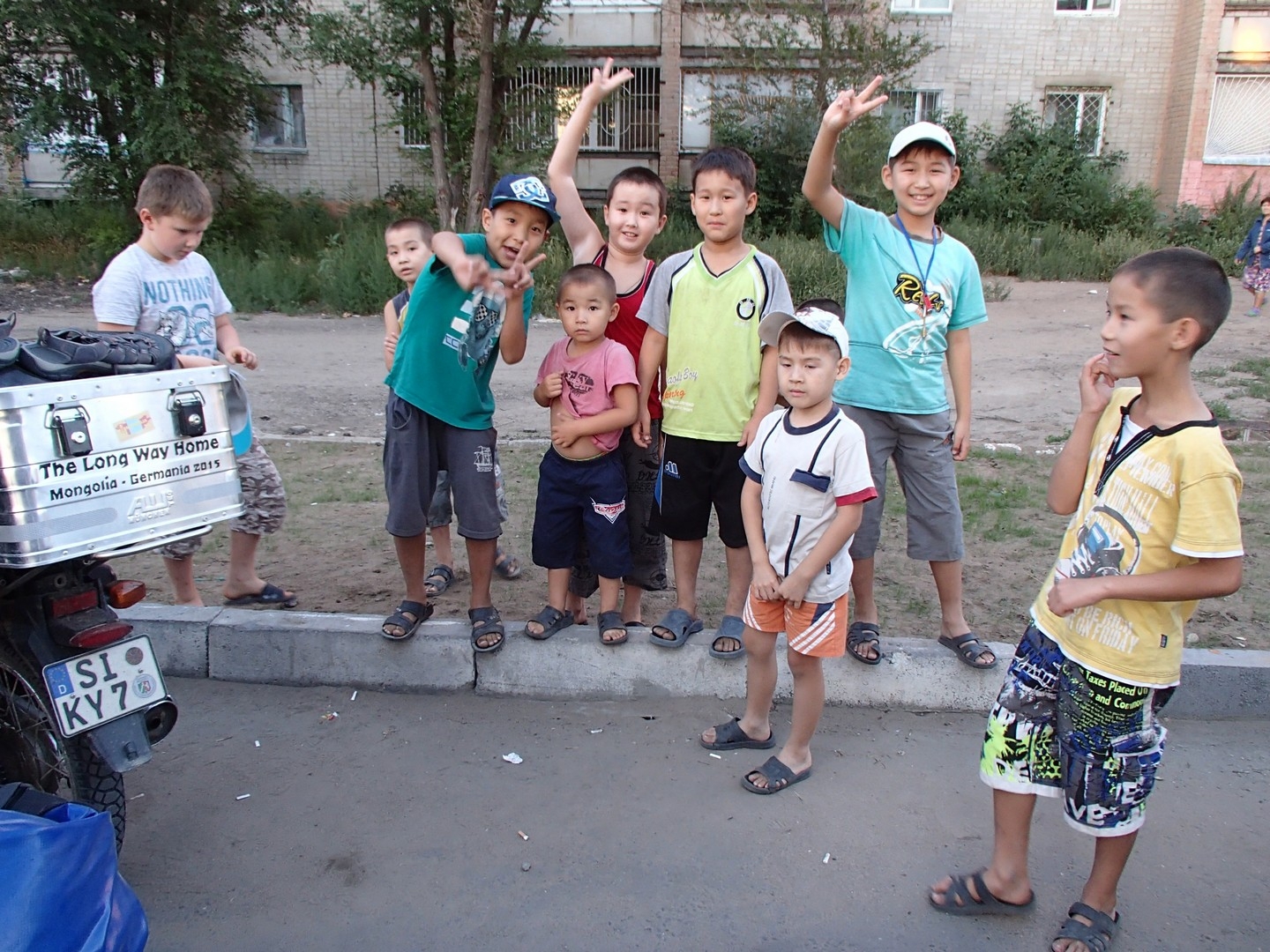 Sofort sind wir umgeben vom üblichen Gesindel welches sich an den Grenzen immer rumtreibt. Wir sind die einzigen Europäer weit und breit, sonst nur Mongolen, Russen und Kasachen. Wir halten Mopeds und Gepäck genau im Auge und bekommen direkt Besuch von einer uniformierten Frau, vermutlich eine der Zöllnerinnen. Was sie genau von uns will konnte selbst Reinhard mit seinen Russisch-Kenntnissen nicht herausfinden. Wir vermuteten dass sie wissen wollte wieviele mongolische Tögrök wir noch haben und dass wir sie bei ihr umtauschen müssen. Jedenfalls hielt sie mir einen Taschenrechner unter die Nase wohl mit dem Wechselkurs. Da die ganzen Papiere auf meinen Namen liefen ging ich mit unserem restlichen mongolischen Scheinen mit ihr mit...aber nicht in die Zollbaracken sondern ca. 1 km entfernt bis zu ihr nach Hause :o Dort tauschten wir dann das Geld und es ging wieder zurück zur Grenze. Wahrscheinlich eine lukrative Art ihr spärliches Zöllnergehalt aufzubessern (der Kurs war aber voll OK wie wir später in Ruhe nachgerechnet haben).