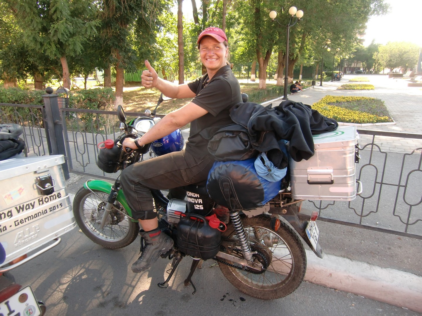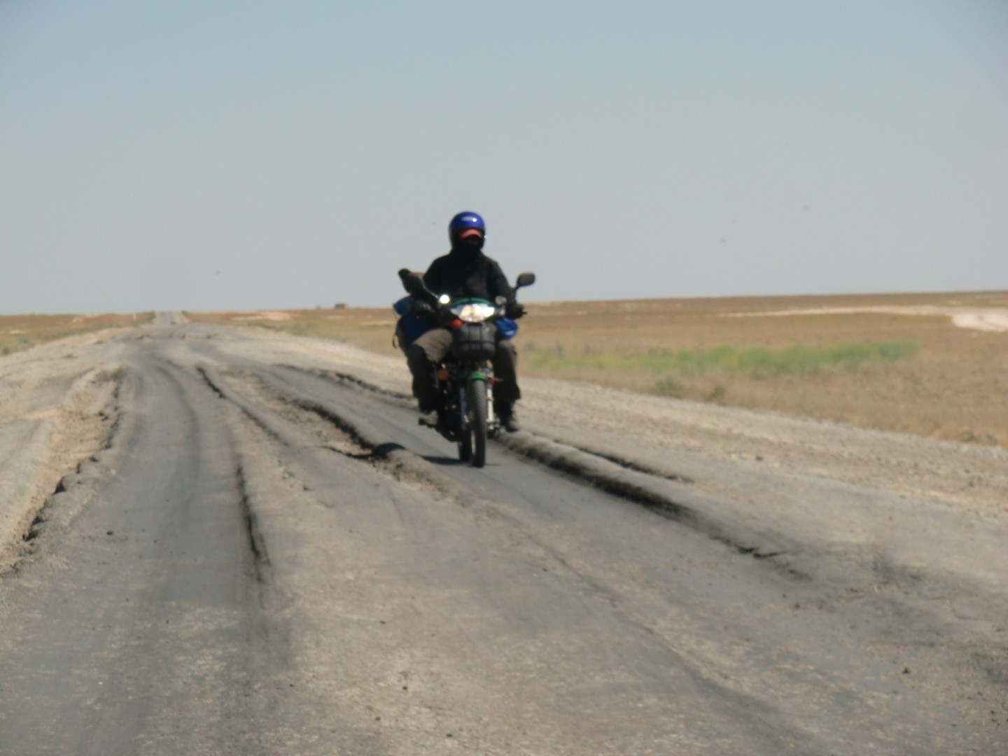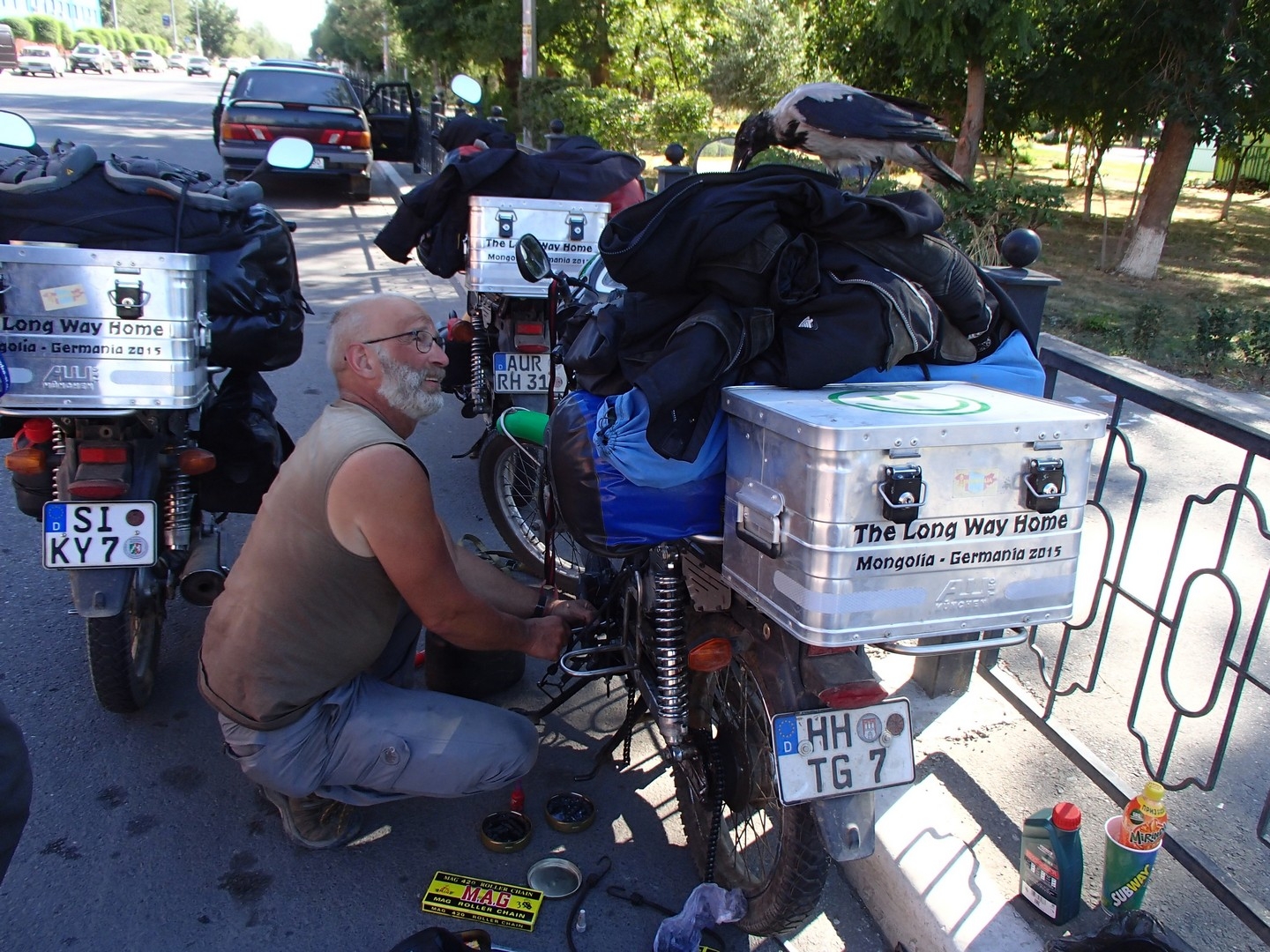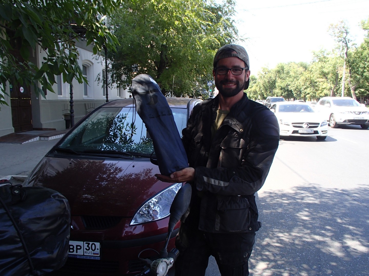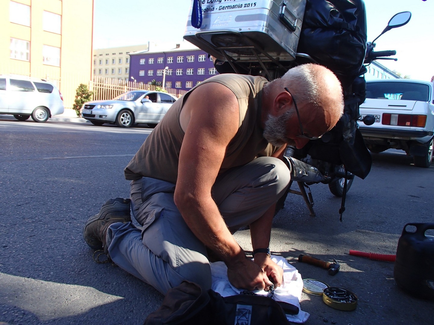 Martin war bereits in Uralsk, hatte sich dort ein Hotelzimmer genommen und war schon früh morgens beim dortigen Konsulat. Wenn alles dort nach Plan läuft sollte er am Nachmittag gegen 15 Uhr sein Visum abholen können. In der Zwischenzeit ließ er seinen Gepäckträger schweißen, der tiefe Fall bei fast voller Fahrt in ein ca. 1 Meter Durchmesser großes Schlagloch auf der kasachischen Straße hatte seine Spuren hinterlassen: