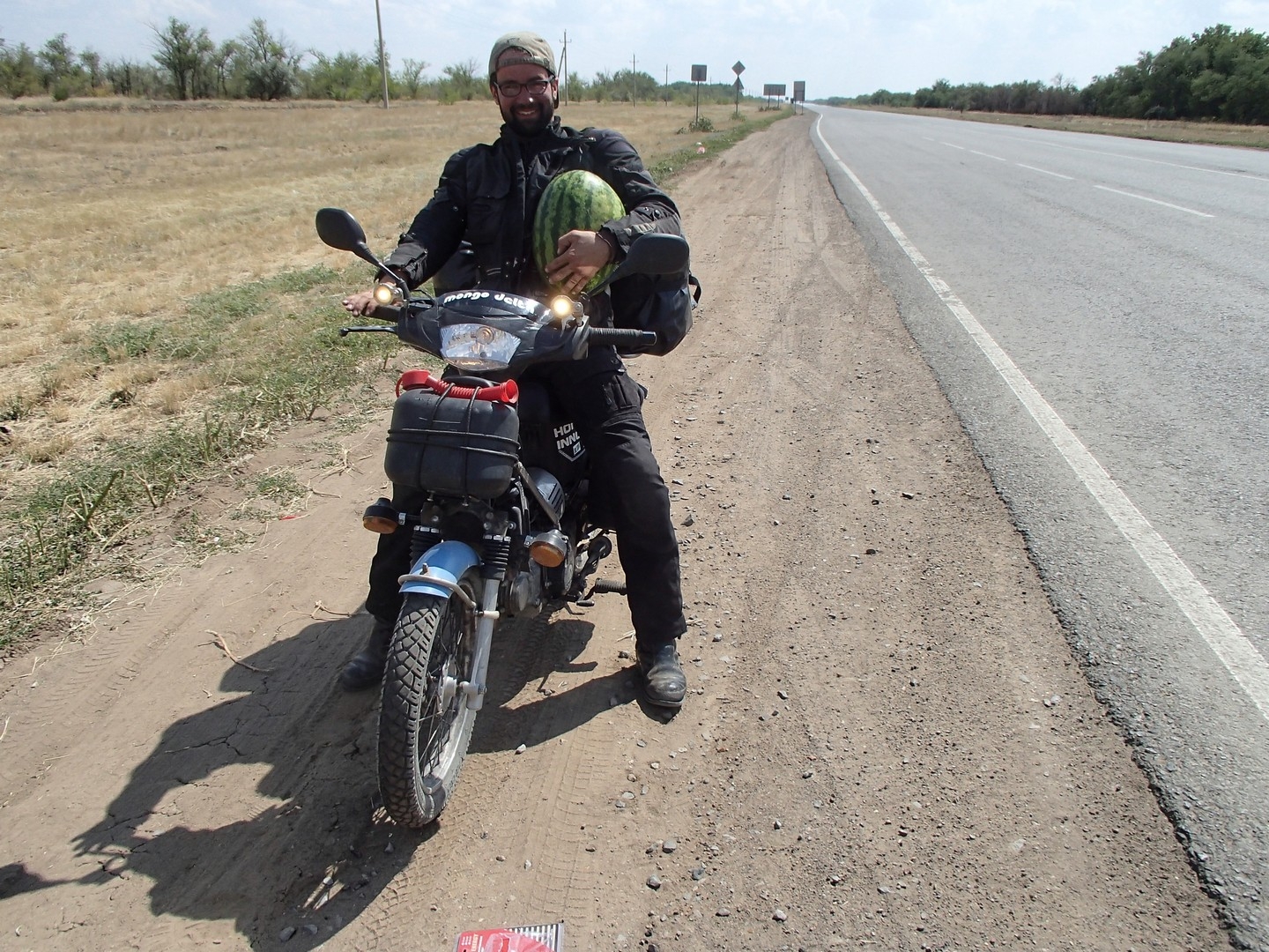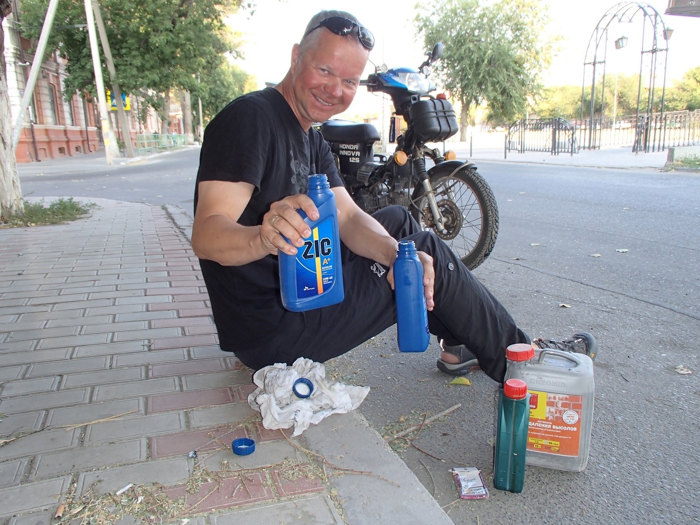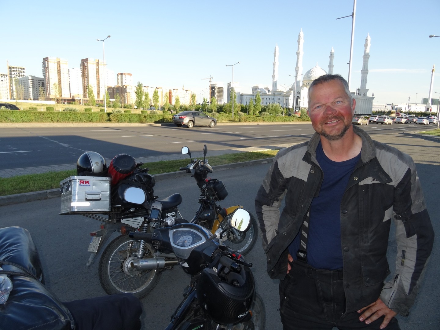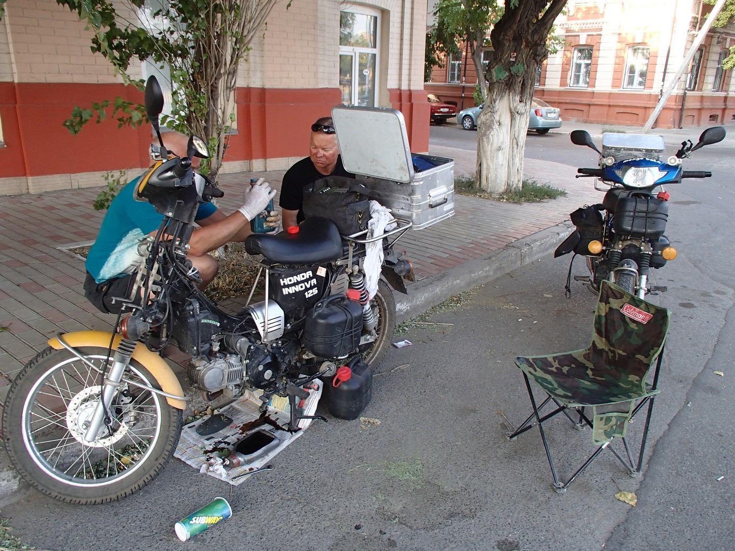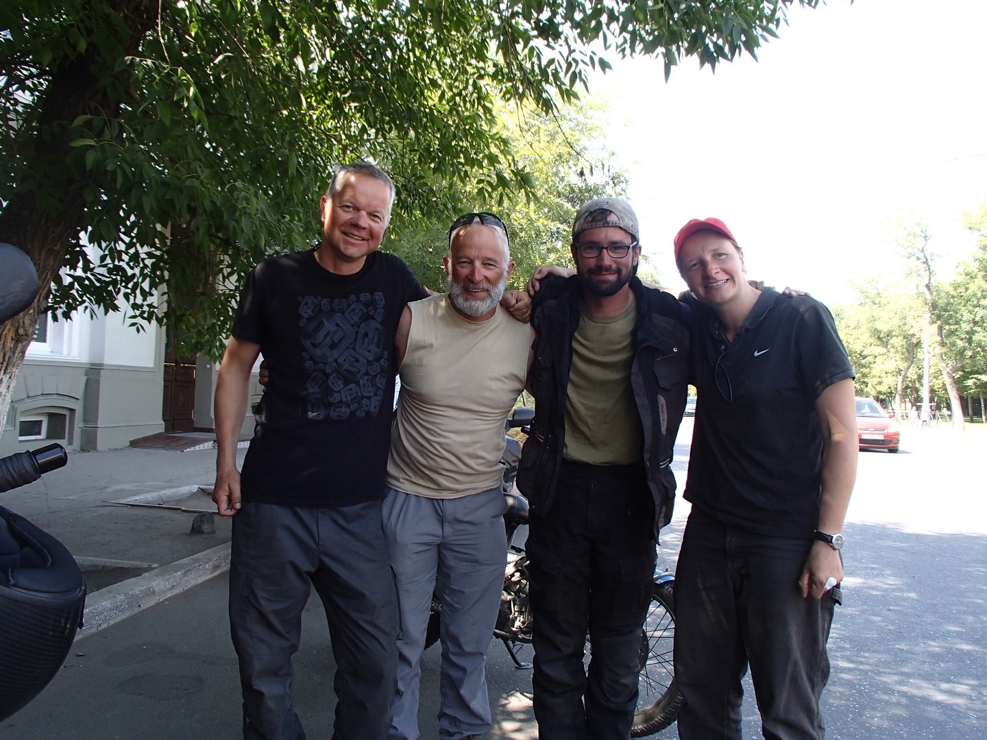 Martin war bereits in Uralsk, hatte sich dort ein Hotelzimmer genommen und war schon früh morgens beim dortigen Konsulat. Wenn alles dort nach Plan läuft sollte er am Nachmittag gegen 15 Uhr sein Visum abholen können. In der Zwischenzeit ließ er seinen Gepäckträger schweißen, der tiefe Fall bei fast voller Fahrt in ein ca. 1 Meter Durchmesser großes Schlagloch auf der kasachischen Straße hatte seine Spuren hinterlassen: