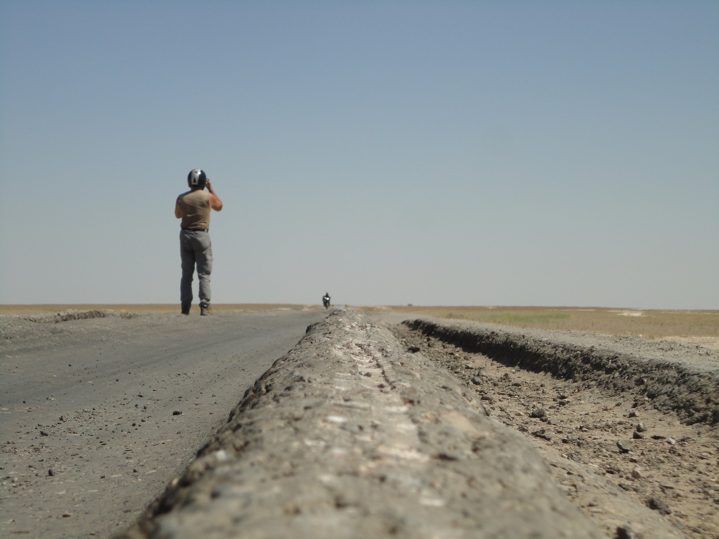 Ich bin bedient, mit sowas habe ich hier und jetzt nicht mehr gerechnet. Martin ist am Ende seiner Kraft und wir alle rudern im ersten oder zweiten Gang bei sengender Sonne durch den Tiefsand. Eine Tortour für Mensch und Material. Nach fast 3 Stunden kommen wir wieder auf schlechten Aspahlt und können ein paar Kilometer gut machen: