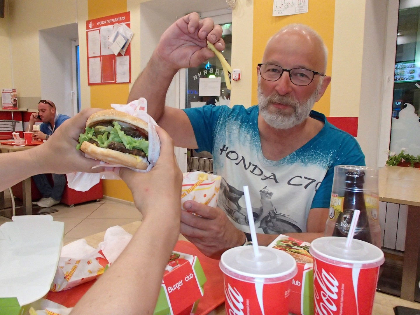 Nach ca. 100 Kilometer waren wir dann in Astrachan. Mitten in einer Großstadt, mit Janni im Schlepp und ohne Plan wo ein Hotel oder Mopedladen ist. Wir "strandeten" zufällig vor der Technischen Universität dort und hielten an der Hauptstraße um erstmal ein paar klare Gedanken zu fassen. Da wir den ganzen Tag noch nichts gegessen hatten und man mit leerem Magen nicht denken kann gingen wir ins dortige Subway zum Sandwich essen. Es war klimatisiert und hatte free-WiFi und so konnten wir die ersten Hilferufe ins Forum stellen.