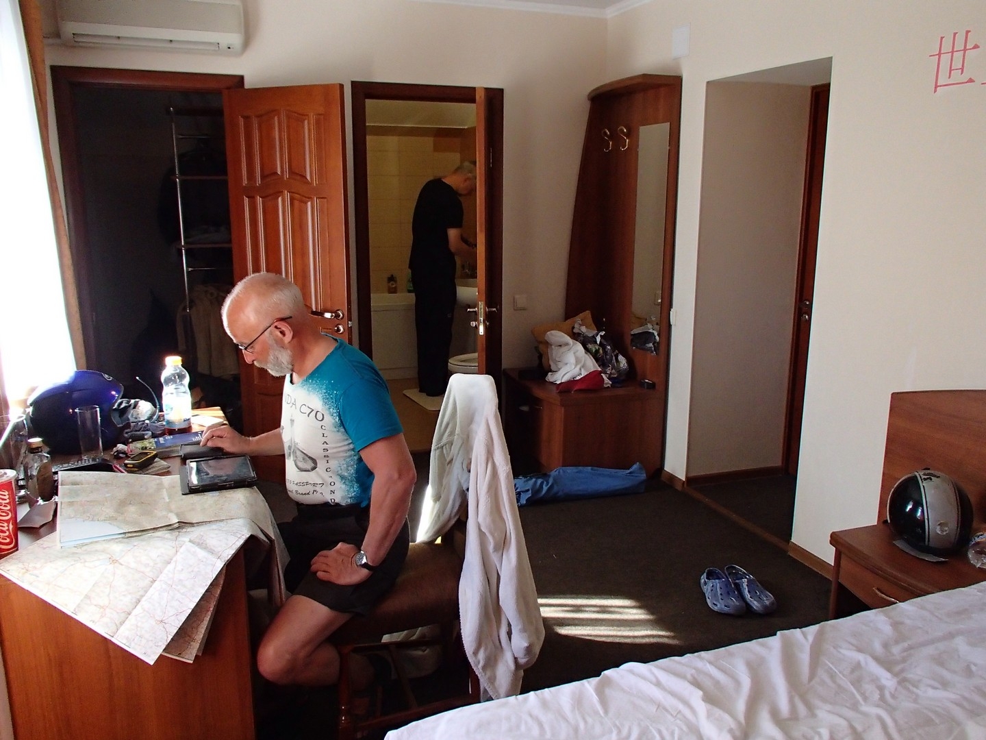 Zum Glück waren wir stets mit ihm in Kontakt und konnten ihm so auch weitere Infos zukommen lassen. Sobald er sein Visum hätte startet er sofort durch Richtung Astrakhan. Wir freuten uns riesig und konnten im Moment nicht mehr machen als ihm die Daumen zu drücken. Für uns hieß es dann den Tag über wieder warten, wir konnten endlich mal unsere Wäsche waschen und mal wieder die Mails checken. Ein Blick in unser Hotelzimmer, für das Foto haben wir extra aufgeräumt! :lol: