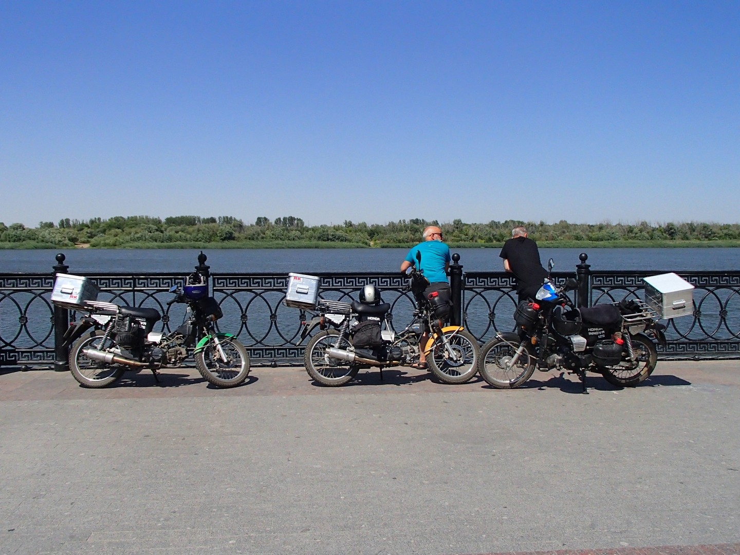 Fußläufig hatten wir die Gegend ja schon erkundet, damit wir aber das Fahren nicht verlernen und die frisch inspizierten Mongos auch ausgeführt werden wollten machten wir mal eine kleine Stadtrundfahrt. Bei 33 Grad und strahlend blauem Himmel musste keiner von uns lange überredet werden. Nach kurzer Fahrt kamen wir an einen großen Fluß. Nach kurzem überlegen waren wir uns einig: ja stimmt, das muss die Wolga sein :mrgreen: Zeit für ein paar Fotos: